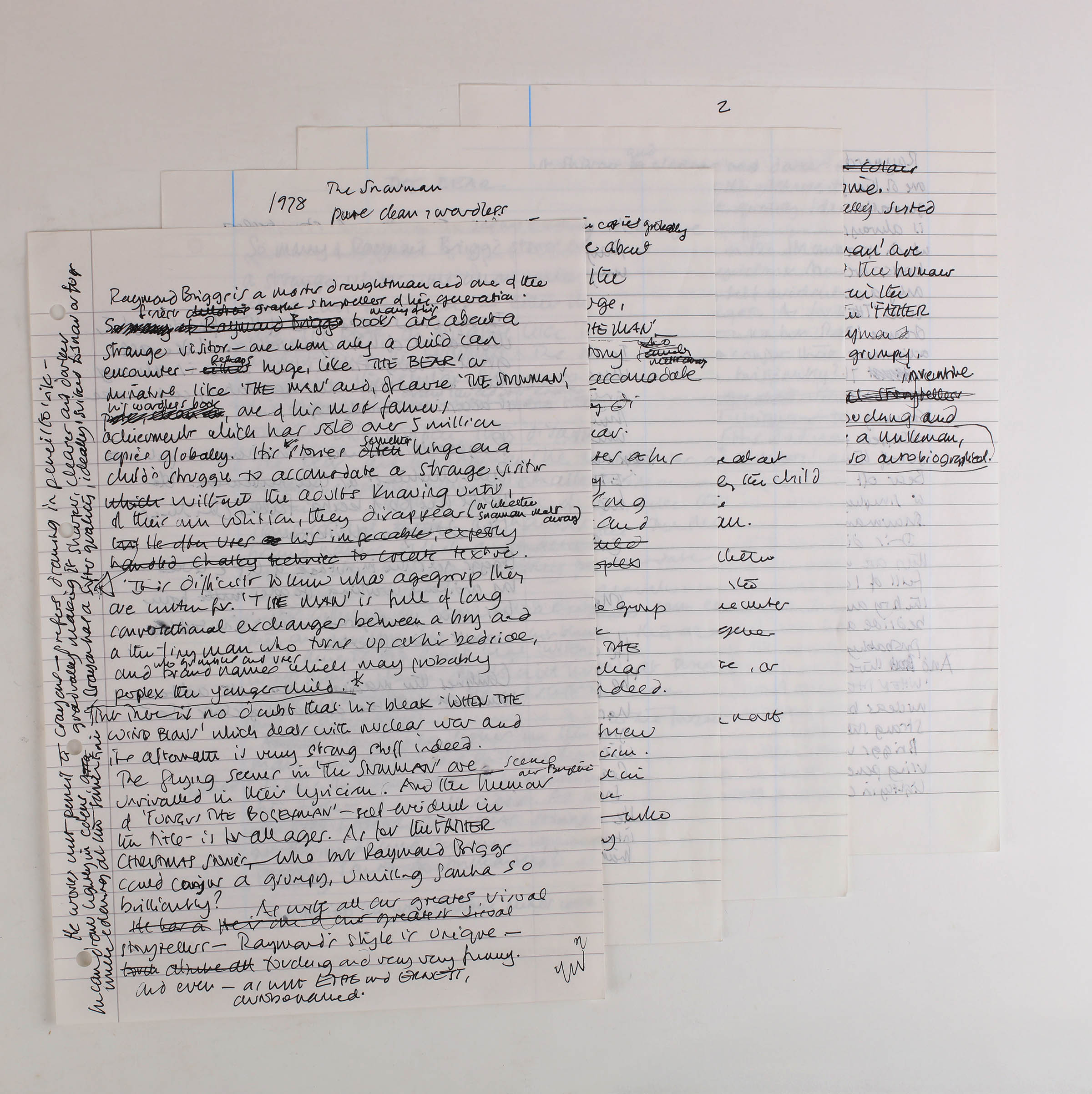 Hughes's manuscript piece on Briggs, in which she shows a tremendous respect for his work, appears to be unpublished and is possibly for a short speech in connection with the 2018 Snowman exhibition, where a number of prominent illustrators including Hughes and Quentin Blake, created their own versions of The Snowman. "Raymond Briggs is a master draughtsman," she writes, "one of the finest graphic storytellers of his generation."