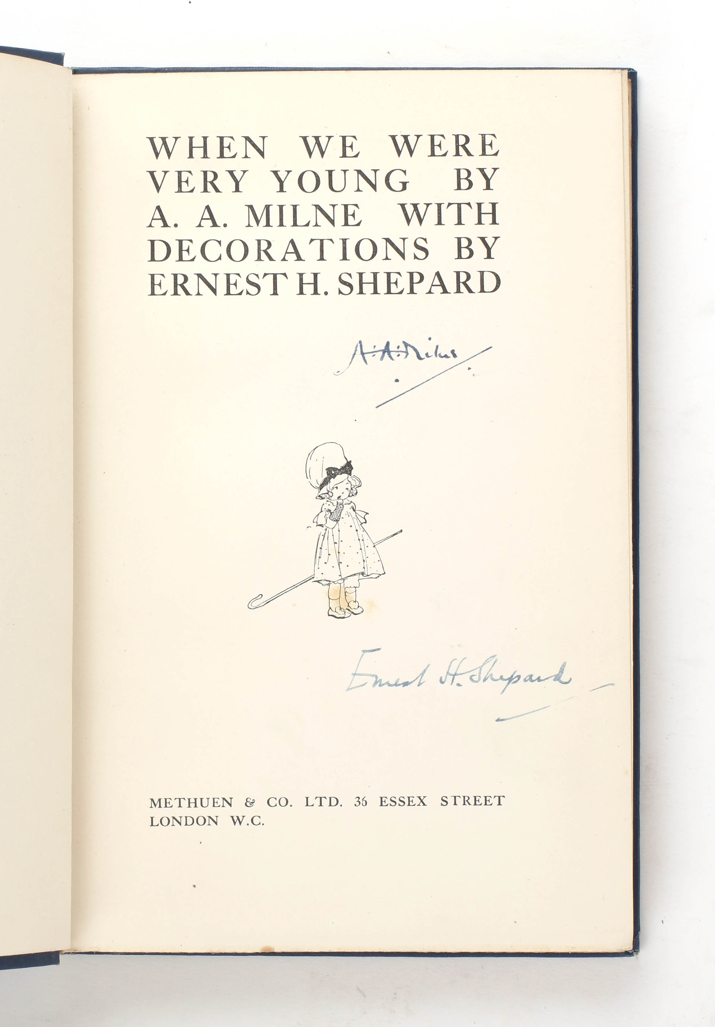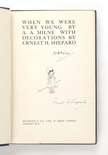 First edition, first issue with plain endpapers. Signed by both A.A. Milne and E.H. Shepard to the title page. 8vo. Original blue cloth with gilt lettering and gilt vignettes to upper cover, top edge gilt. Pictorial endpapers. The collection of verses is illustrated throughout by E.H. Shepard. A near fine copy, with a small nick to the left side of the spine. Previous owner's bookplate on the front pastedown.