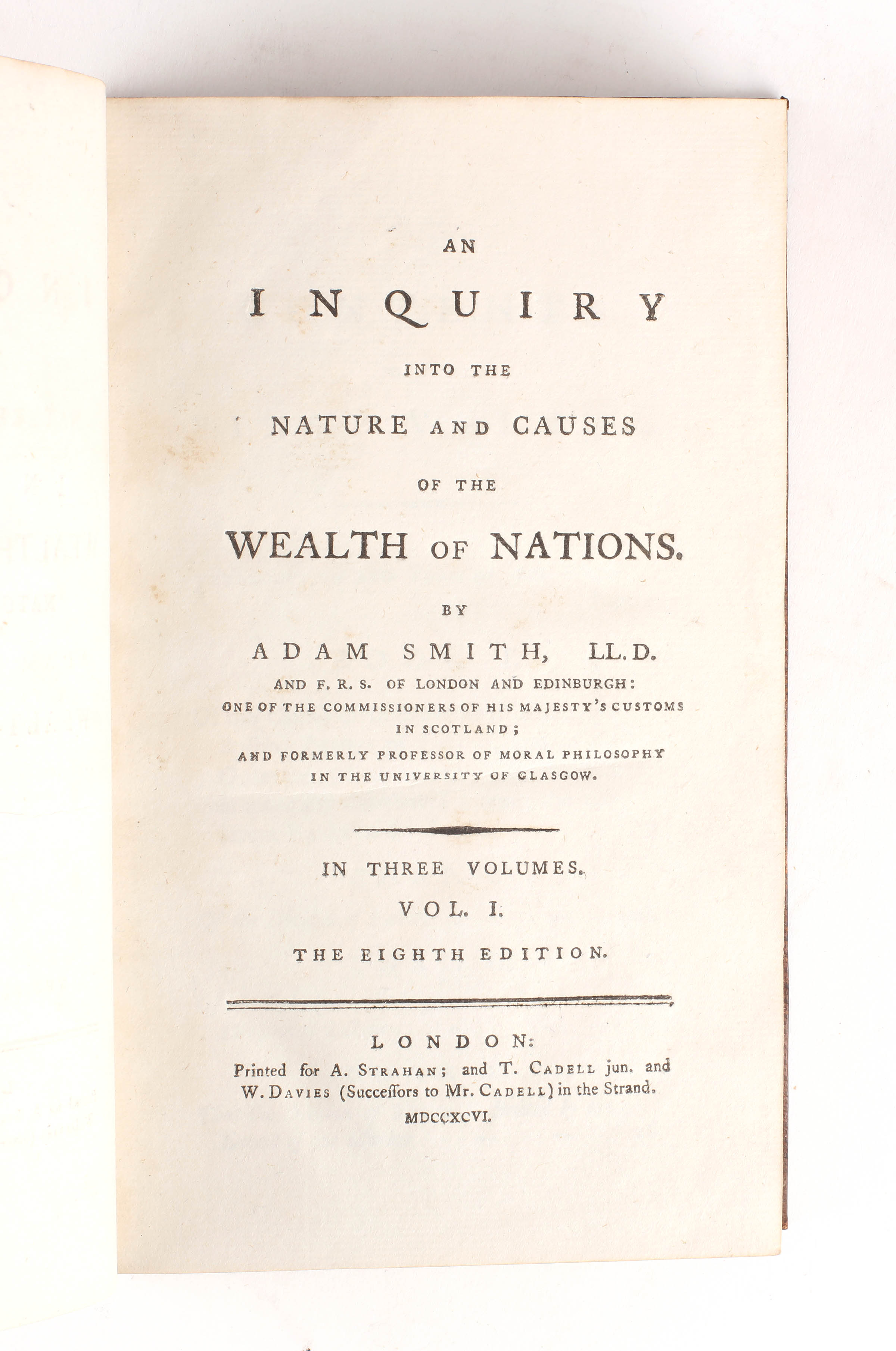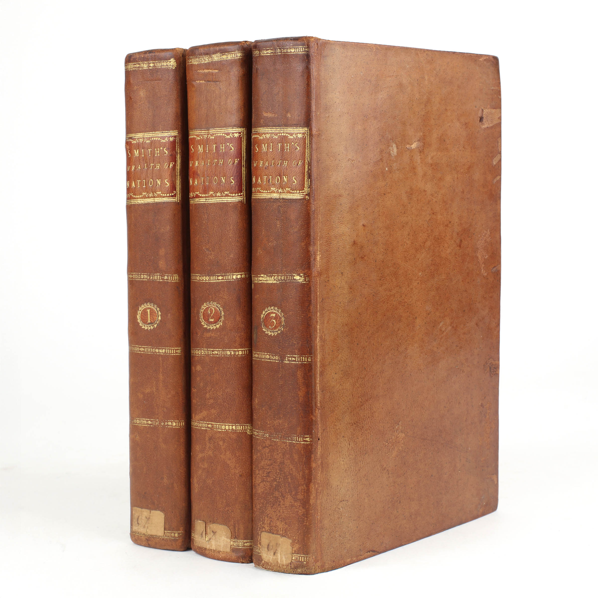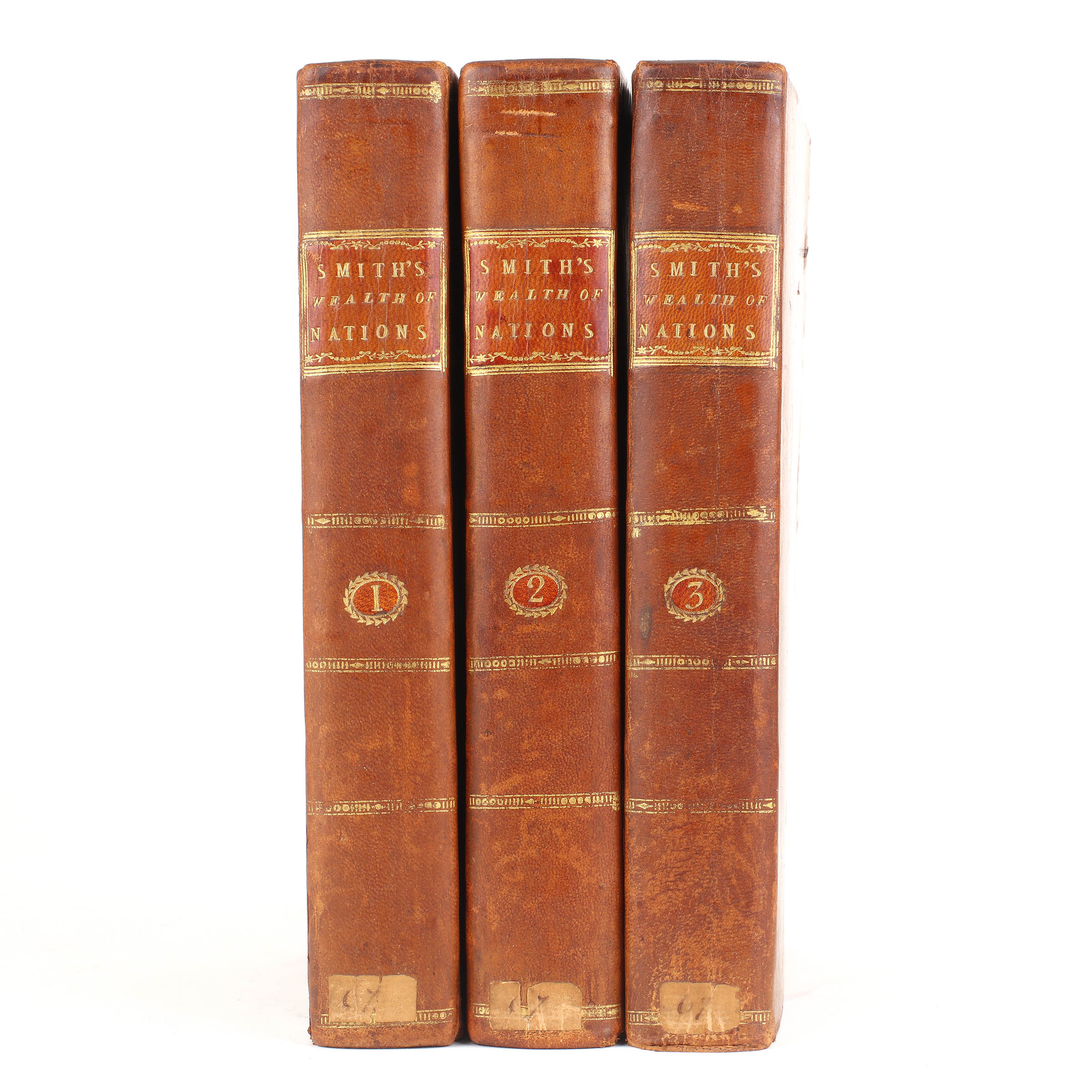 Critically regarded as the founding work of modern economic thought, Adam Smith (1723-1790) began writing his magnum opus in Toulouse in 1763 spending the next decade in perfecting it. The first edition was published in two octavo volumes in 1776, changing format to a more manageable three octavo volumes with the third edition of 1784. In all there were nine eighteenth century editions, all of which are now uncommon in nice contemporary condition.