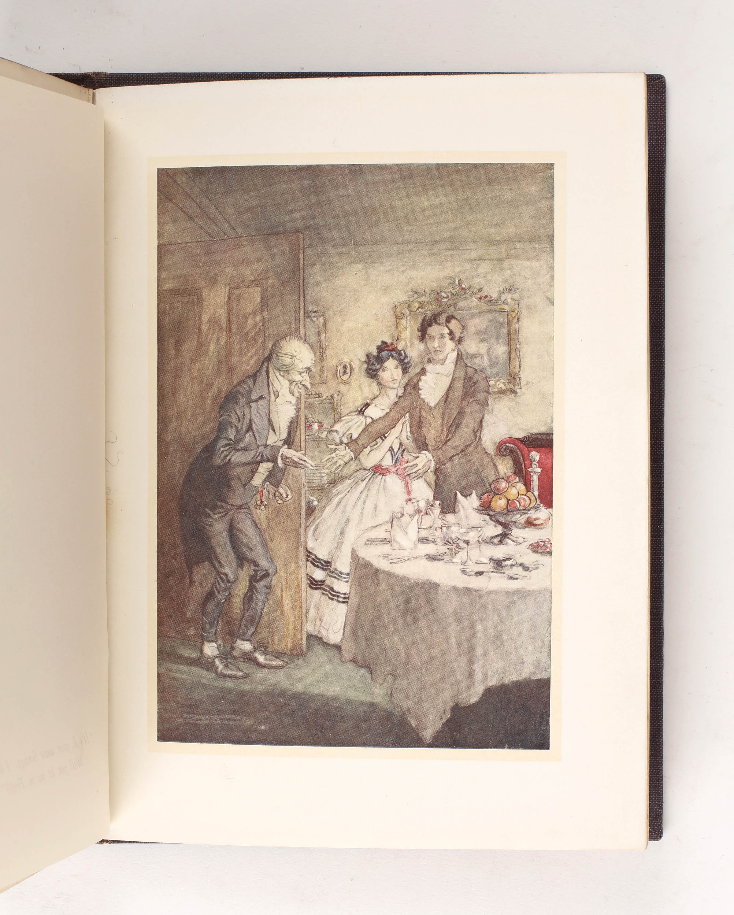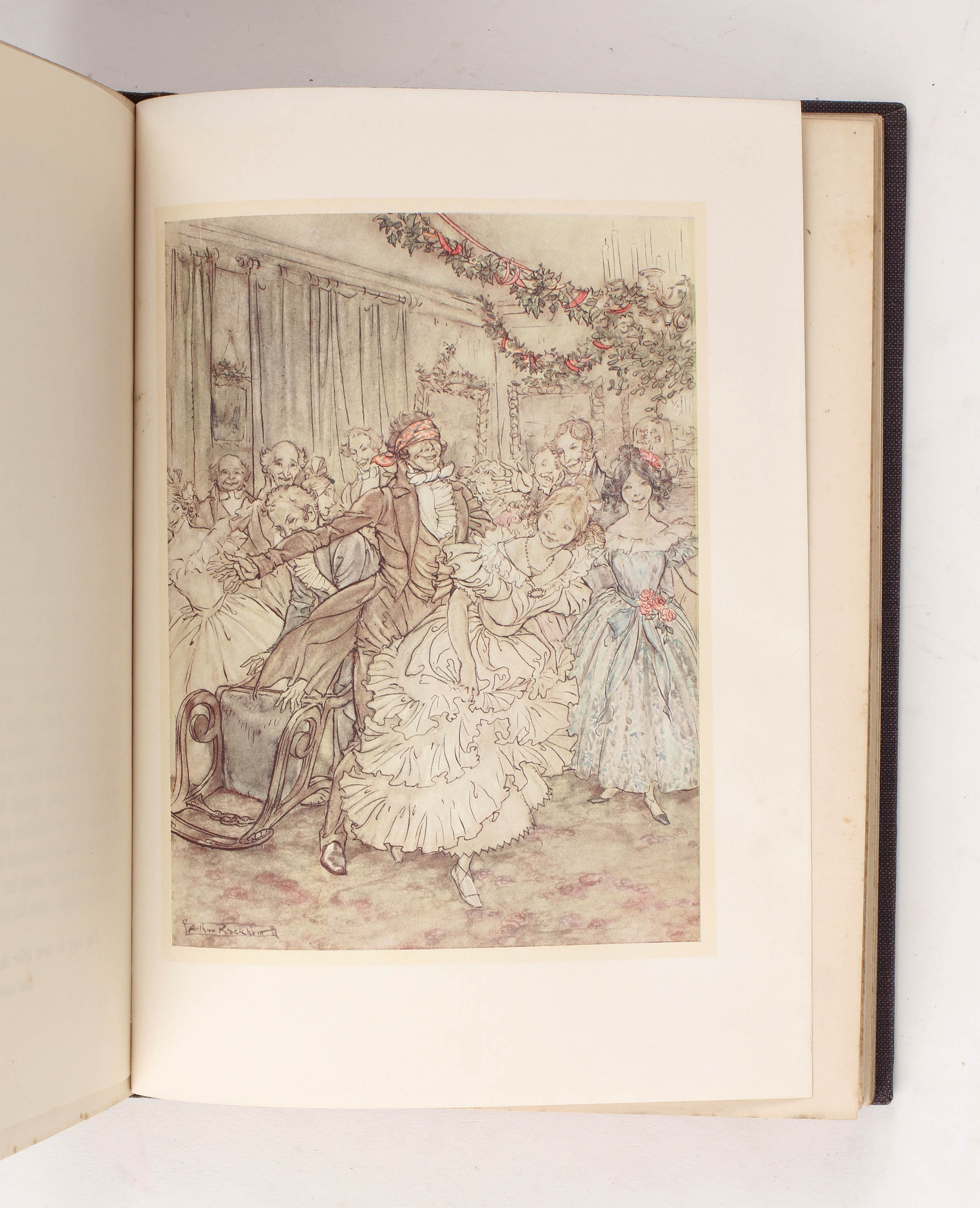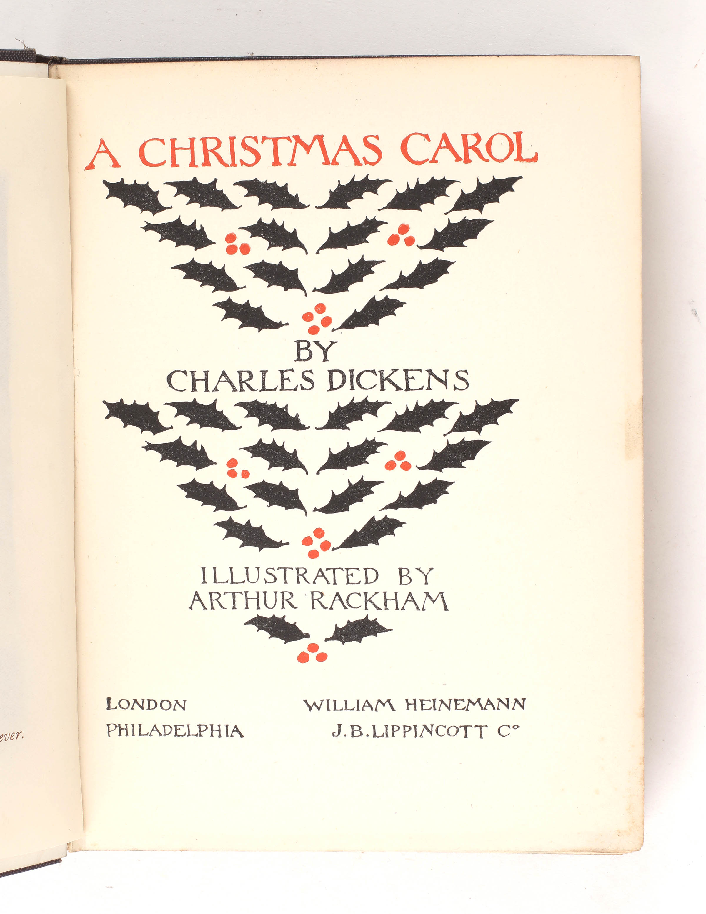 Rackham's illustrations for A Christmas Carol were "decidedly successful, for he contrived to adapt the tradition of 'Phiz' and Cruikshank to his own characteristic style in the pictures of Victorian London and at the same time found scope for his fantasy in the ghost scenes. We also find him here developing his special talent for silhouette, rare among illustrators" [Hudson, p106]. The 1915 Bookman review described this as "a beautiful and ideal edition of the ideal Christmas story"