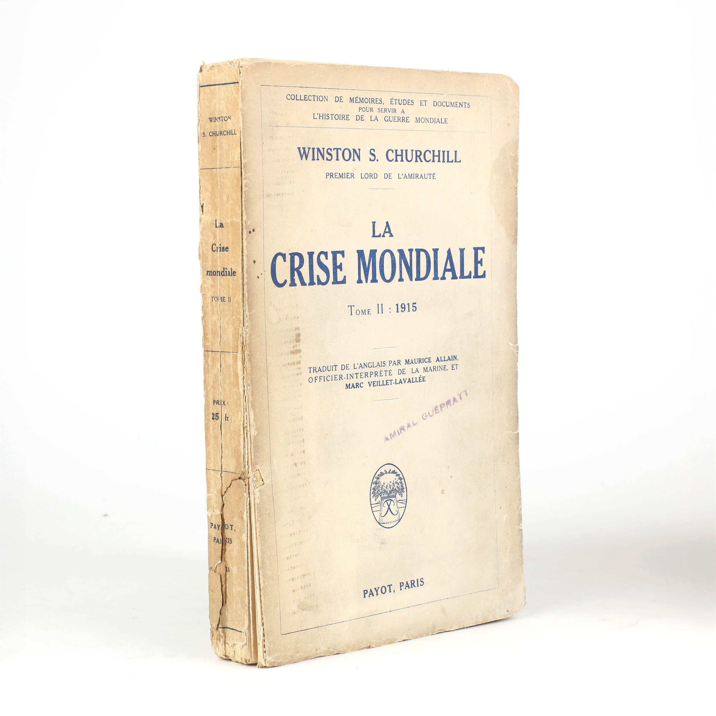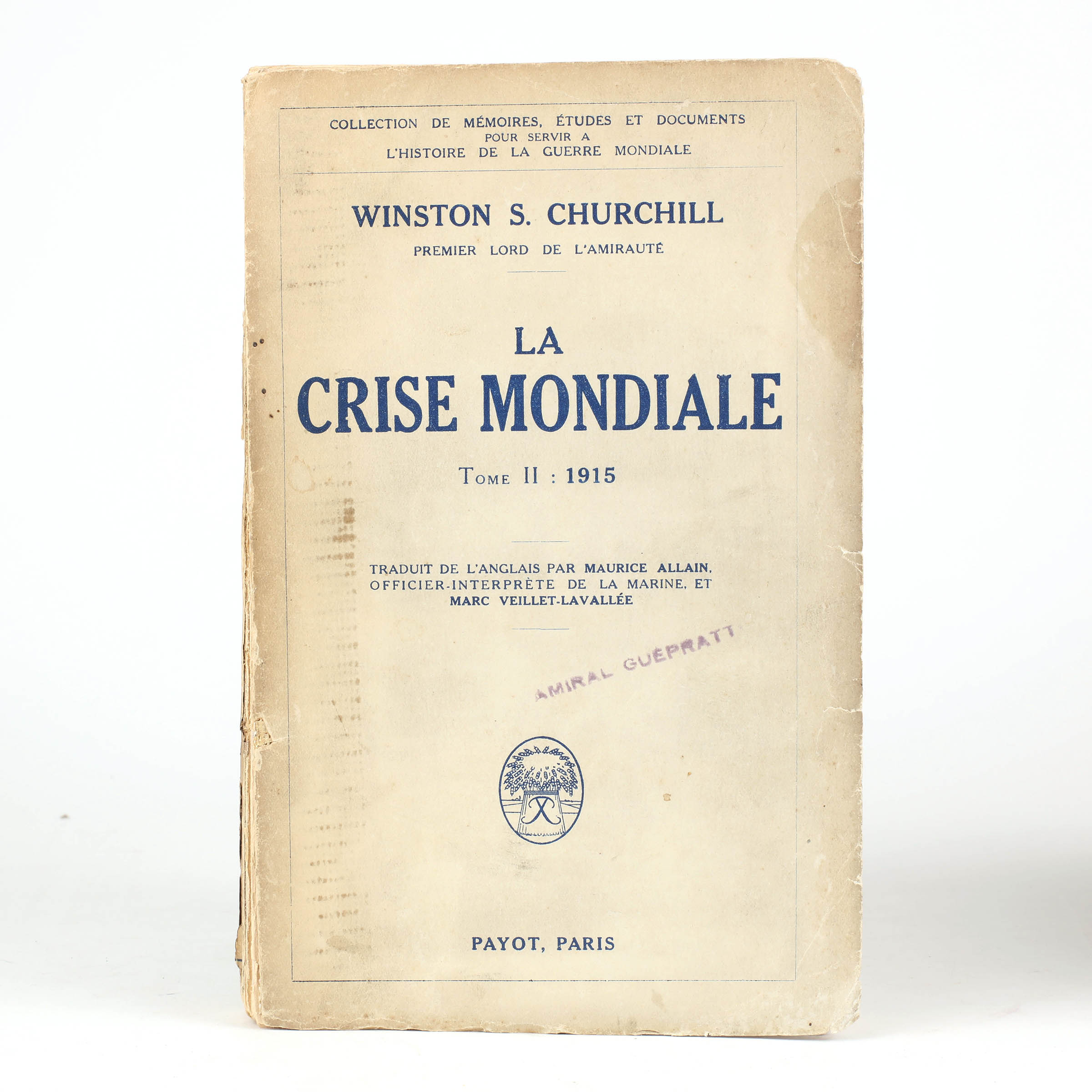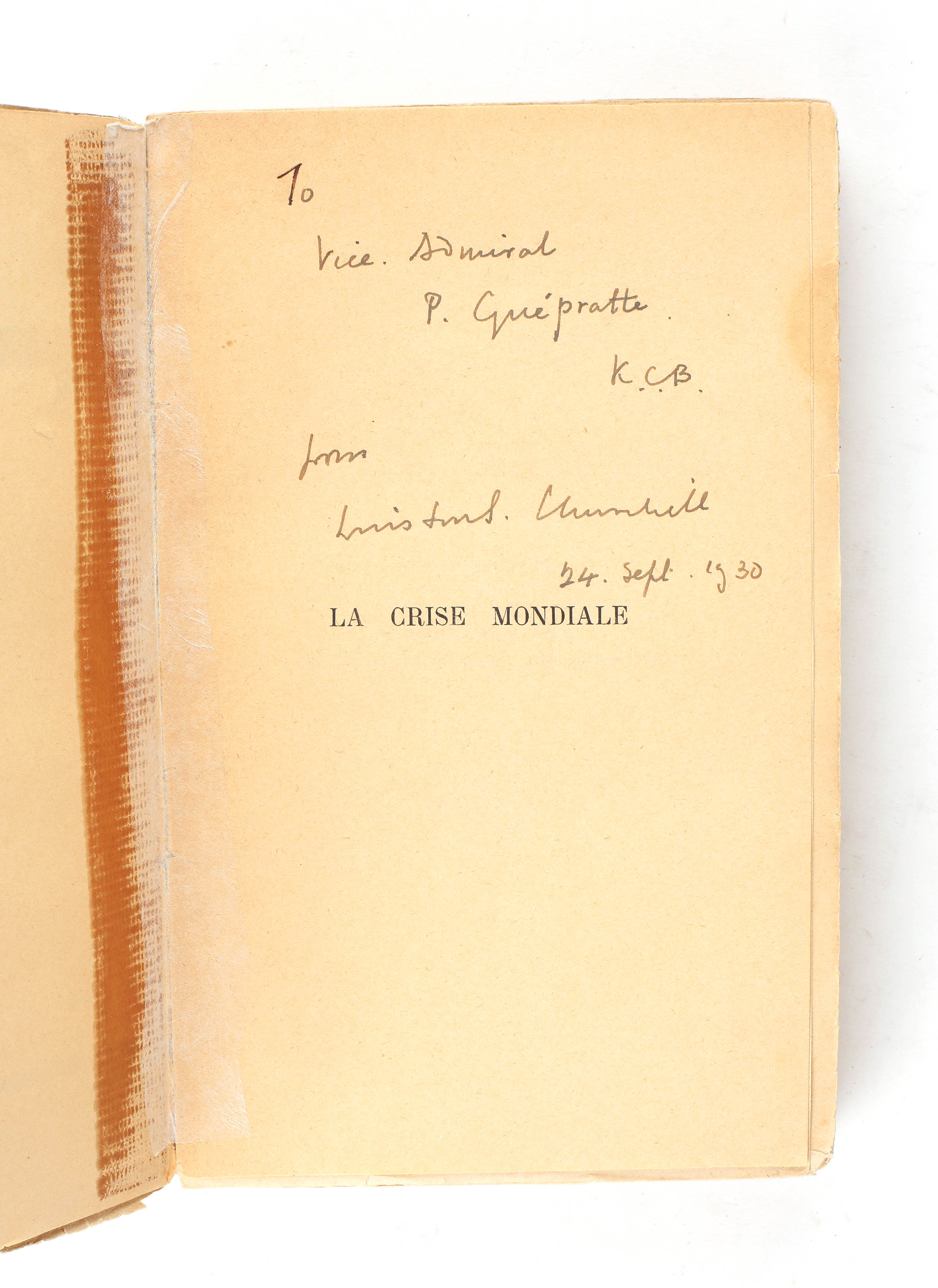 First French edition of the second part of The World Crisis. Original paper wrappers, printed in blue. Author's presentation copy, inscribed to the half-title, "To Vice Admiral P. Guépratte K.C.B. from Winston S. Churchill 24 Sept. 1930". Hinges reinforced with tape and spine worn with splits to the base, a good only copy.