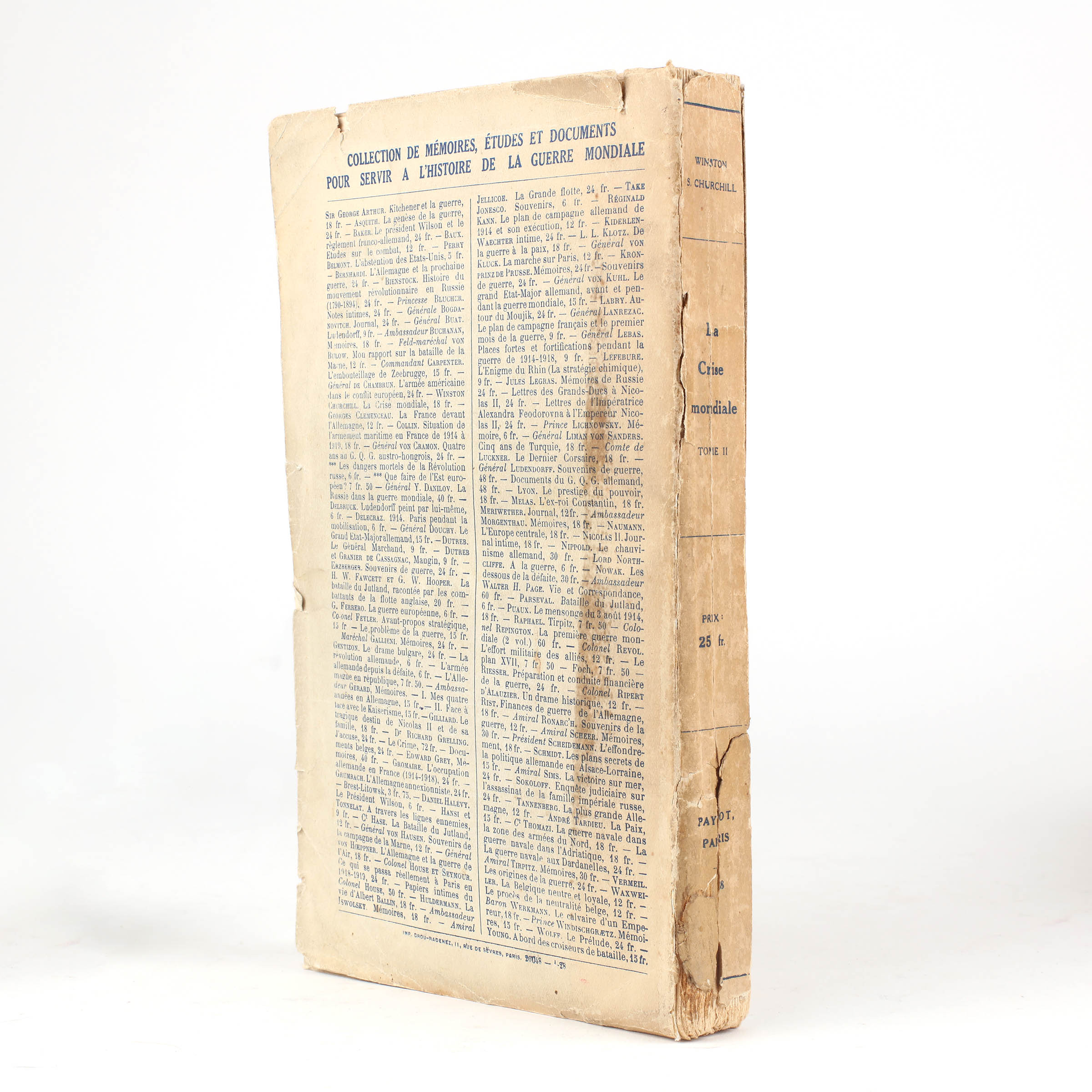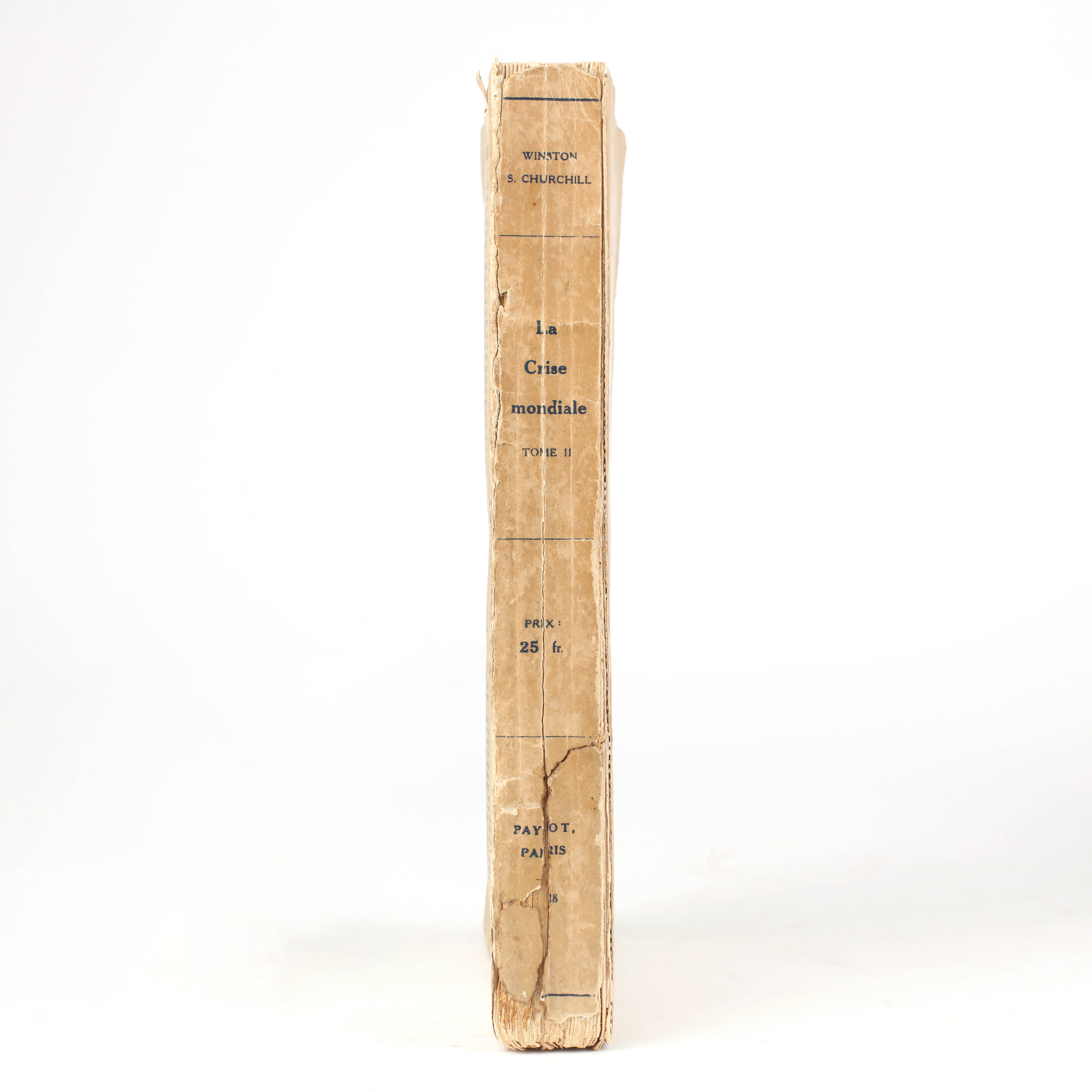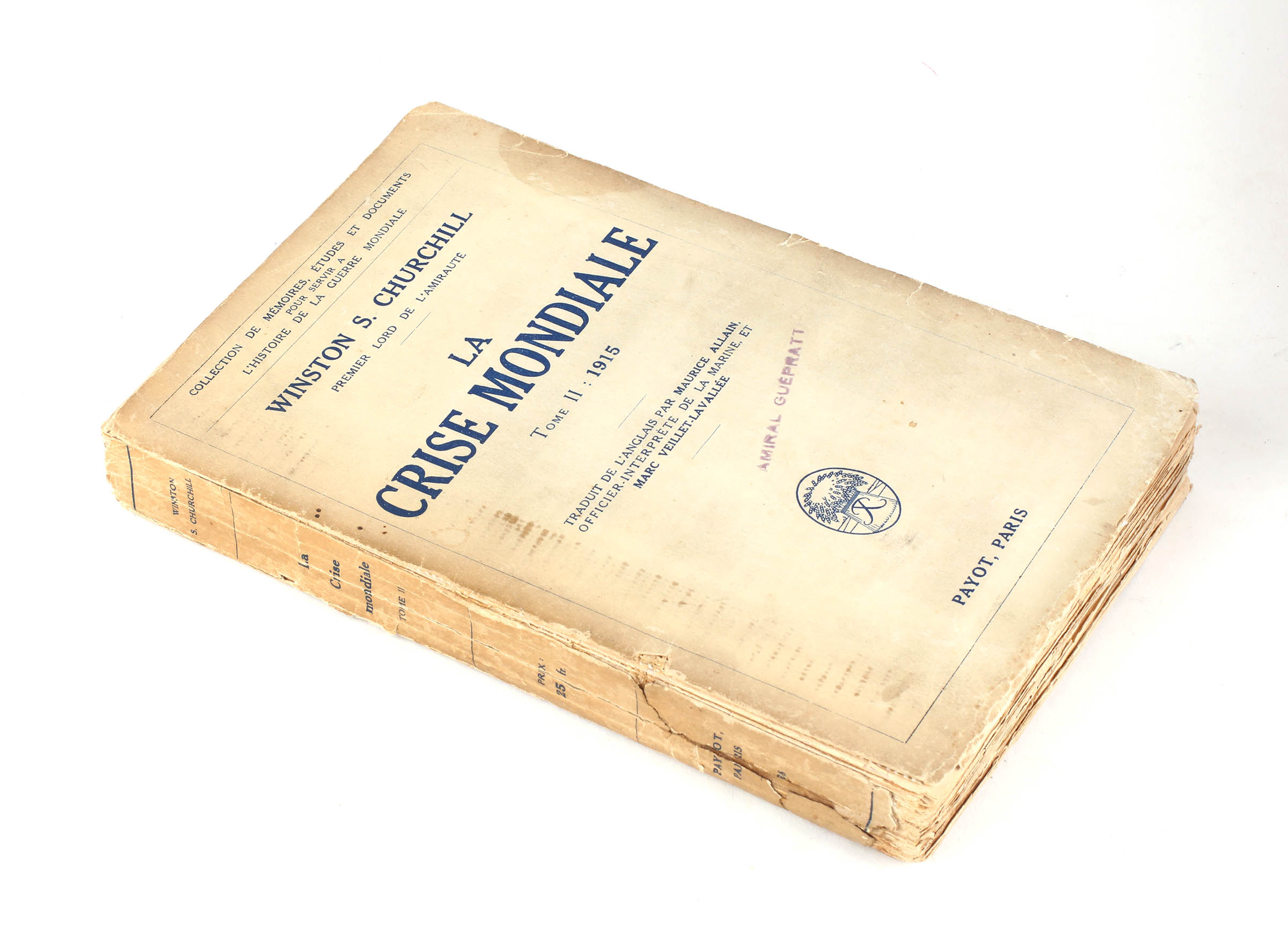 First French edition of the second part of The World Crisis. Original paper wrappers, printed in blue. Author's presentation copy, inscribed to the half-title, "To Vice Admiral P. Guépratte K.C.B. from Winston S. Churchill 24 Sept. 1930". Hinges reinforced with tape and spine worn with splits to the base, a good only copy.