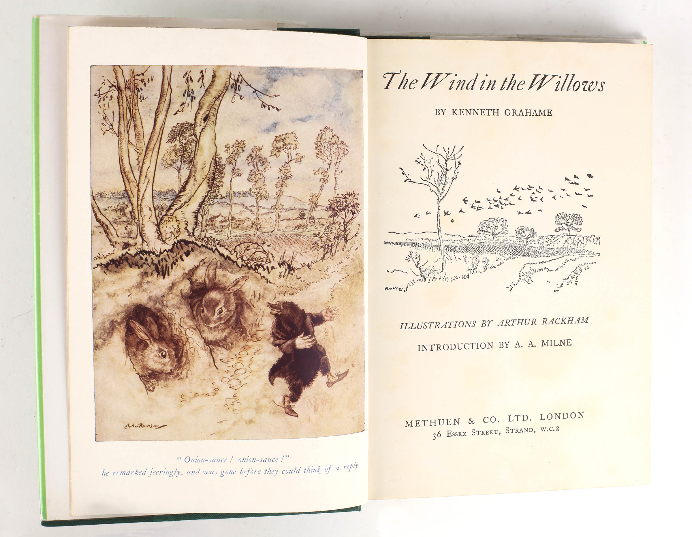 Fifth UK edition illustrated by Rackham. 8vo. Green cloth with gilt titles on the spine in the original pictorial dustwrapper. Introduction by A.A. Milne. Twelve colour plates and fifteen illustrations in line. A very good copy, ghosting of tape marks to the endpapers, in a very good dustwrapper