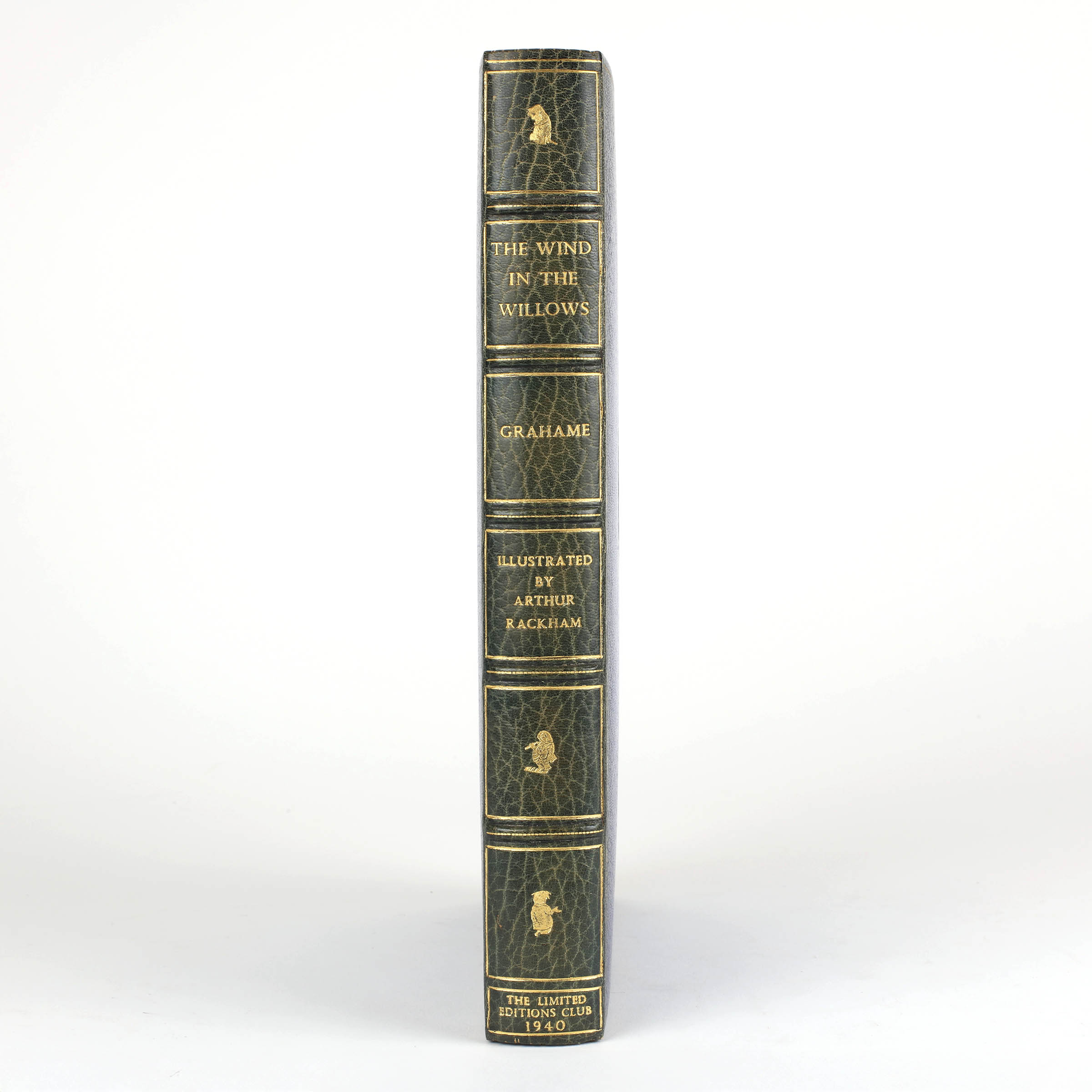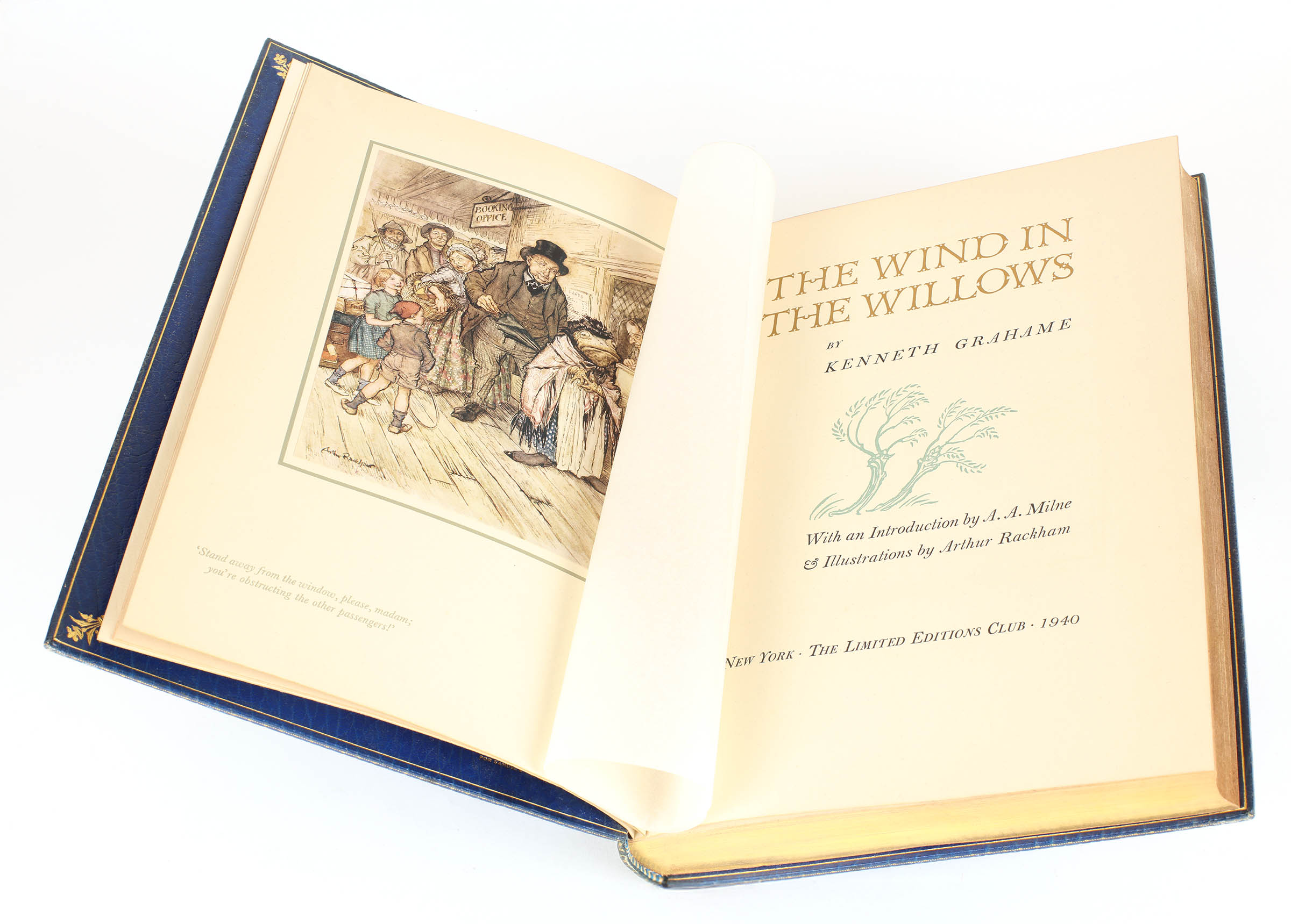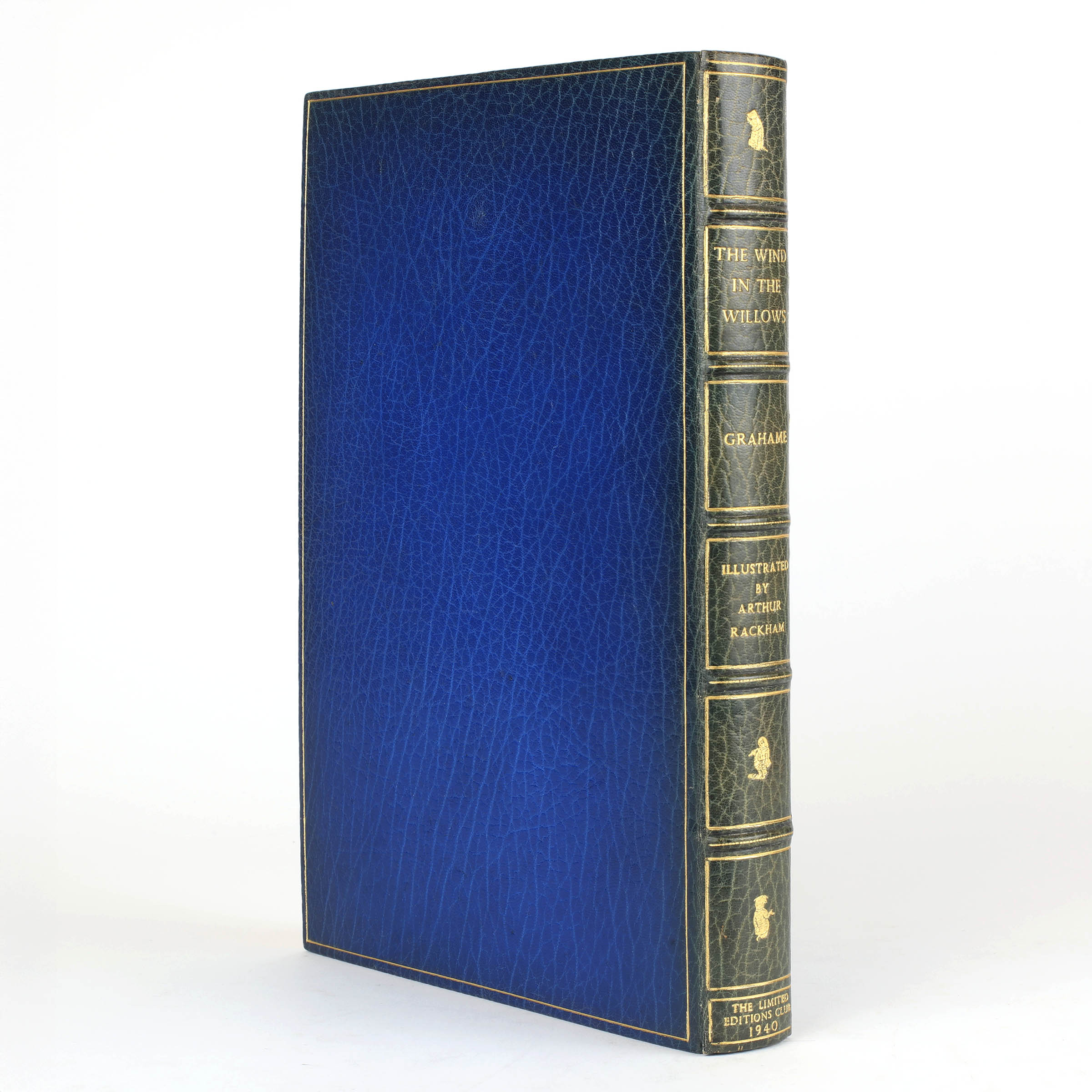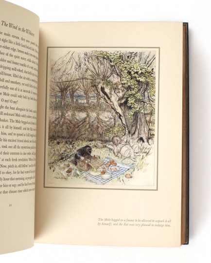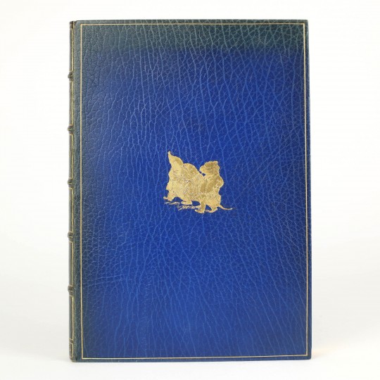 First edition illustrated by Rackham. Large 4to. Number 738 of 2,020 copies, signed by Bruce Rogers, the book's designer. Full navy morocco by Bayntun, raised bands and gilt vignettes to the spine, gilt rules and vignette to upper cover. All edges gilt. Marbled endpapers, leather turn ins with gilt vignettes to corners. Sixteen colour illustrations by Rackham. Introduction by A. A. Milne. A near fine copy with a little toning to the spine. A handsome copy of this children's classic in a sumptuous binding.