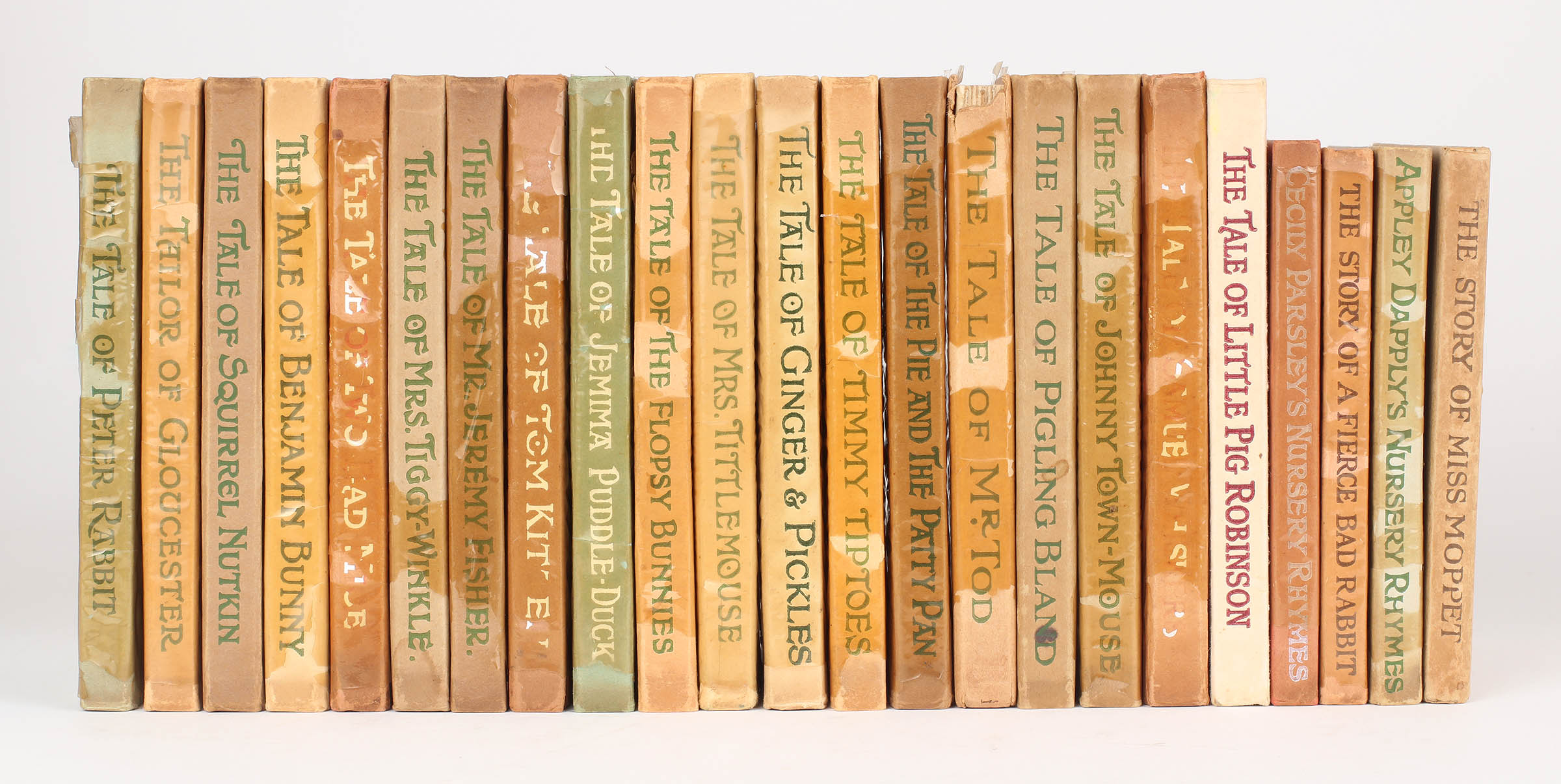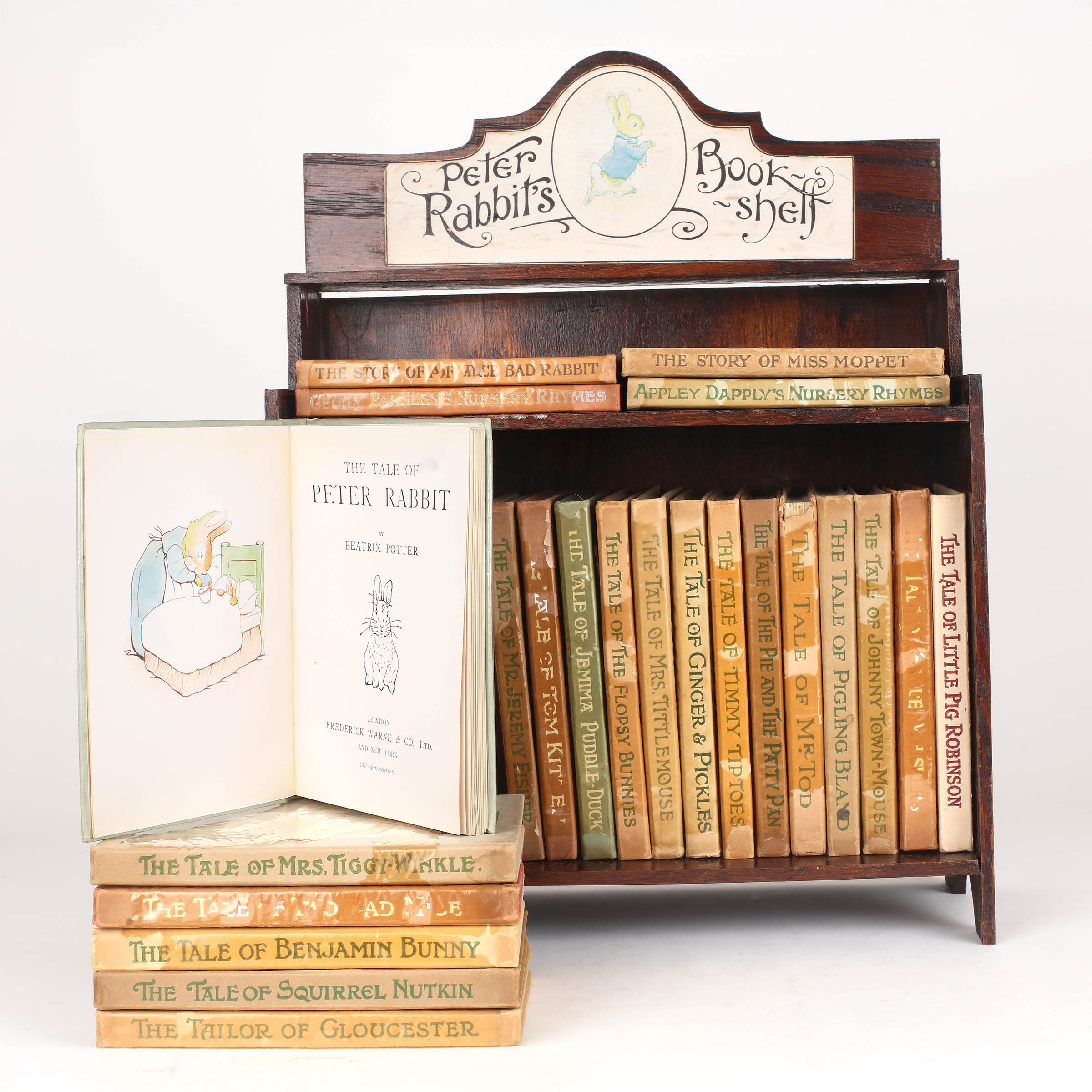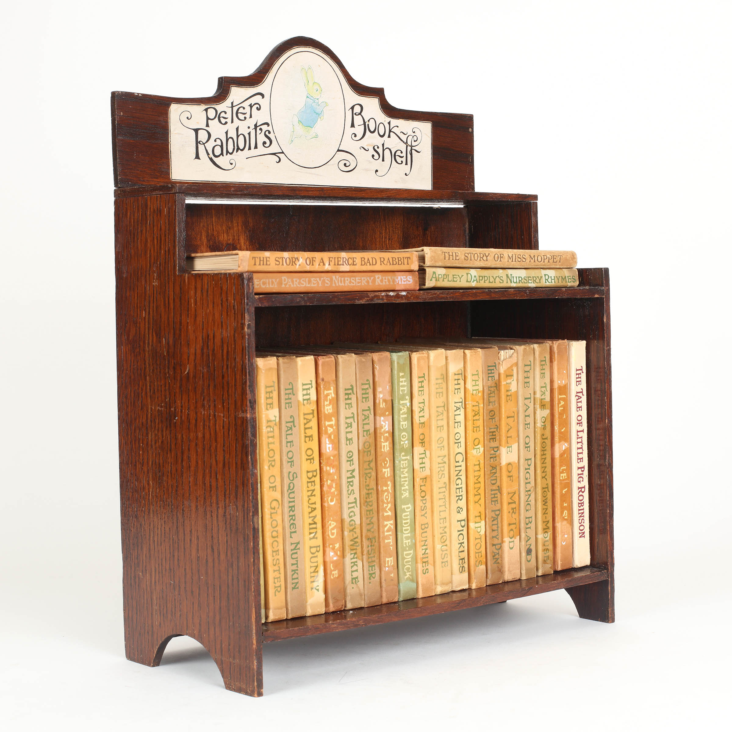 Dark oak bookcase with hinged folding top section and paste on illustrated label. Containing all twenty three of the tales of Beatrix Potter, all contemporary with the bookshelf. The books are generally in near fine condition, most retaining the remains of their original unprinted glassine wrappers. 'The Tale of Mr Tod' has a chip to the spine, and the three books with enamel lettering show some flaking. Nearly all the books contain a neat gift inscription dated as 1934. The bookshelf itself is in excellent condition.