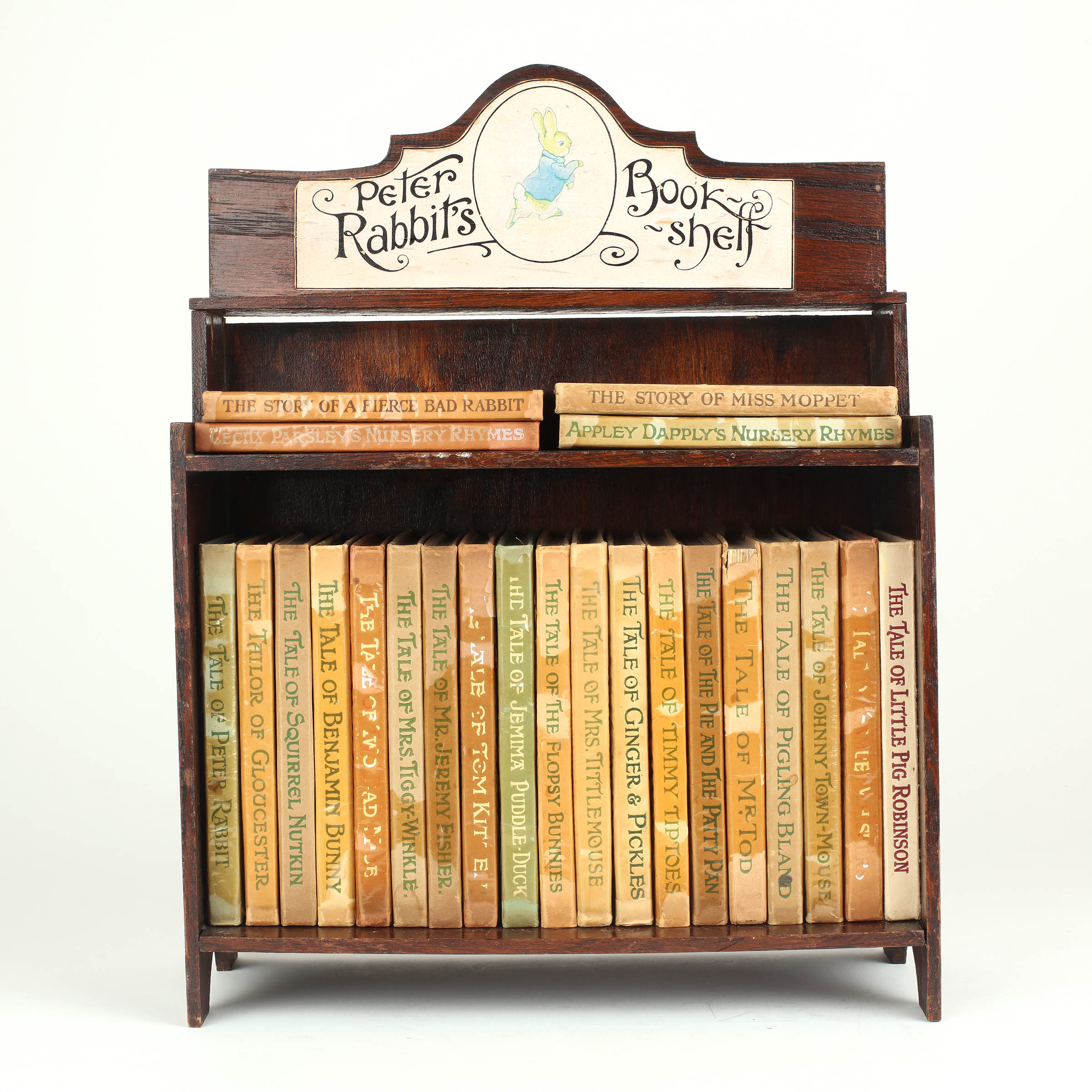 A rare example of the earliest of the 'Peter Rabbit Bookshelves', which appear in adverts from around 1934, initially only in this style and offered separately to the books. Later bookcases were made from pine or less expensive wood painted in pastel colours and did not have the fragile hinged top. Particularly notable is the fact that the books accompanying this bookshelf are strictly contemporaneous with the bookshelf and are likely to be the original set bought to fill it.