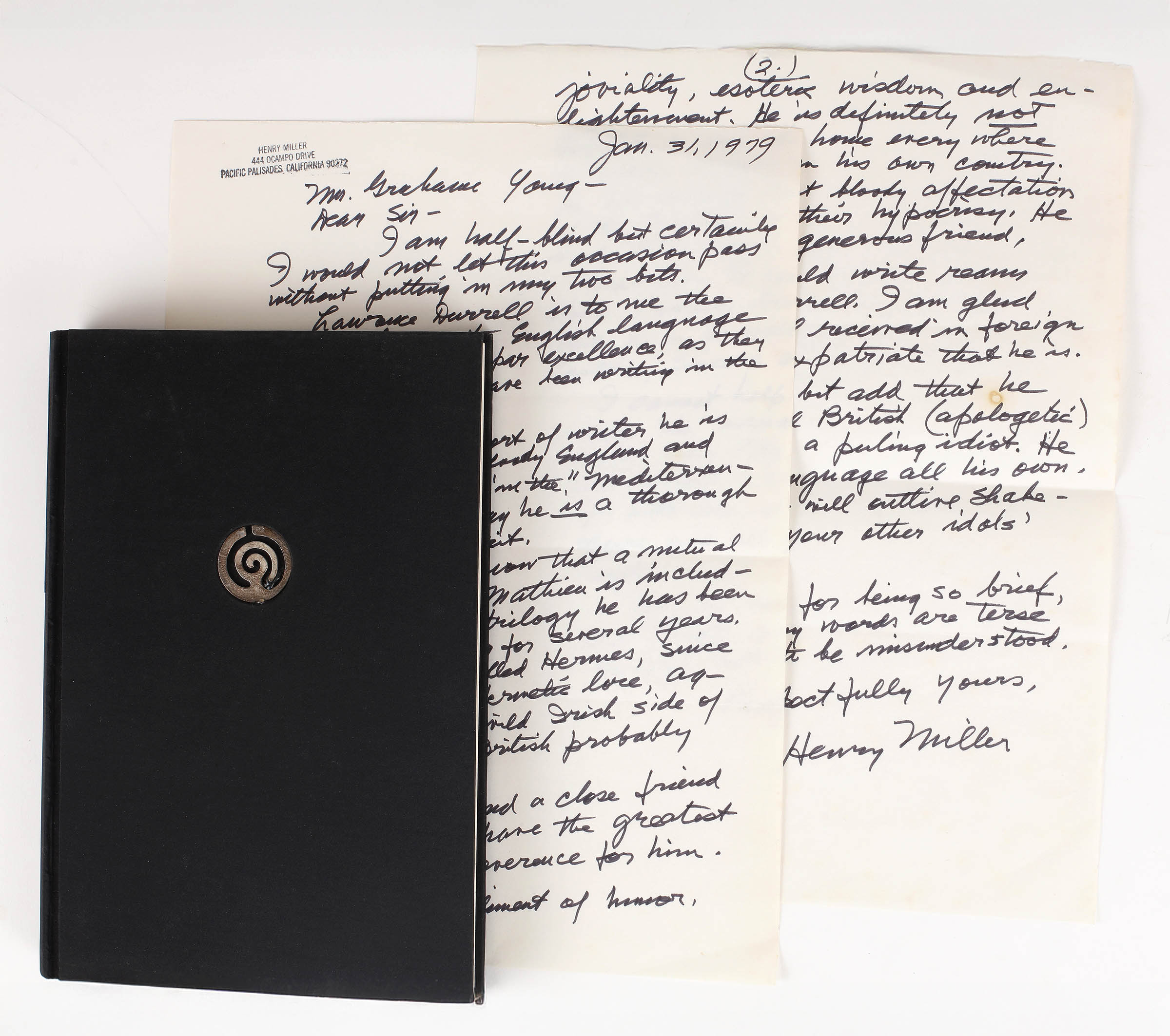 Sole edition. One of apparently six copies bound for presentation in black silk boards with an inlaid silver motif. The editors own copy, with which is included the two page holograph manuscript of the letter with Henry Miller's contribution to the journal on Lawrence Durrell. A fine copy with original tissue glassine. Miller's manuscript on two pages of letter paper, his address rubber-stamped on the first, with a central crease.