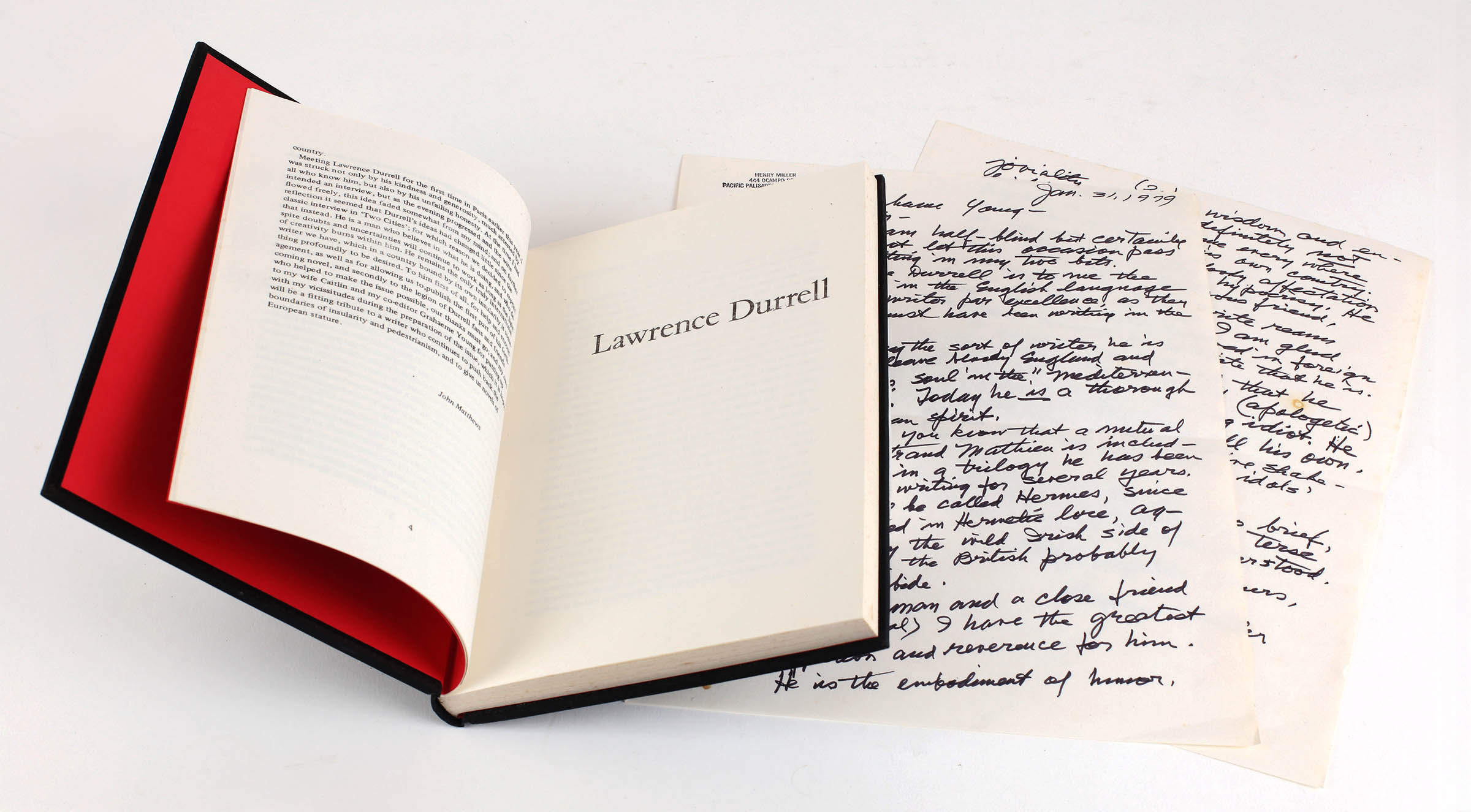 This copy, one of a handful of casebound copies, was retained by Young and contains the manuscript of a short piece that Henry Miller wrote about Durrell, in his characteristically provocative way,