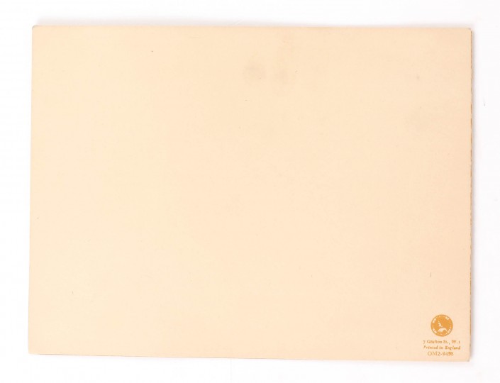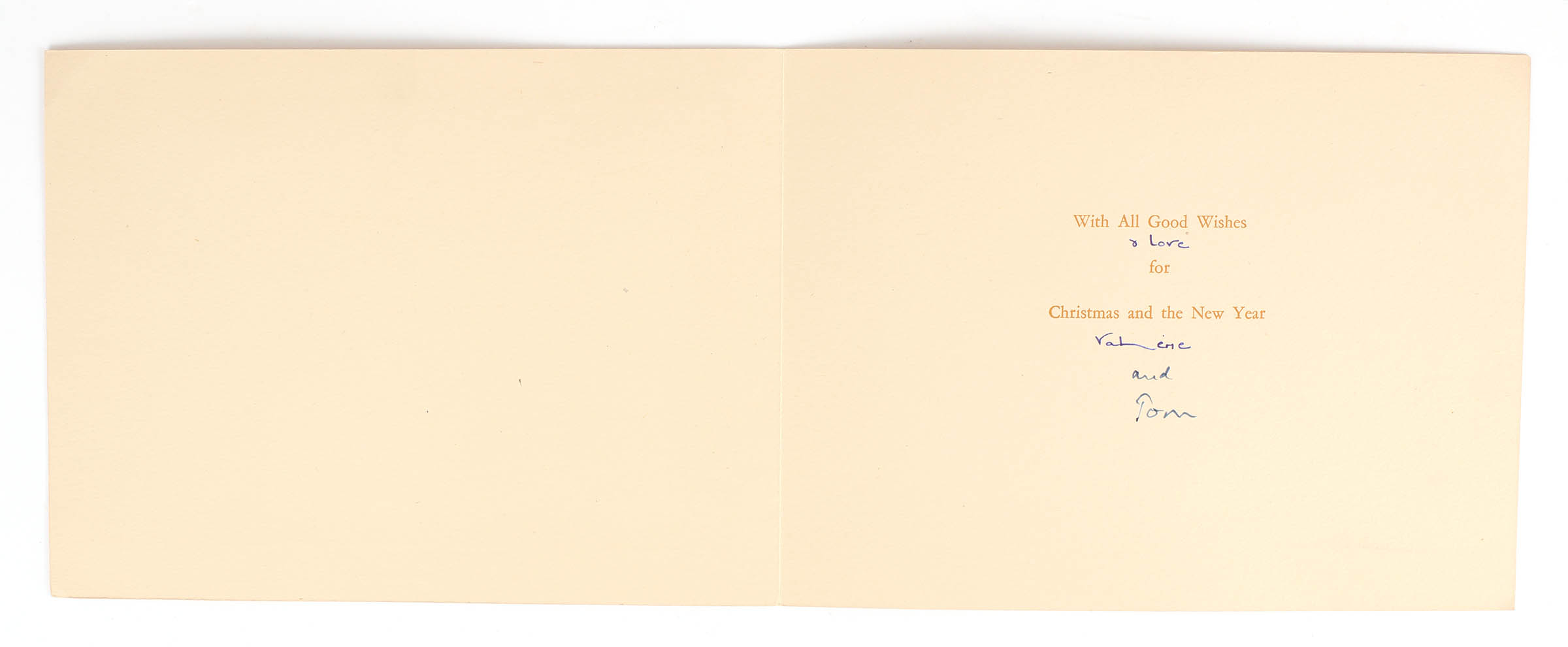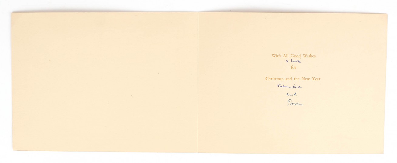A single folded Christmas card, 152x202mm. "The Procession of the Kings" illustration to cover. Inscribed in ink by Valerie Eliot, "& love Valerie", and further inscribed "and Tom" by T.S. Eliot. Fine condition.