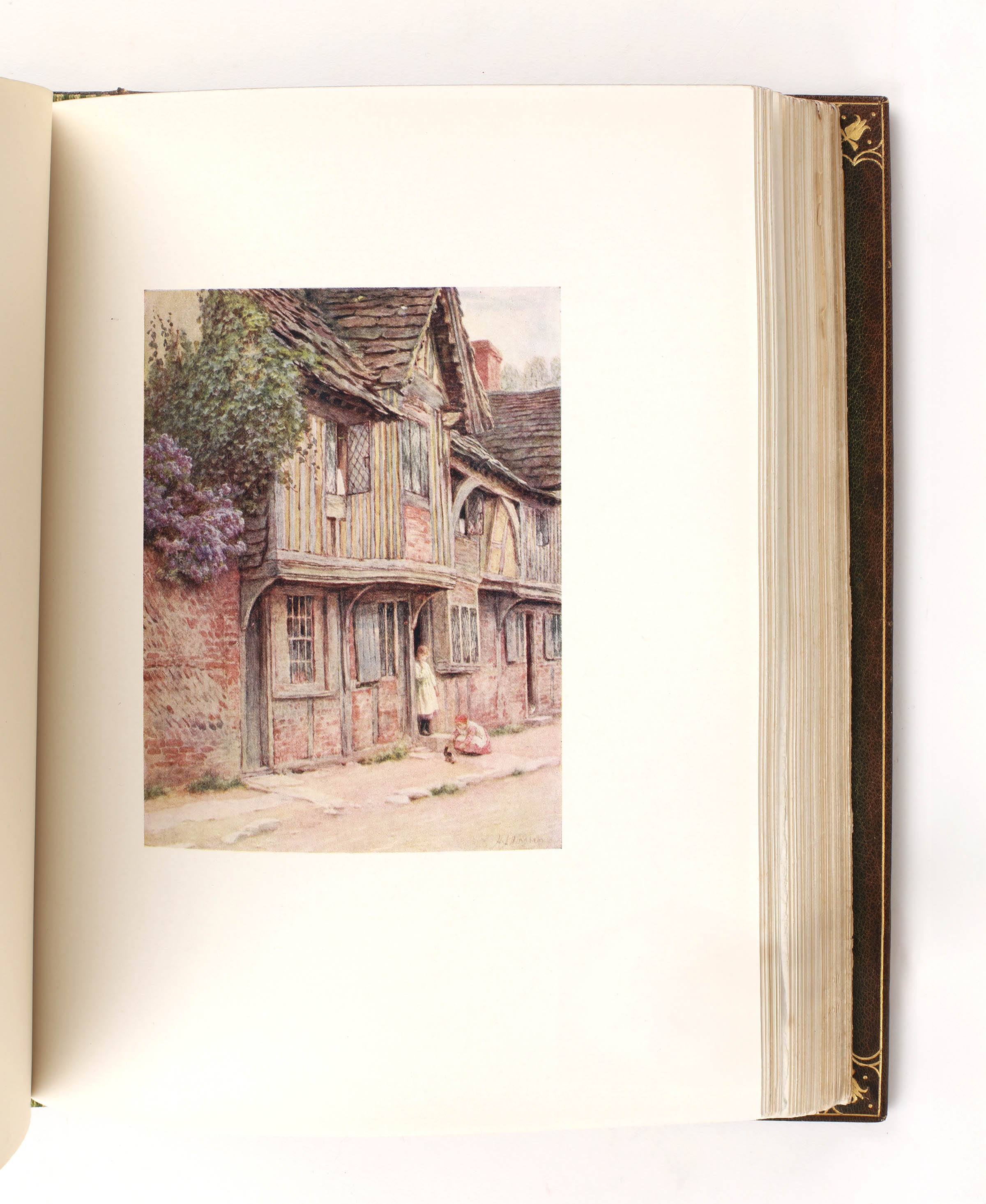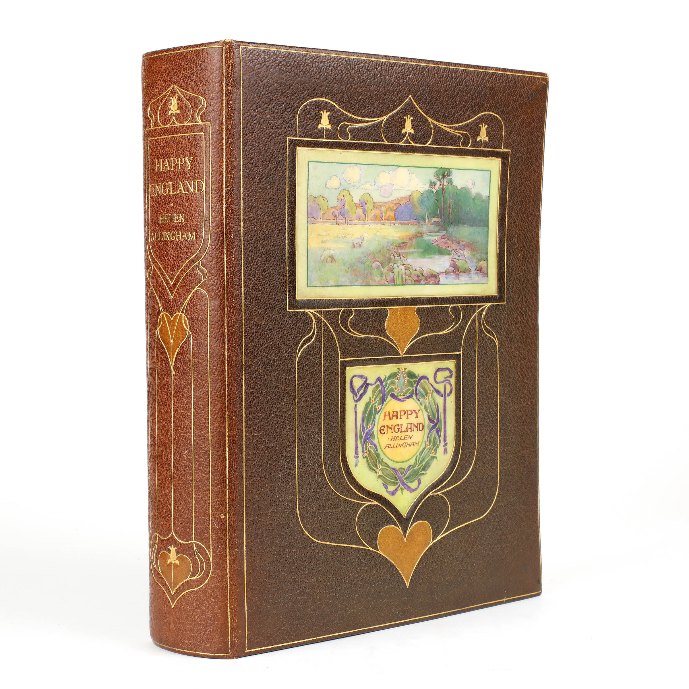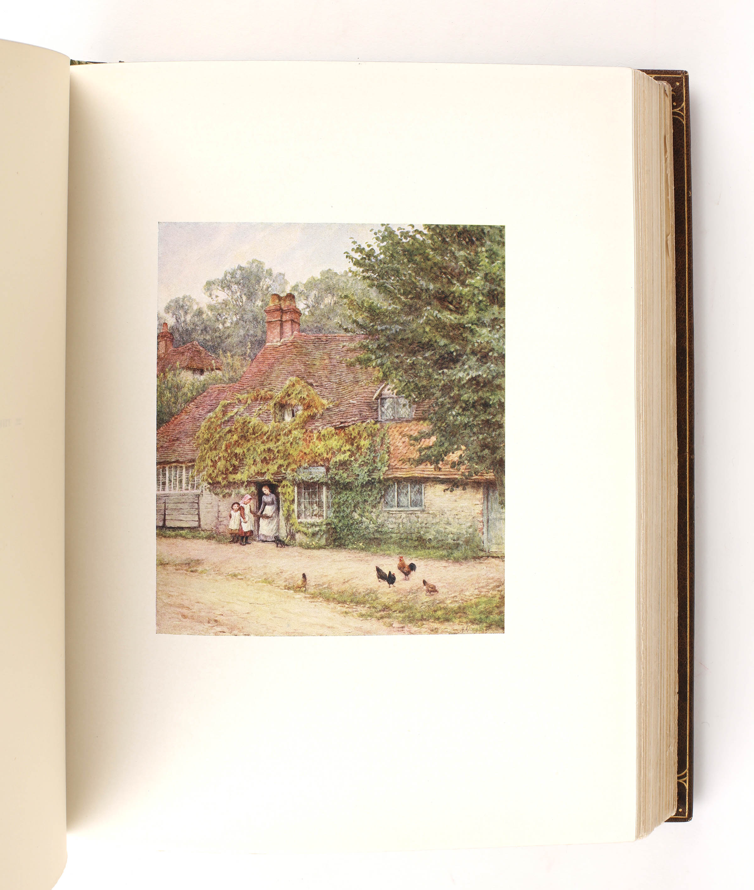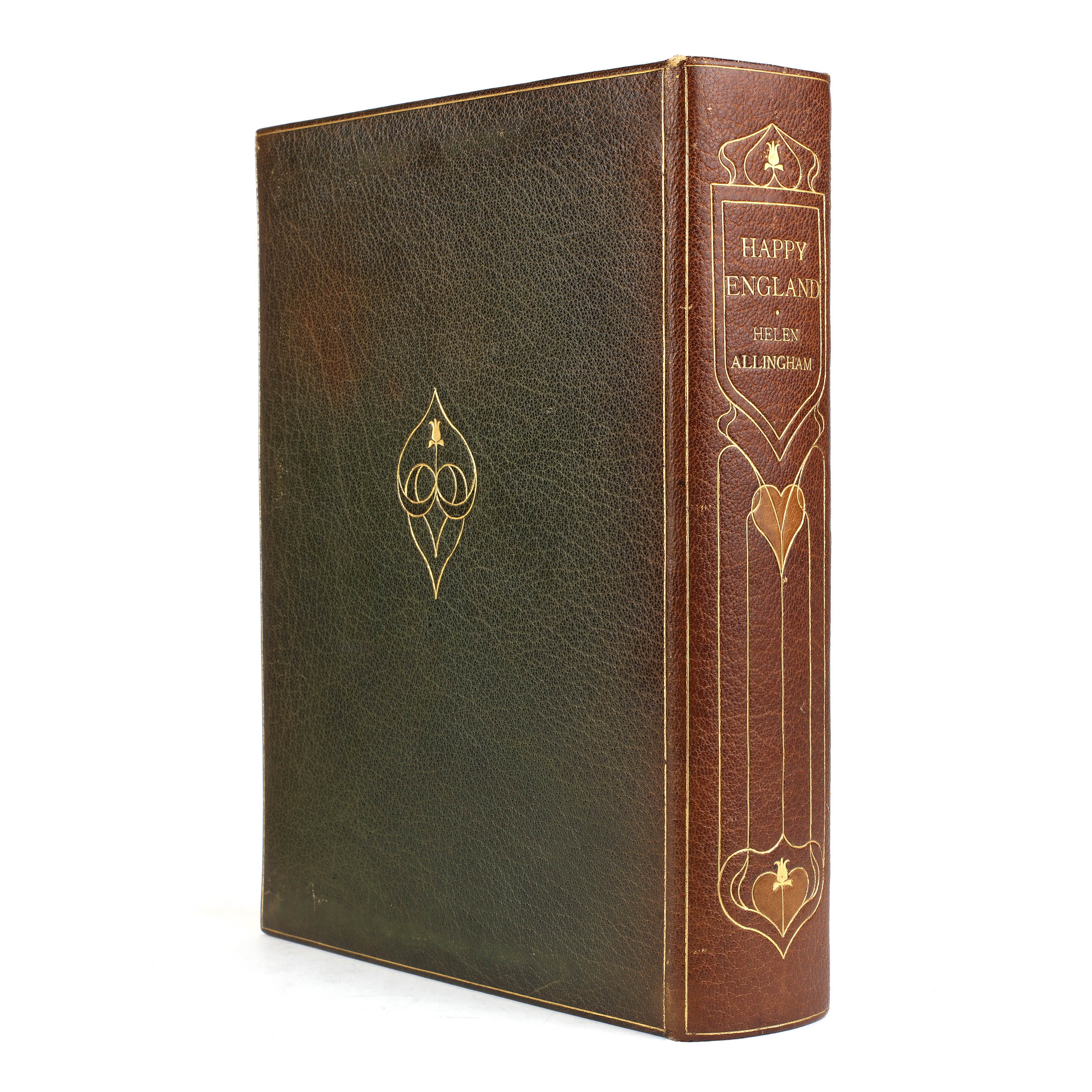 First edition, deluxe issue. Number 559 of 750 copies, signed by Helen Allingham. Finely bound by Cedric Chivers in full green morocco with two inlaid vellucent panels, containing watercolours reproducing an English scene and a decorative title wreath, both with gilt and mother of pearl inlays. The upper cover is further decorated with a symmetrical art nouveau design in gilt and two yellow morocco onlays and a gilt motif in the centre of the back panel. The smooth spine is decorated with the same column gilt decoration and two heart shaped yellow morocco onlays. Single line gilt border on cover, spine and back panel. Gilt ruled turn-ins and green patterned endpapers. Top edge gilt. Eighty one colour illustrations of English scenes of rural life. A near fine copy, with slight fading to the spine, internally fresh.