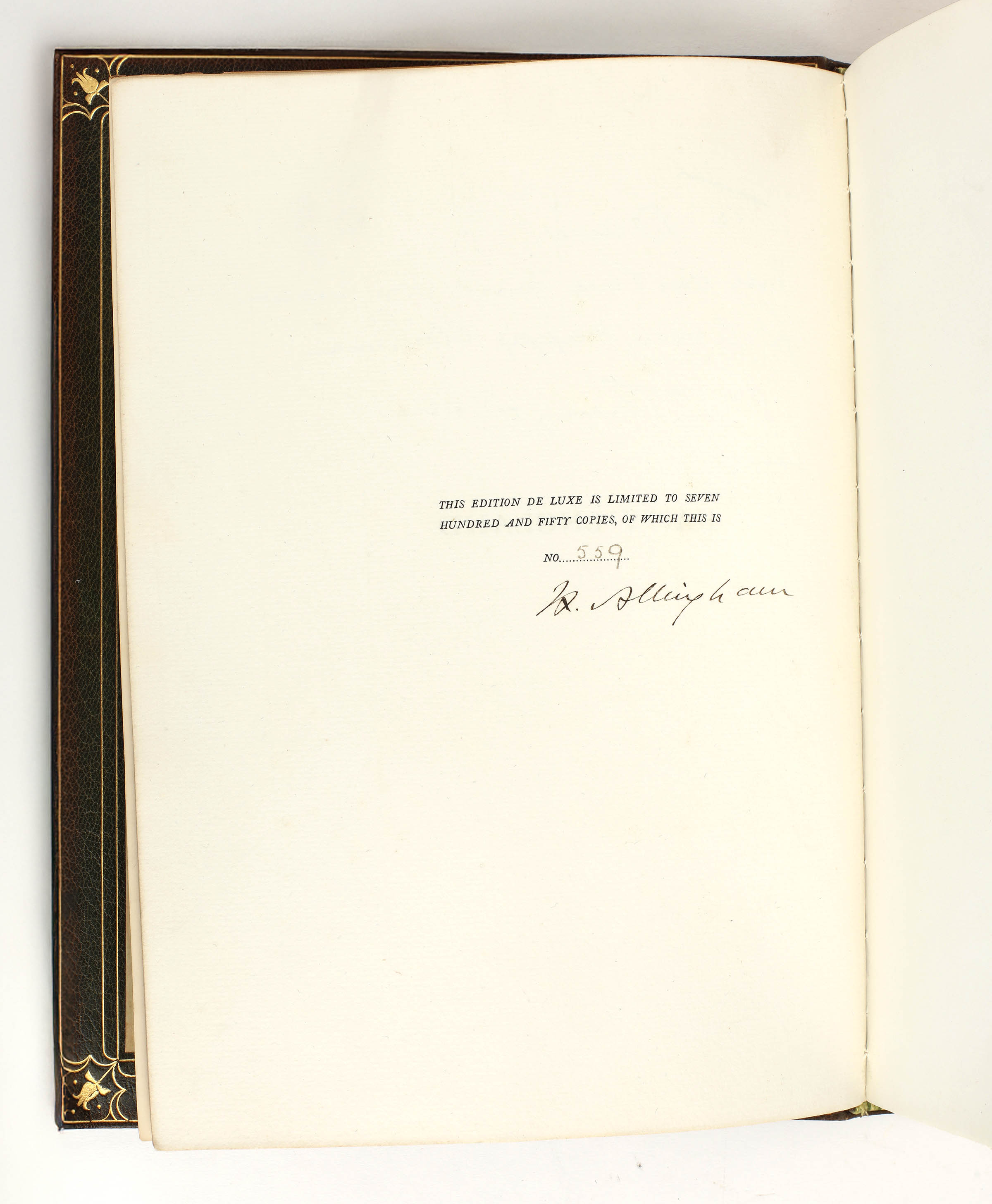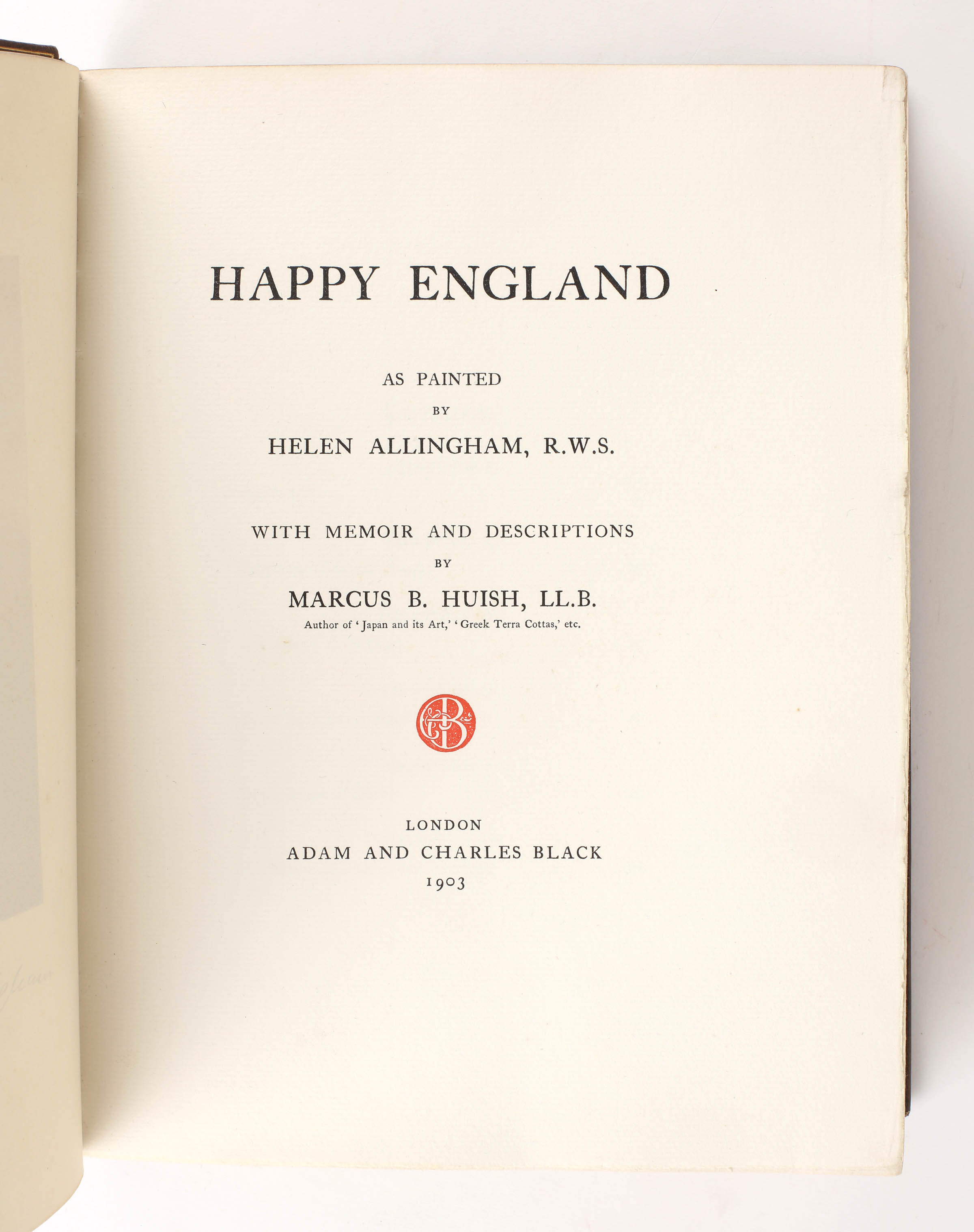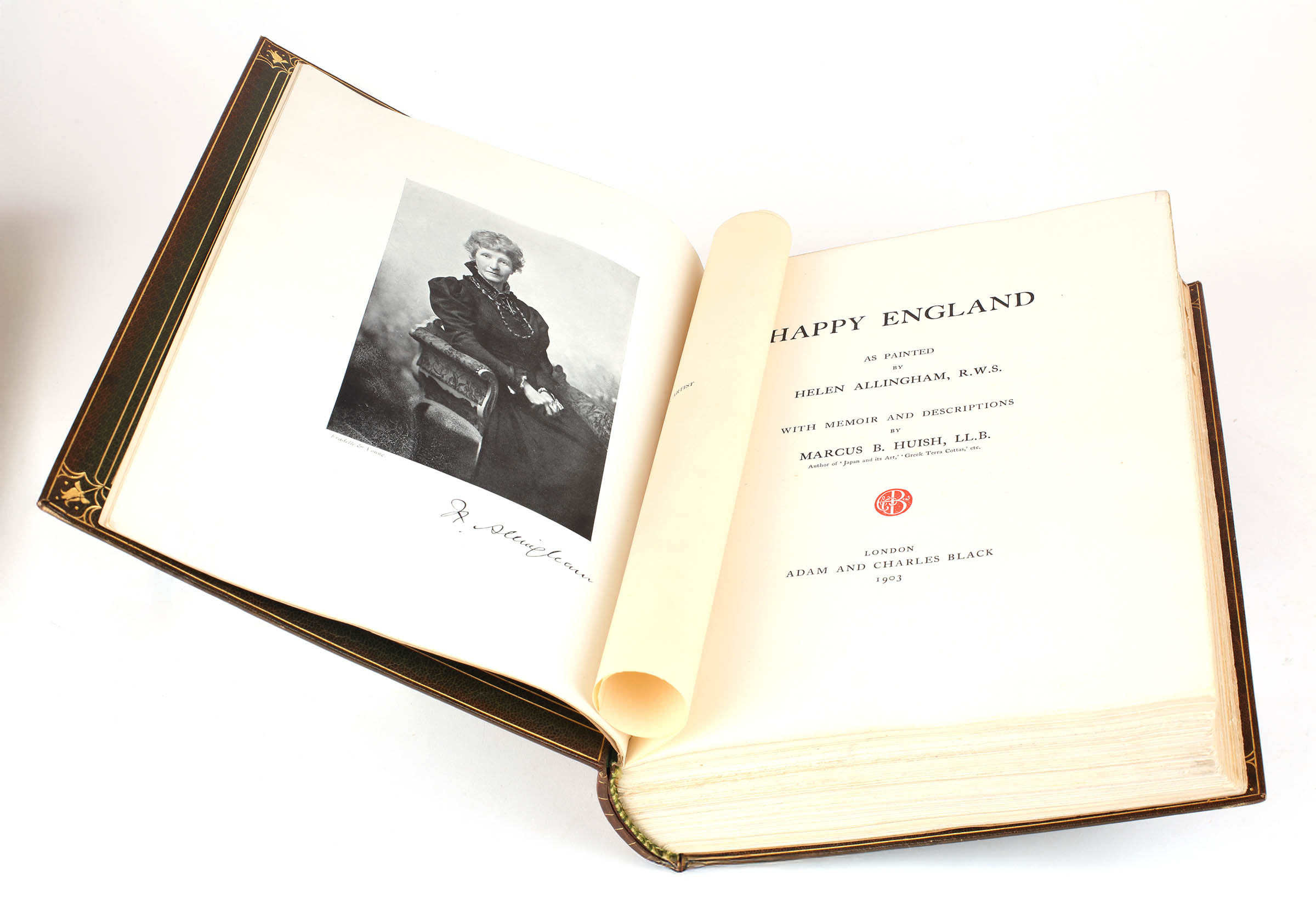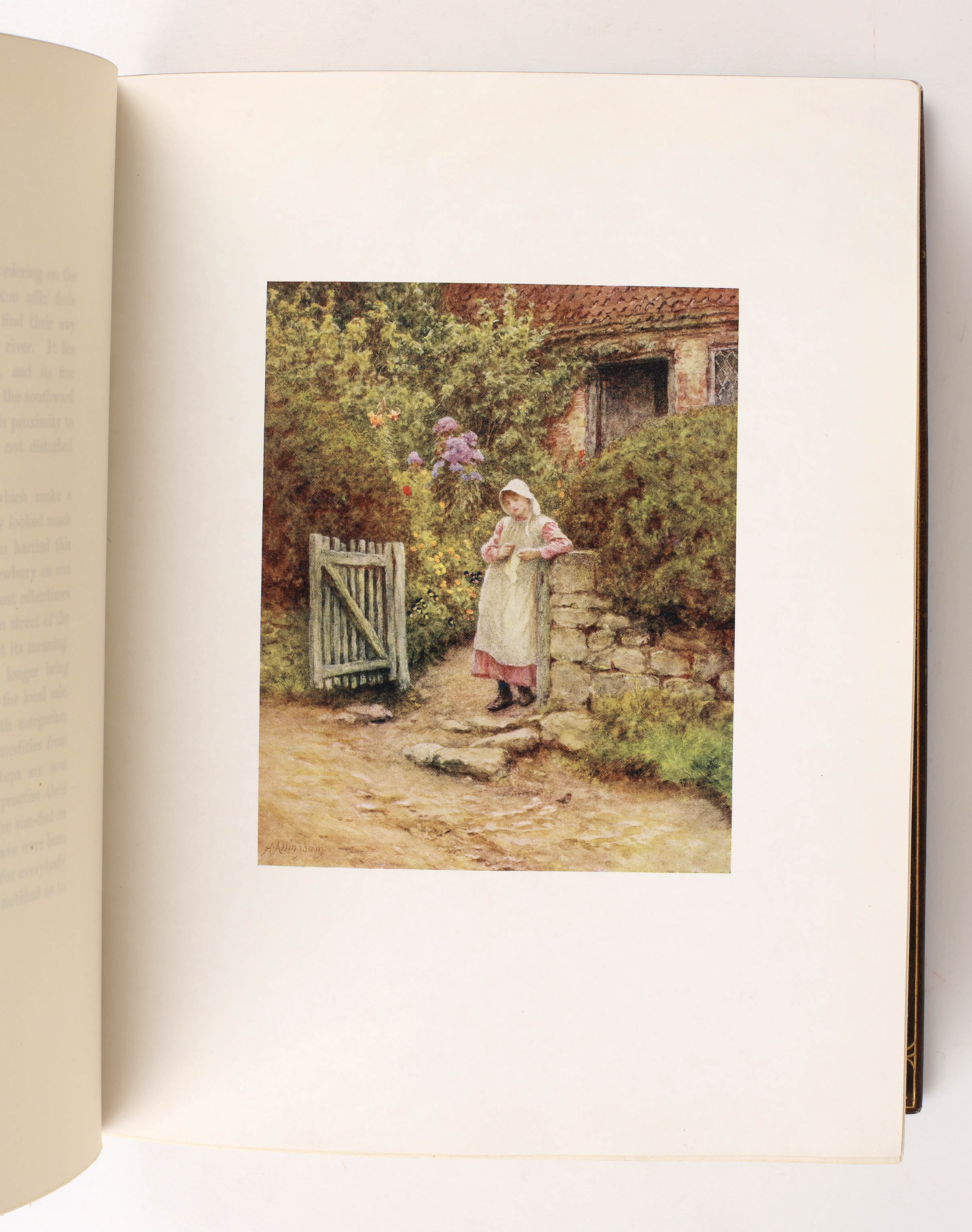 First edition, deluxe issue. Number 559 of 750 copies, signed by Helen Allingham. Finely bound by Cedric Chivers in full green morocco with two inlaid vellucent panels, containing watercolours reproducing an English scene and a decorative title wreath, both with gilt and mother of pearl inlays. The upper cover is further decorated with a symmetrical art nouveau design in gilt and two yellow morocco onlays and a gilt motif in the centre of the back panel. The smooth spine is decorated with the same column gilt decoration and two heart shaped yellow morocco onlays. Single line gilt border on cover, spine and back panel. Gilt ruled turn-ins and green patterned endpapers. Top edge gilt. Eighty one colour illustrations of English scenes of rural life. A near fine copy, with slight fading to the spine, internally fresh.
