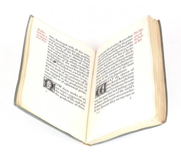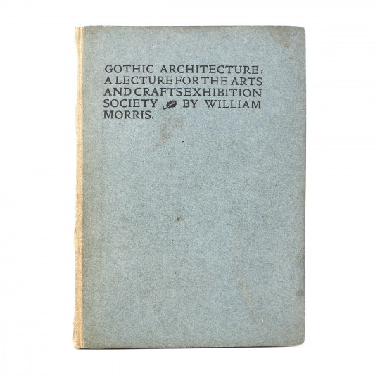 William Morris established the Kelmscott press in 1891, and proceeded to print over fifty three medieval style books. This particular title, first published at a half-crown, was produced from a lecture on Gothic Architecture in 1889. The arrangement was printed during the Arts and Crafts exhibition of 1893.