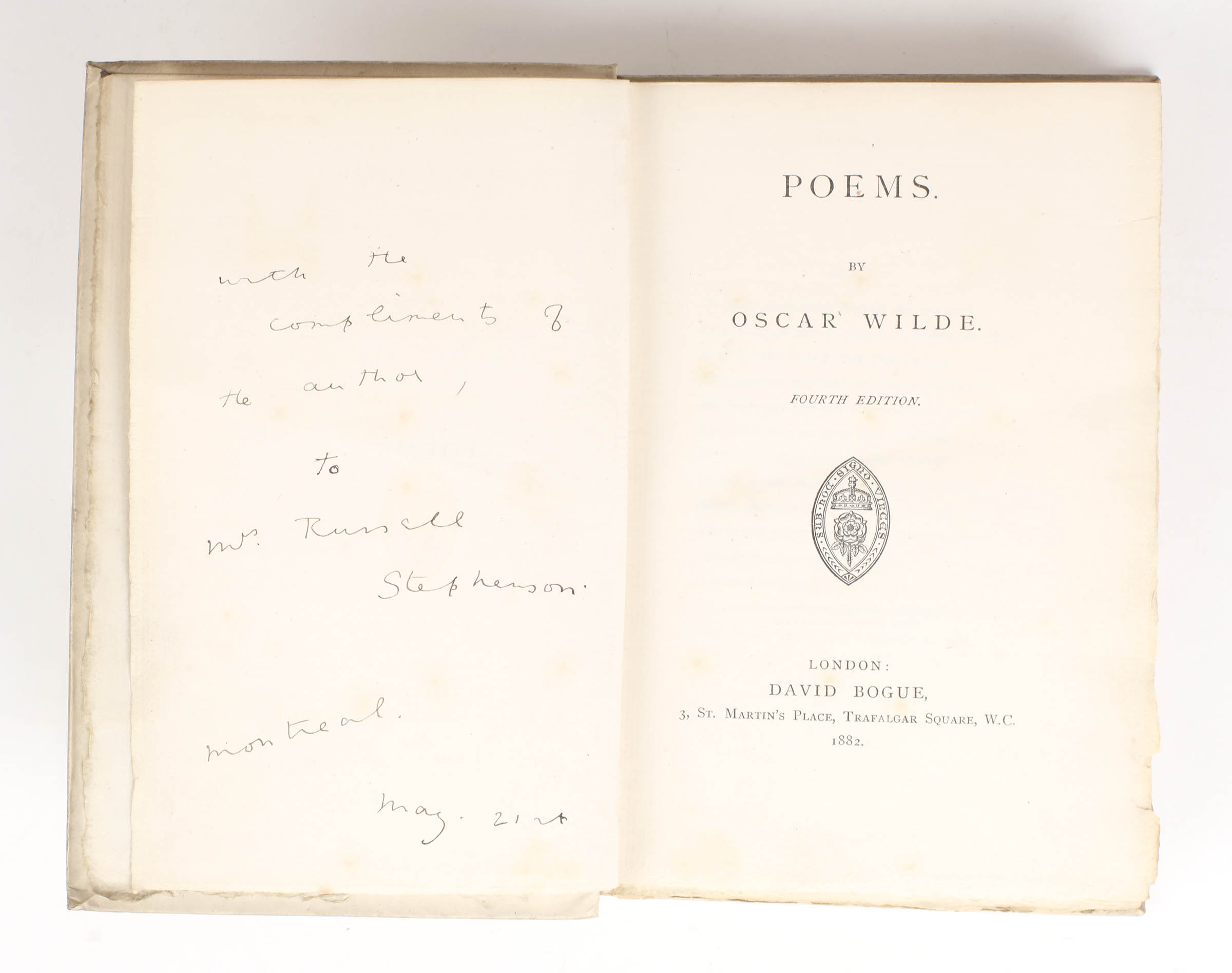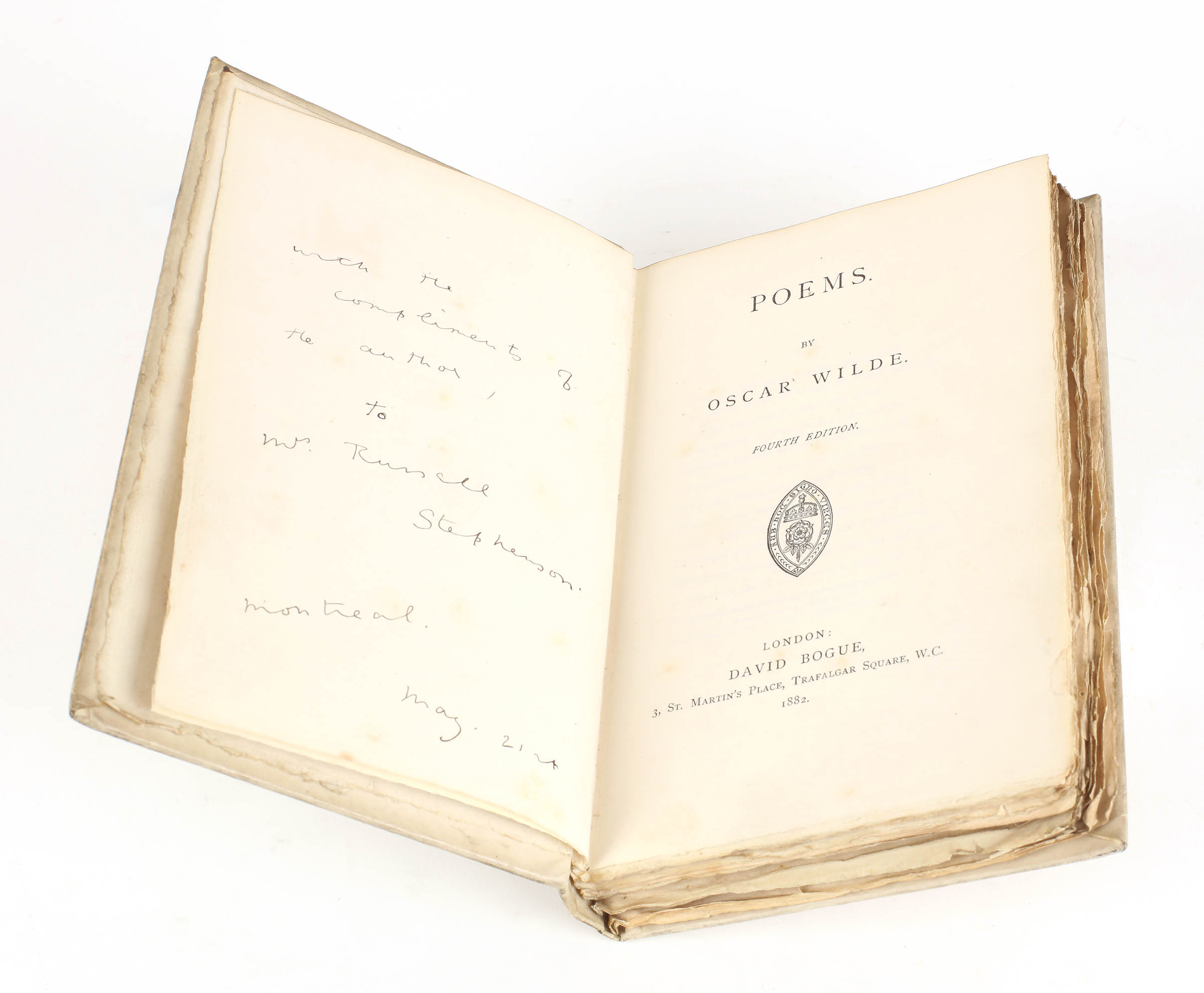 During his North American tour, Oscar Wilde visited Montreal, where he delivered a lecture on the 16th of May. On the 20th of May, he received an invitation from the Women's Hospital Committee to present a lecture titled 'The House Beautiful'. Many of the audience, predominately women, dressed in costume and offered Wilde an enthusiastic welcome. This particular copy was inscribed the following day for Mrs Russell Stephenson, a well known socialite of Montreal.