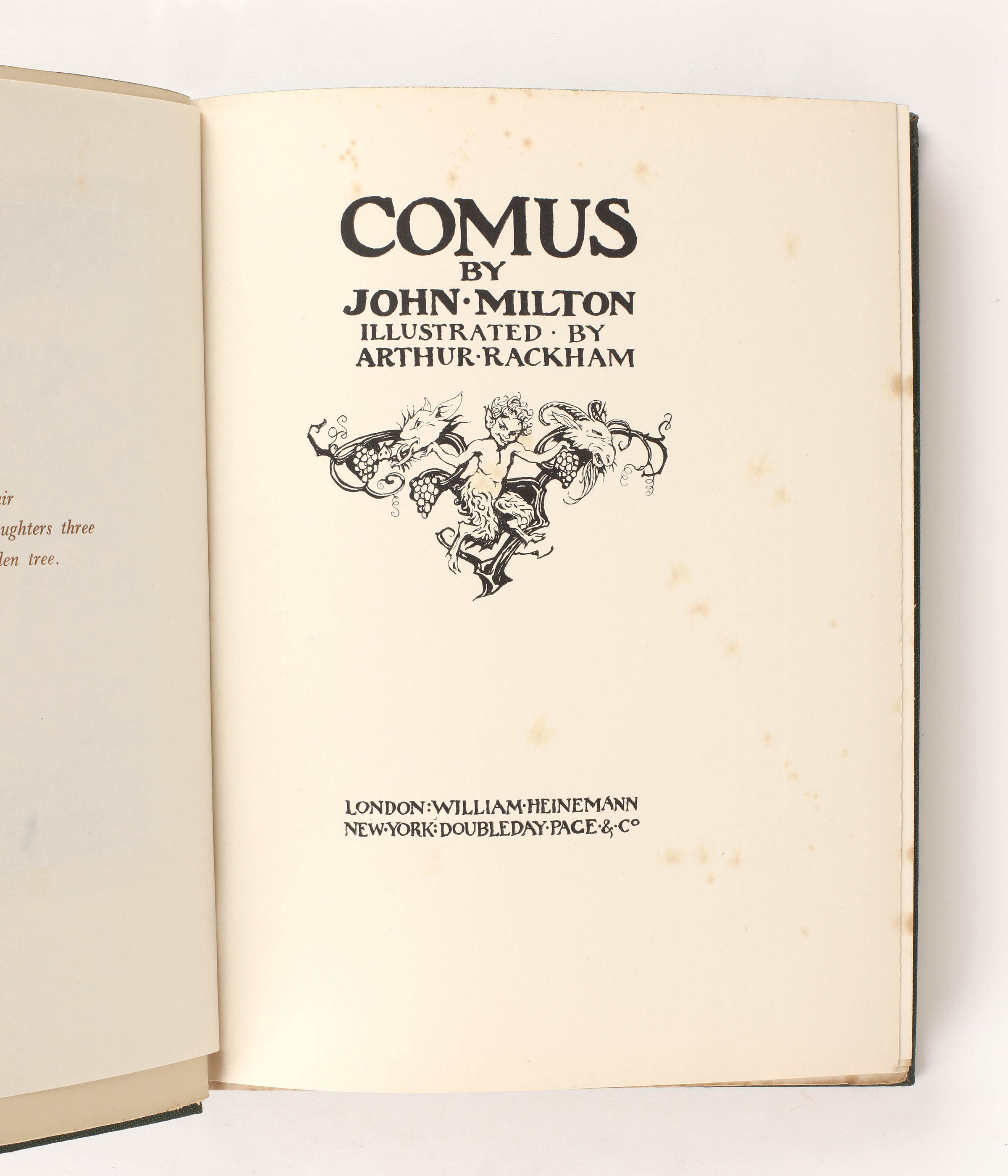 Rackham's darkly fantastical style is perfectly suited to this story of a maiden lost in an ominous forest, resisting the enchantment of Comus, the hedonistic son of Bacchus and Circe, and his troupe of of animal-headed revellers.