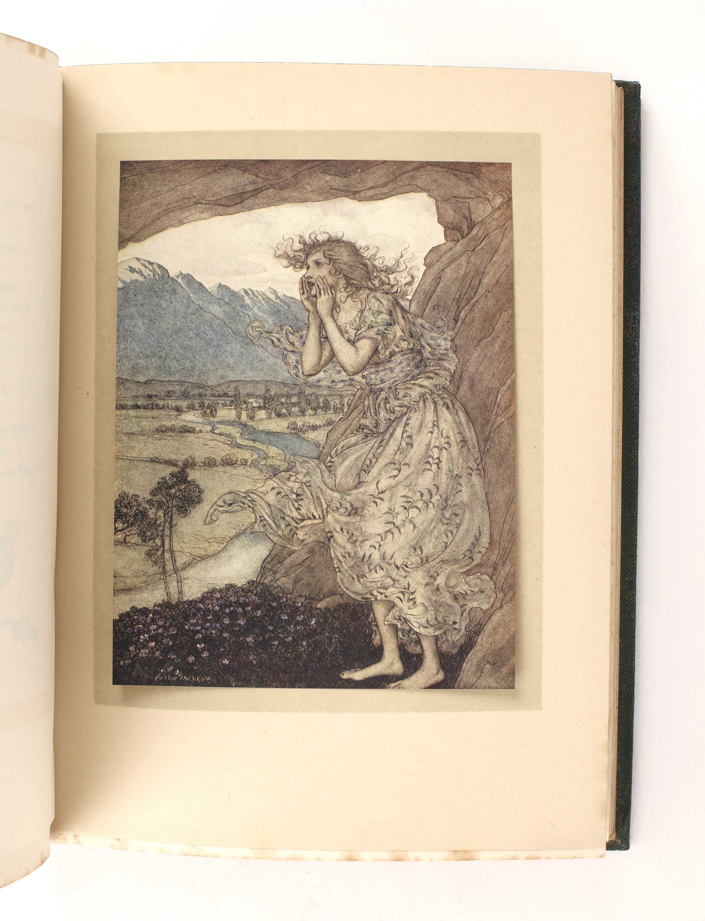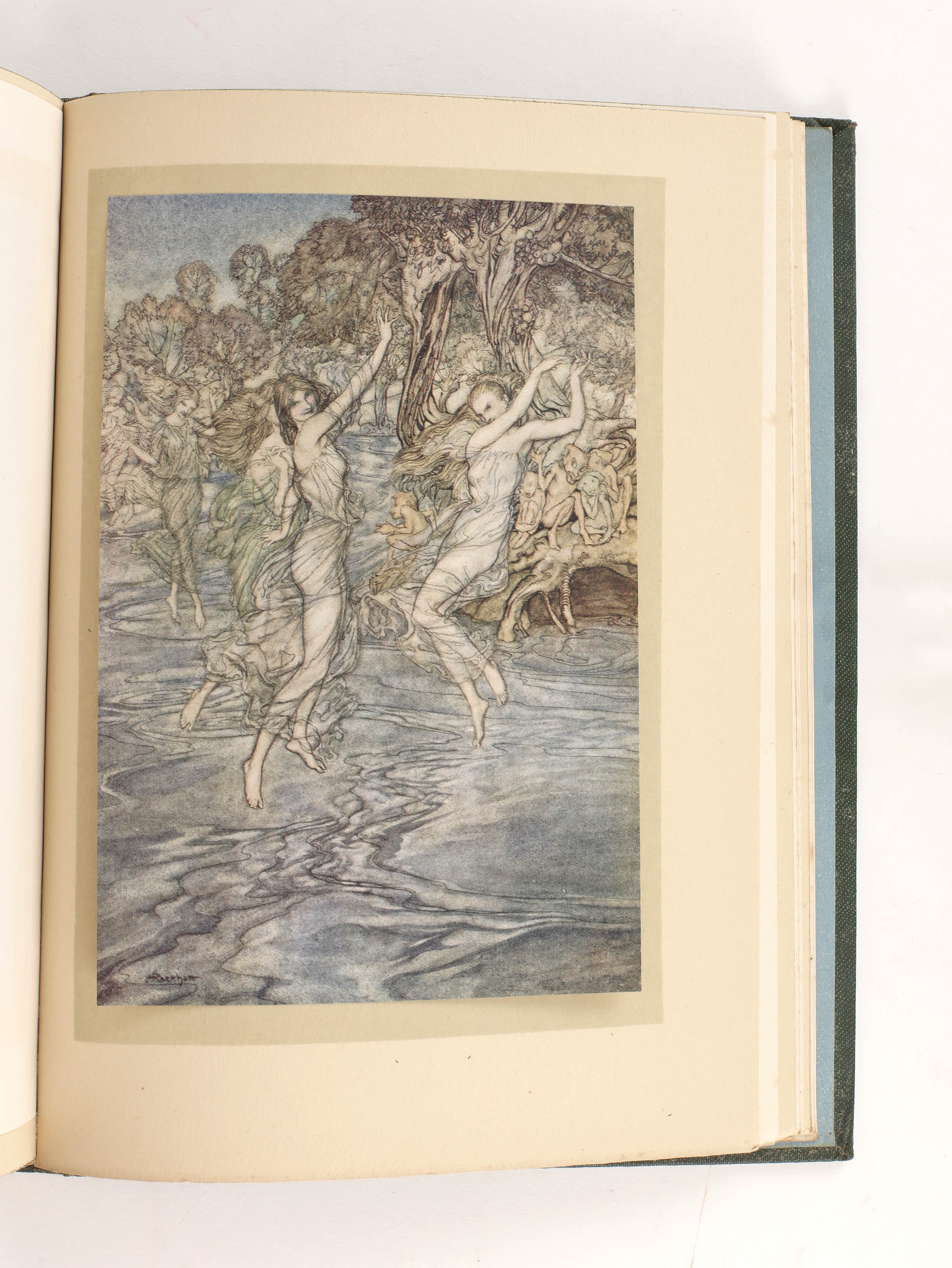 First edition illustrated by Arthur Rackham. 4to. Green cloth with gilt lettering and vignettes. Top edge green. With a loose Heinemann subscription card. Pale blue endpapers with illustrations in white silhouette, 24 tipped in colour plates under captioned tissue guards, plus lots of black and white drawings. A near fine copy, slightly bumped to corner and light foxing to preliminaries.