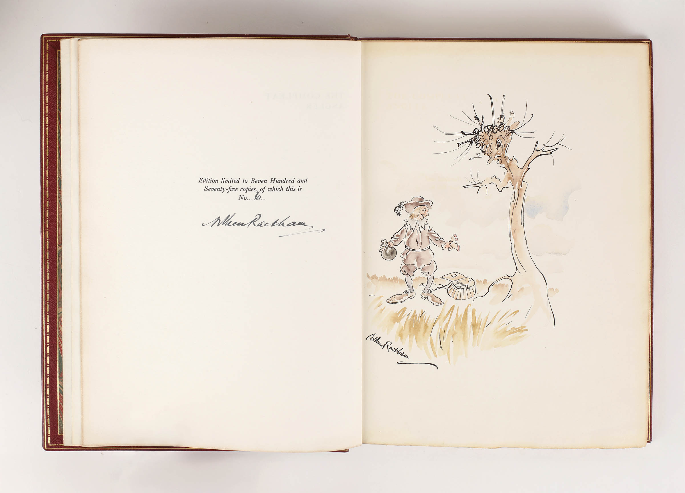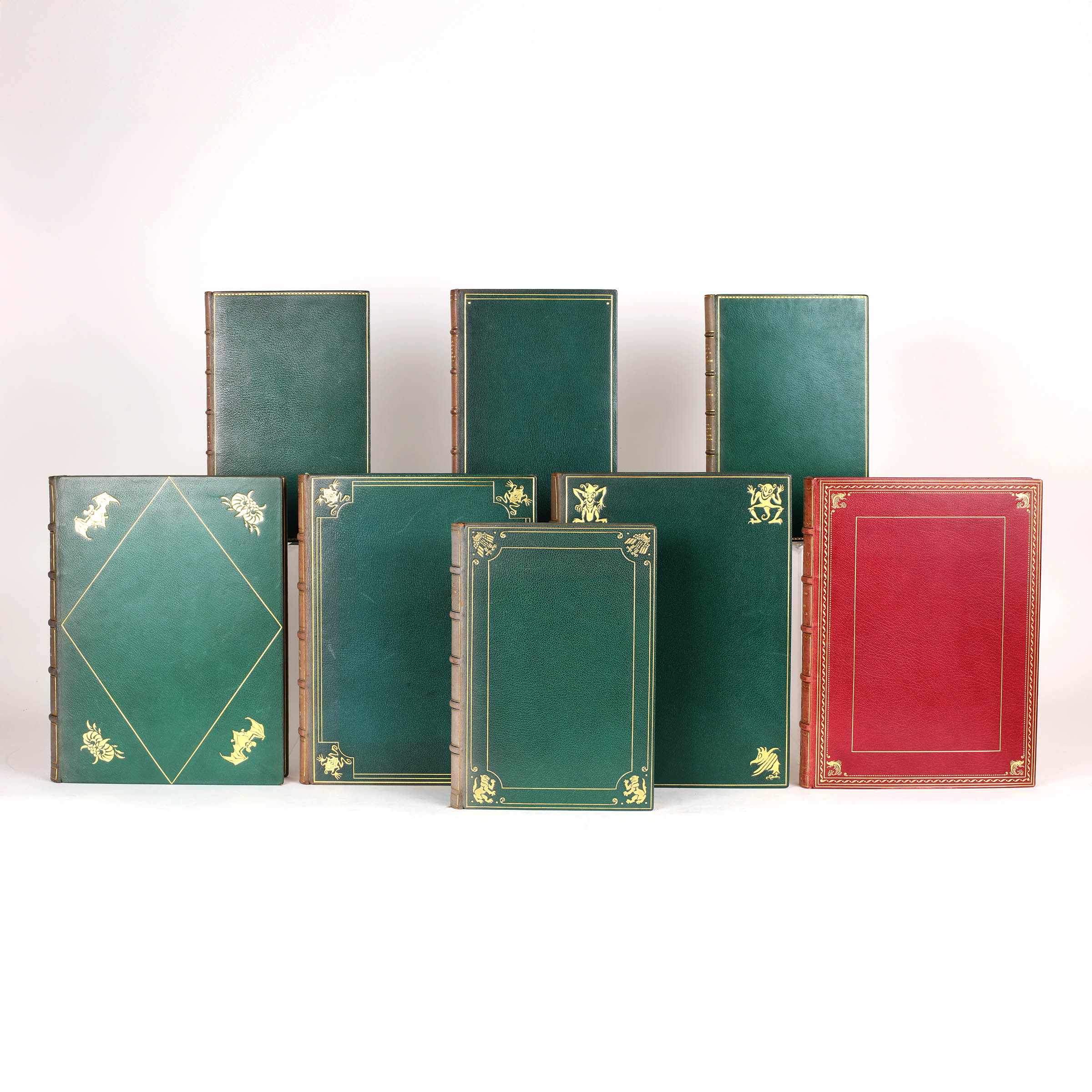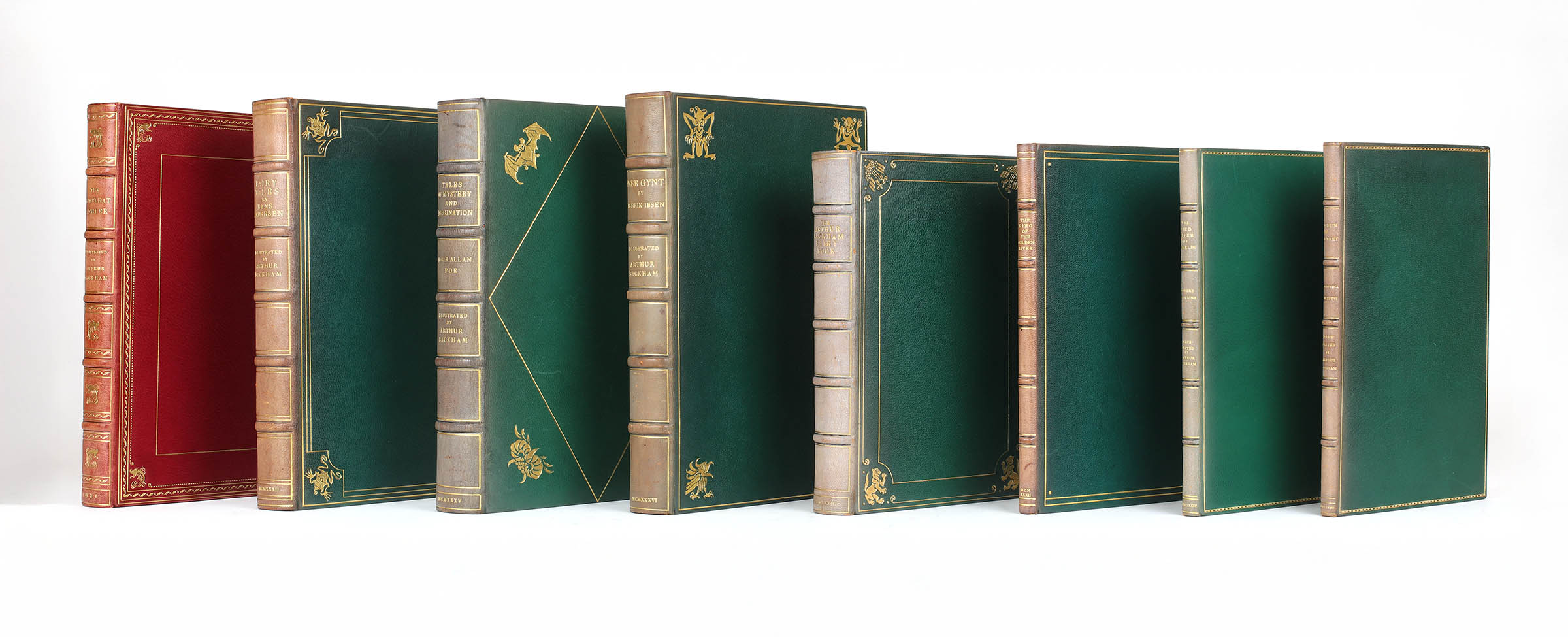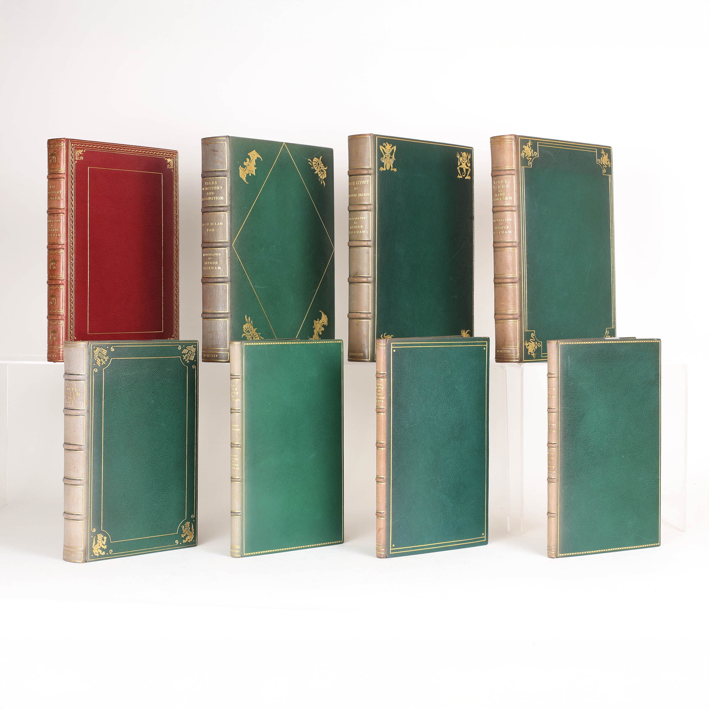 Together eight volumes, each one of nine special copies, bound for the publisher in full morrocco by Sangorski & Sutcliffe and with a full page original watercolour by Rackham. Raised bands and gilt titles to the spine and gilt ruled borders and decoration to the covers. Top edges gilt, others uncut. Each watercolour is signed by Rackham and each book separately signed under the limitation. Text on hand made paper, with numerous tipped in plates to each volume. A superb set in near fine condition, with the spines uniformly faded and the slightest trace of wear to the spine ends, but overall present very well indeed.