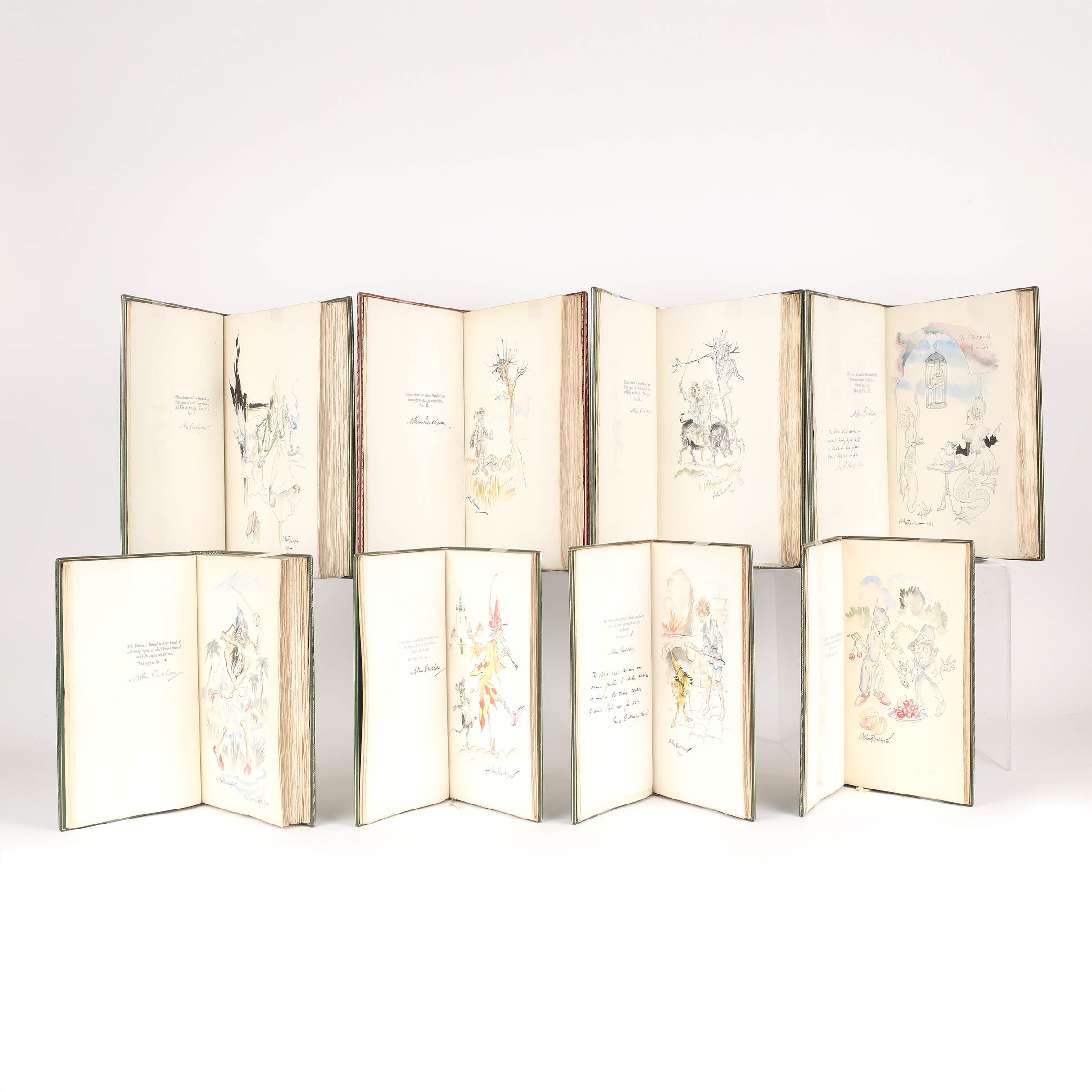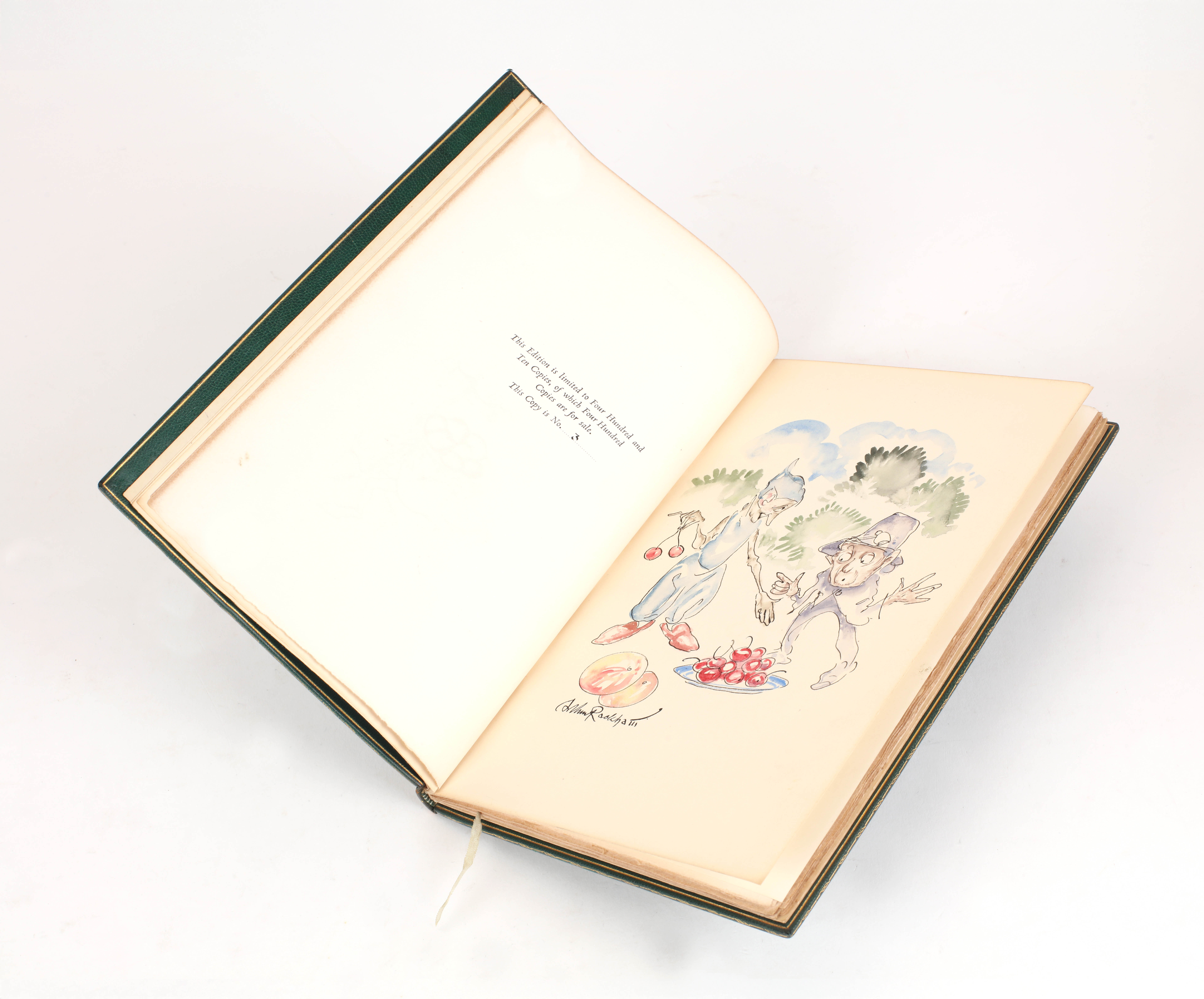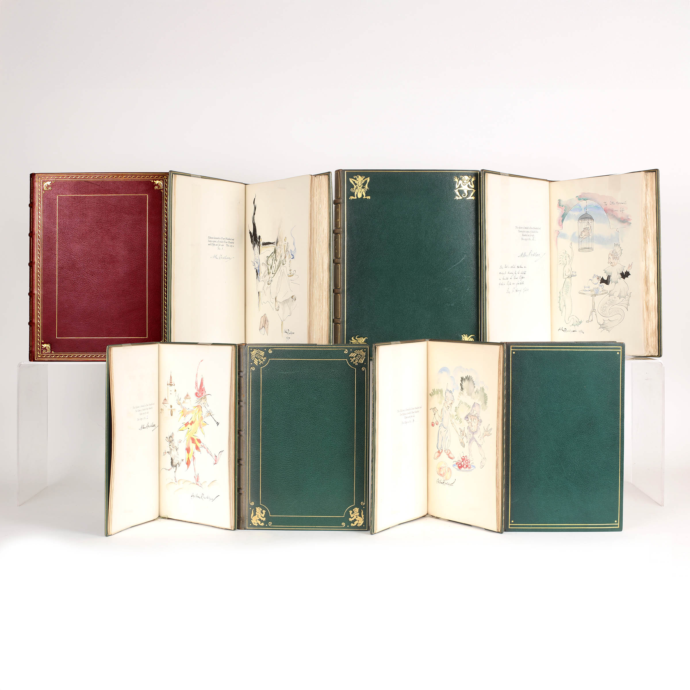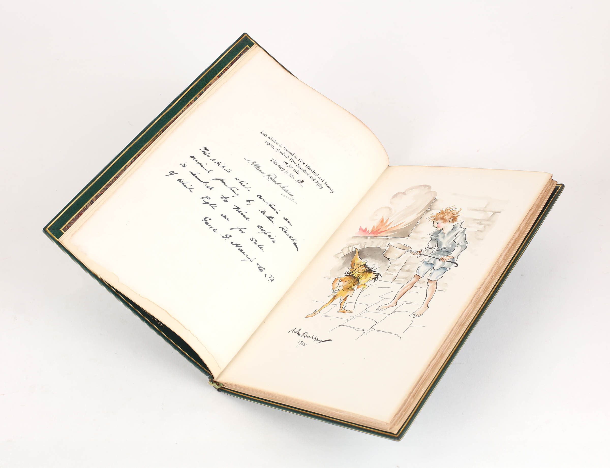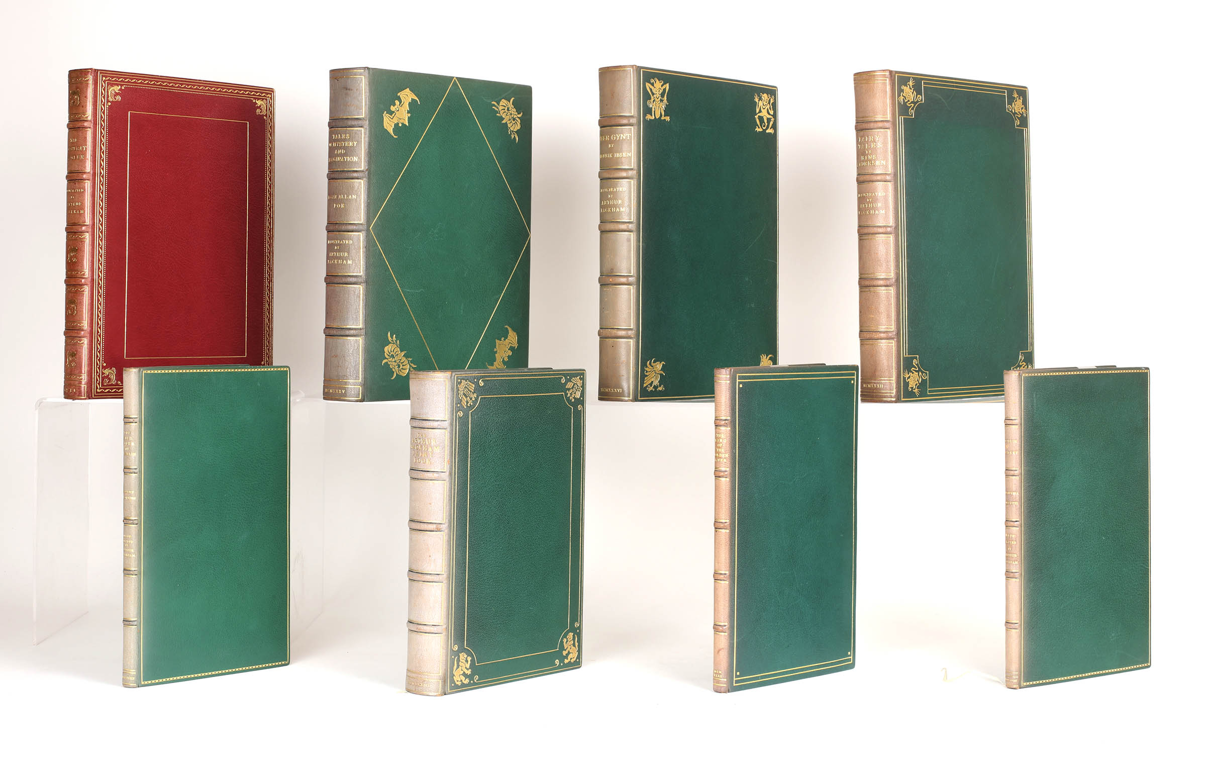 Together eight volumes, each one of nine special copies, bound for the publisher in full morrocco by Sangorski & Sutcliffe and with a full page original watercolour by Rackham. Raised bands and gilt titles to the spine and gilt ruled borders and decoration to the covers. Top edges gilt, others uncut. Each watercolour is signed by Rackham and each book separately signed under the limitation. Text on hand made paper, with numerous tipped in plates to each volume. A superb set in near fine condition, with the spines uniformly faded and the slightest trace of wear to the spine ends, but overall present very well indeed.