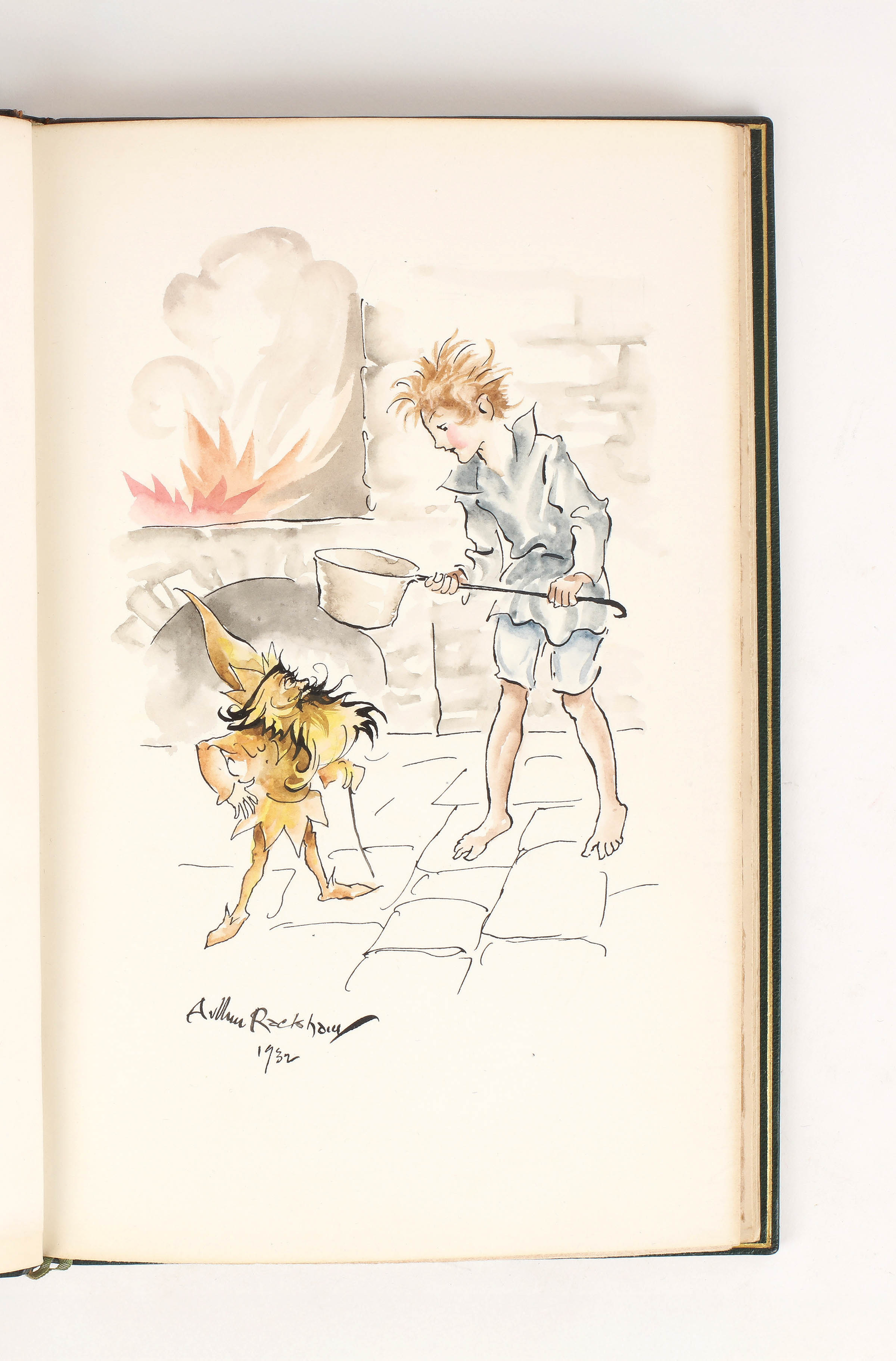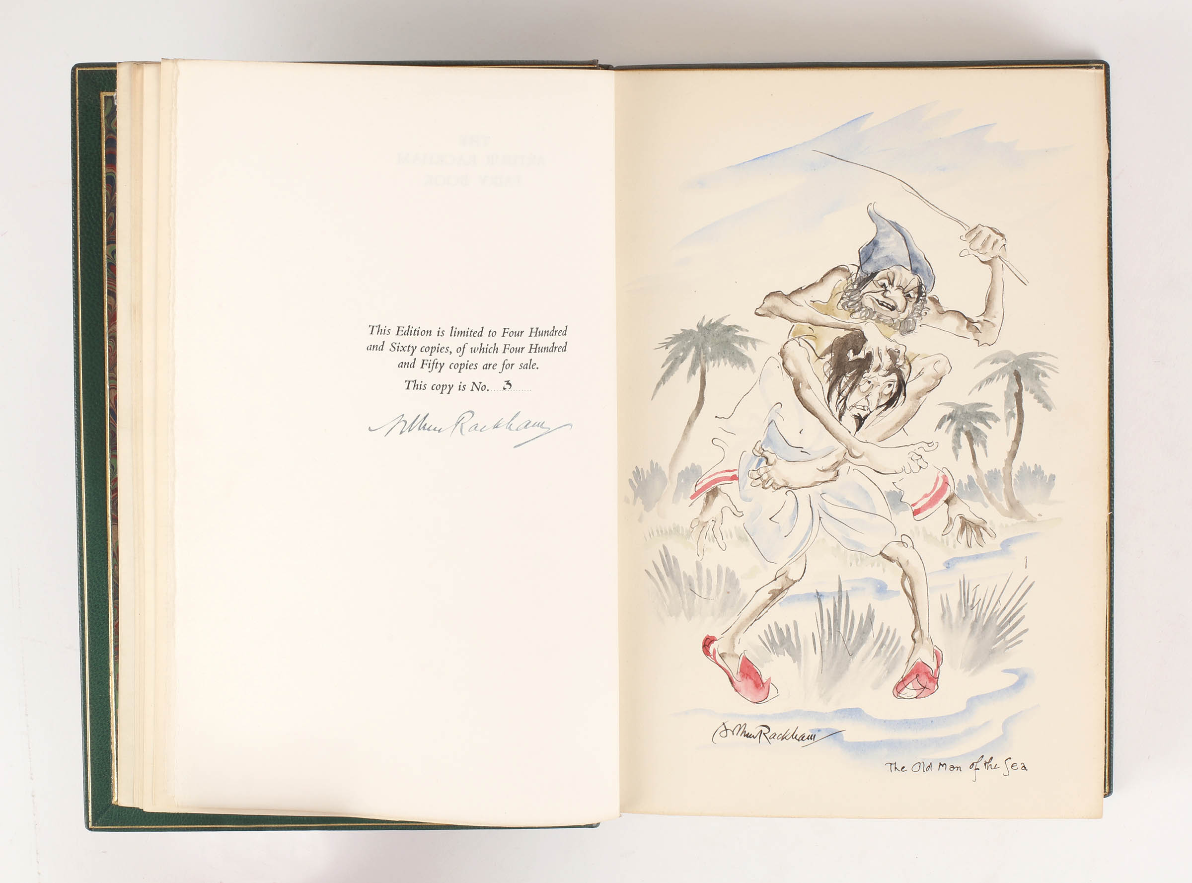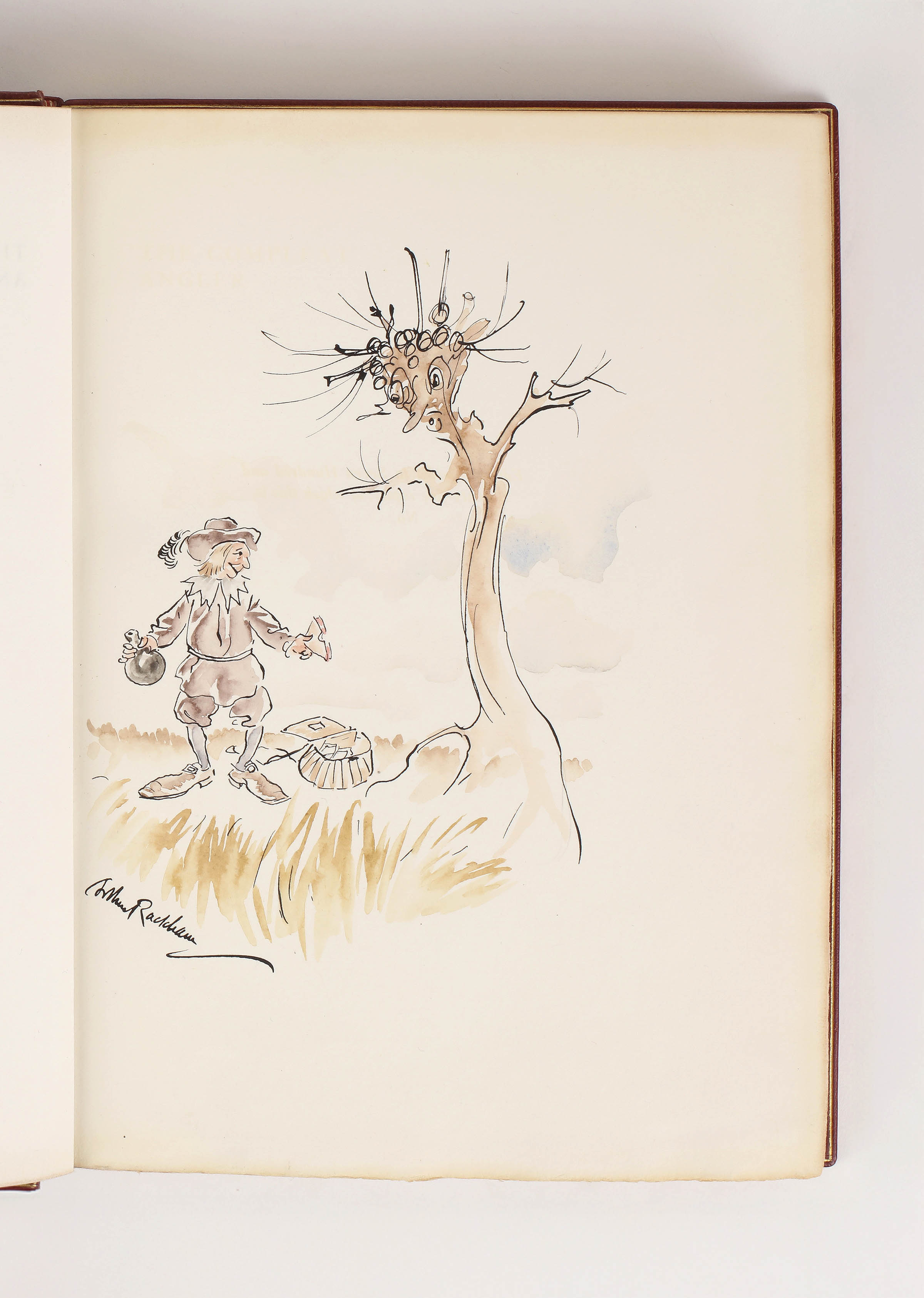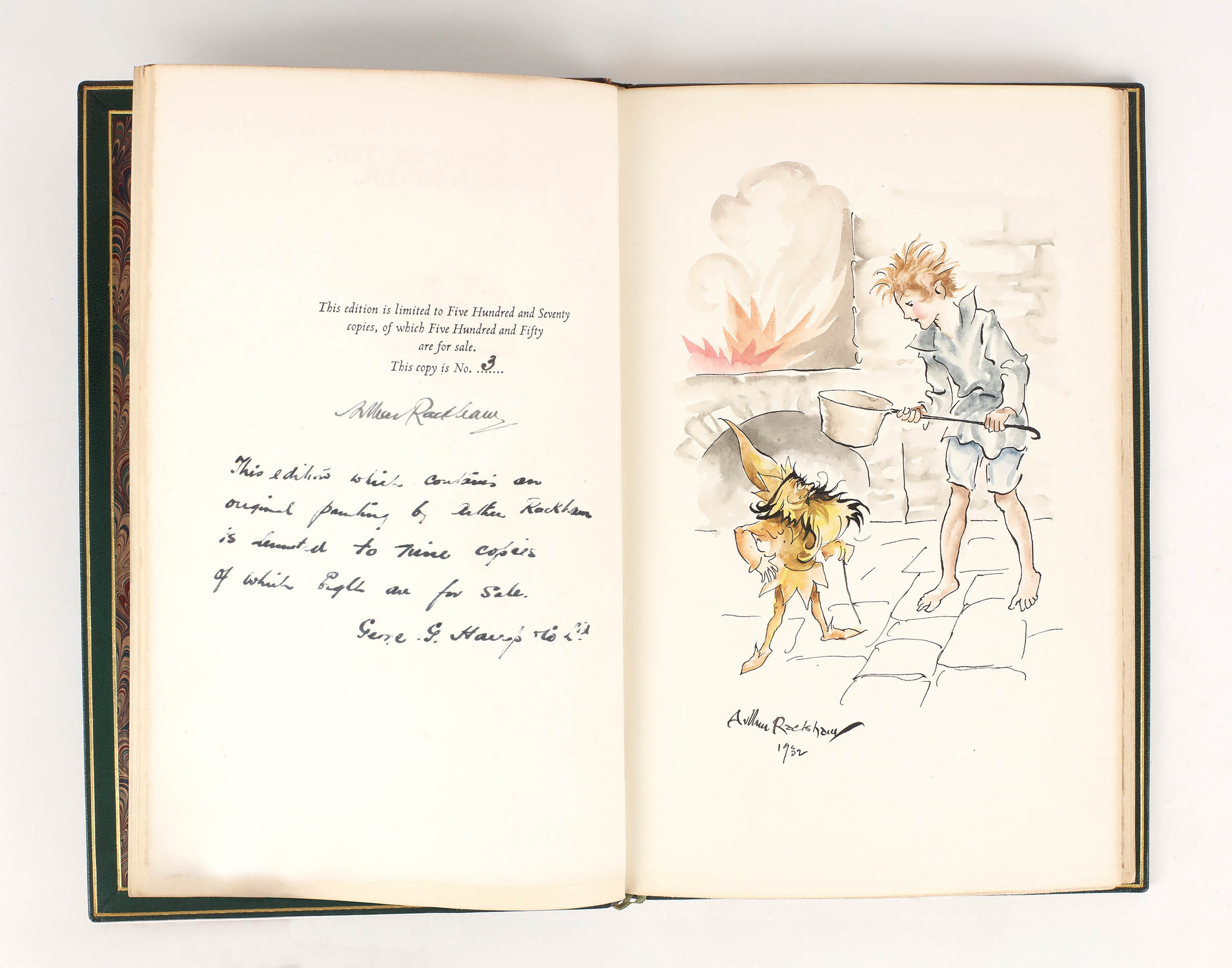 Having established himself as the major force in early twentieth century book illustration, through his work for William Heinemann from 1905, Arthur Rackham moved his allegiance to Harrap in the late 1920s, wooed by George Harrap's enthusiastic vision for the future of what he termed 'The Book Beautiful'. By 1928, Harrap was Rackham's primary publisher and sought to recreate the lavish gift book for the pre-war era. As an artist, Rackham had added small drawings to his presentation inscriptions in his works to family members and friends and for a long time. As his popularity grew, he undertook occasional commissions from buyers of books to embellish their deluxe editions with full page original watercolours. Harrap, seeing this, sought to place the concept on a commercial footing and, starting with The Compleat Angler in 1931, reserved the numbers one to nine (ten in the case of The Compleat Angler) of the deluxe edition to be sumptuously bound by Sangorski & Suttcliffe, described at the time as "Rolls Royce of bookbinding", and each containing a different original watercolour by Rackham. This practice continued for the remaining seven books illustrated by Rackham to be published by Harrap, thus creating "the ultimate gift book for the final major English commissions to Rackham's work." - Richard Riall (A New Bibliography of Arthur Rackham)