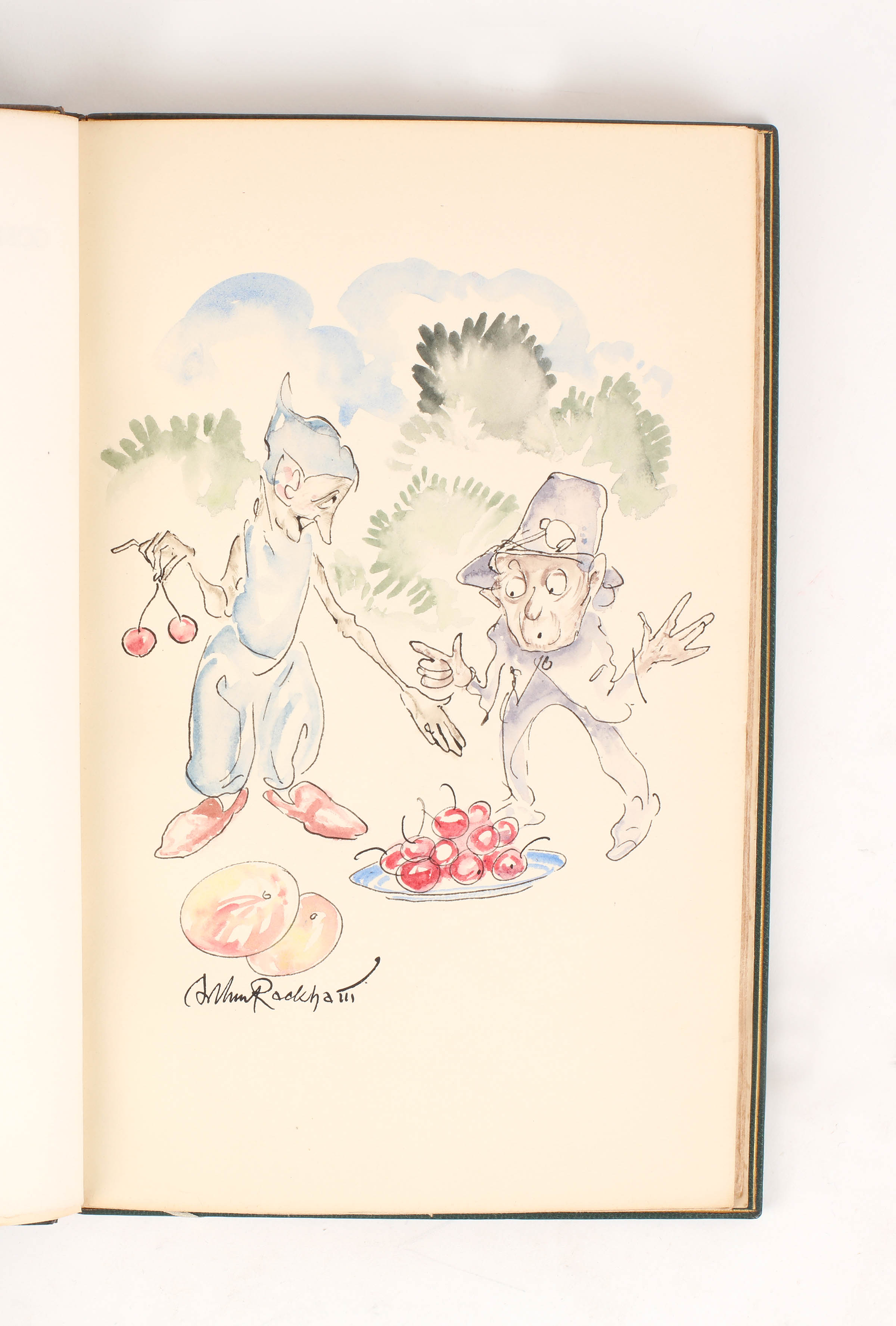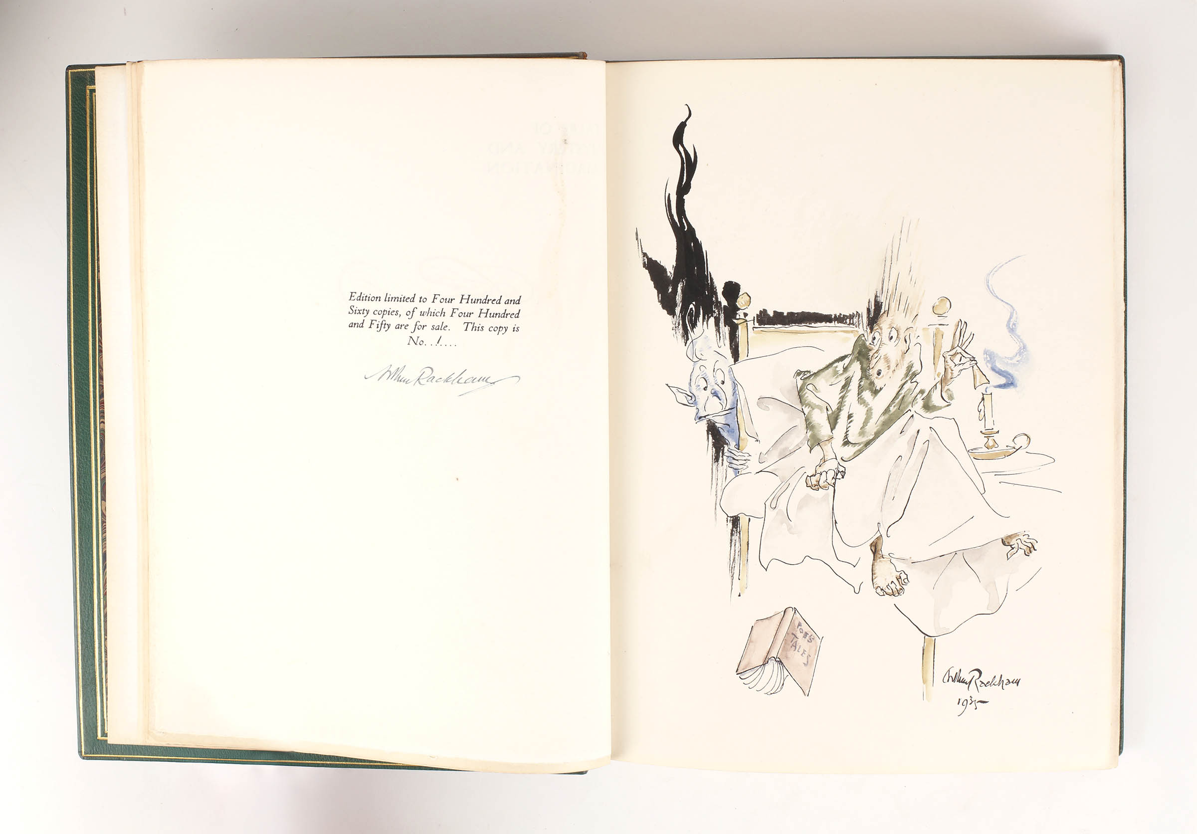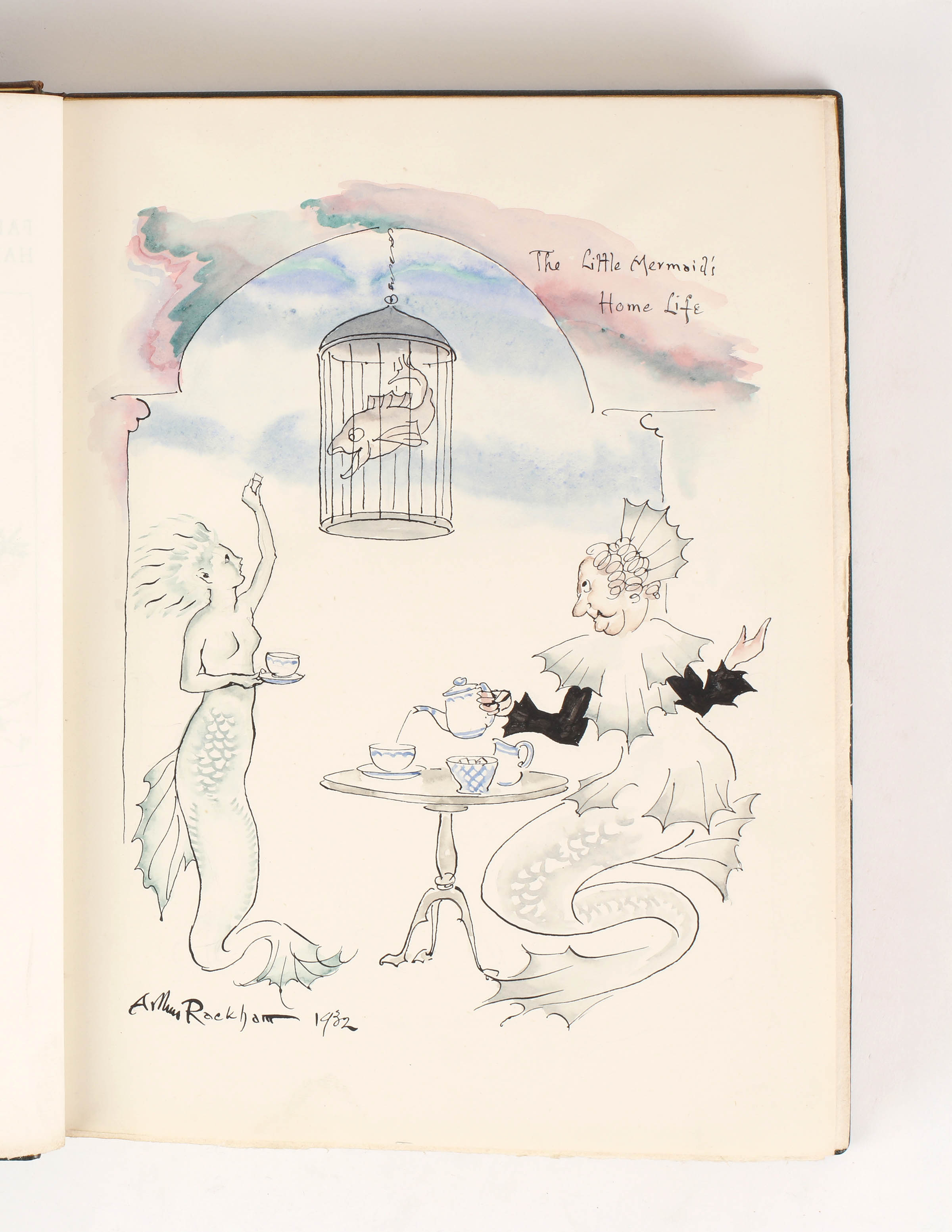 Having established himself as the major force in early twentieth century book illustration, through his work for William Heinemann from 1905, Arthur Rackham moved his allegiance to Harrap in the late 1920s, wooed by George Harrap's enthusiastic vision for the future of what he termed 'The Book Beautiful'. By 1928, Harrap was Rackham's primary publisher and sought to recreate the lavish gift book for the pre-war era. As an artist, Rackham had added small drawings to his presentation inscriptions in his works to family members and friends and for a long time. As his popularity grew, he undertook occasional commissions from buyers of books to embellish their deluxe editions with full page original watercolours. Harrap, seeing this, sought to place the concept on a commercial footing and, starting with The Compleat Angler in 1931, reserved the numbers one to nine (ten in the case of The Compleat Angler) of the deluxe edition to be sumptuously bound by Sangorski & Suttcliffe, described at the time as "Rolls Royce of bookbinding", and each containing a different original watercolour by Rackham. This practice continued for the remaining seven books illustrated by Rackham to be published by Harrap, thus creating "the ultimate gift book for the final major English commissions to Rackham's work." - Richard Riall (A New Bibliography of Arthur Rackham)