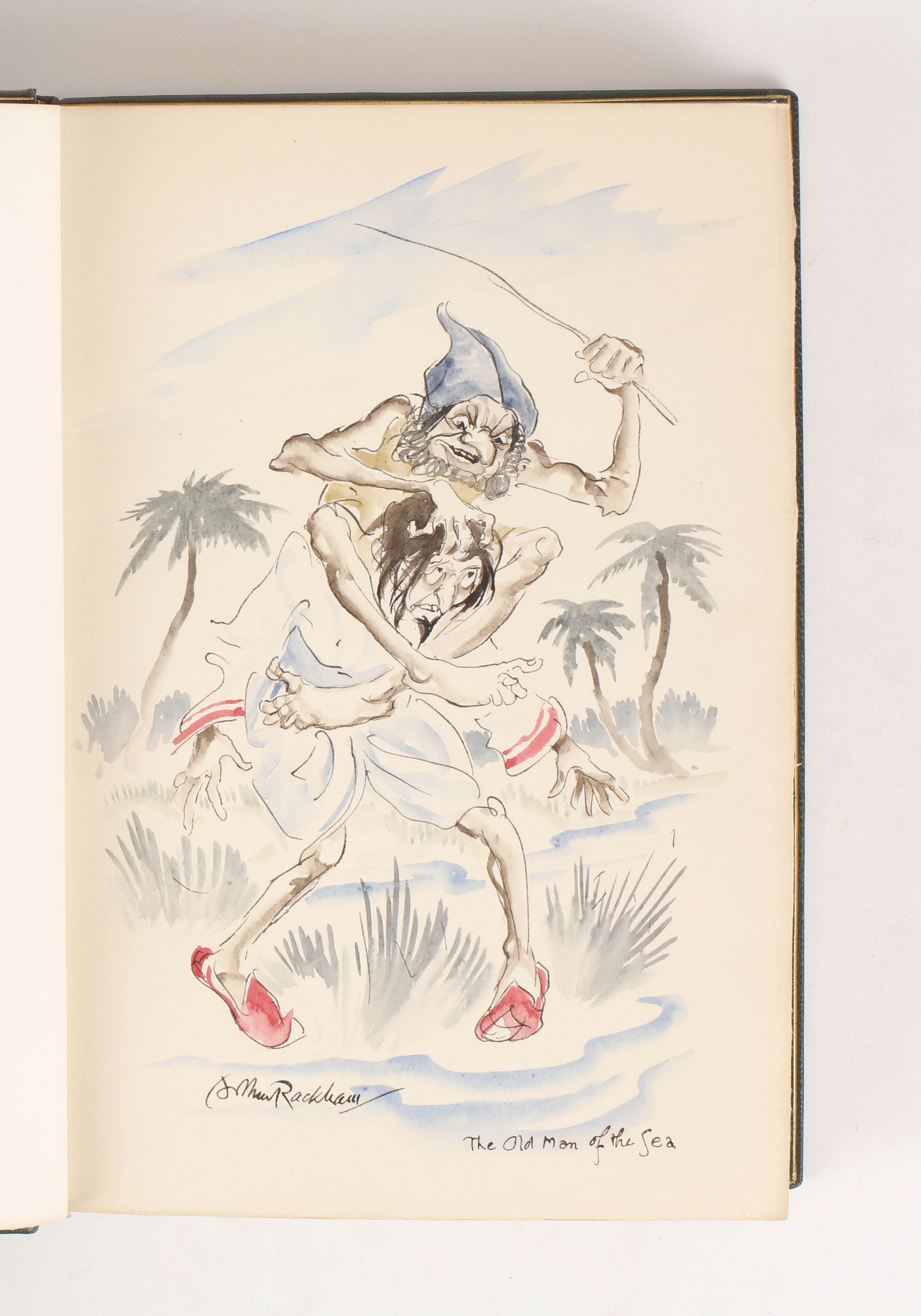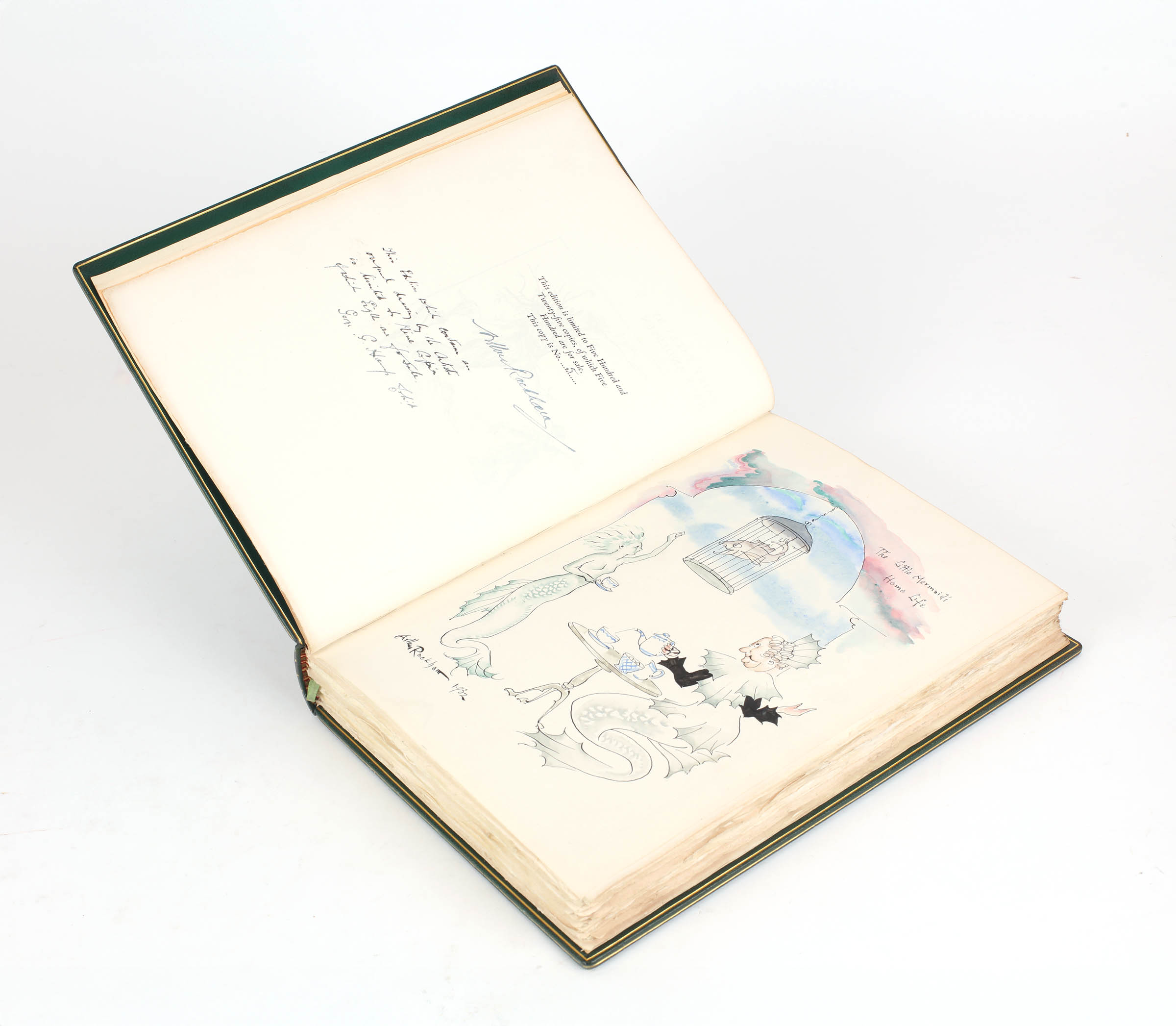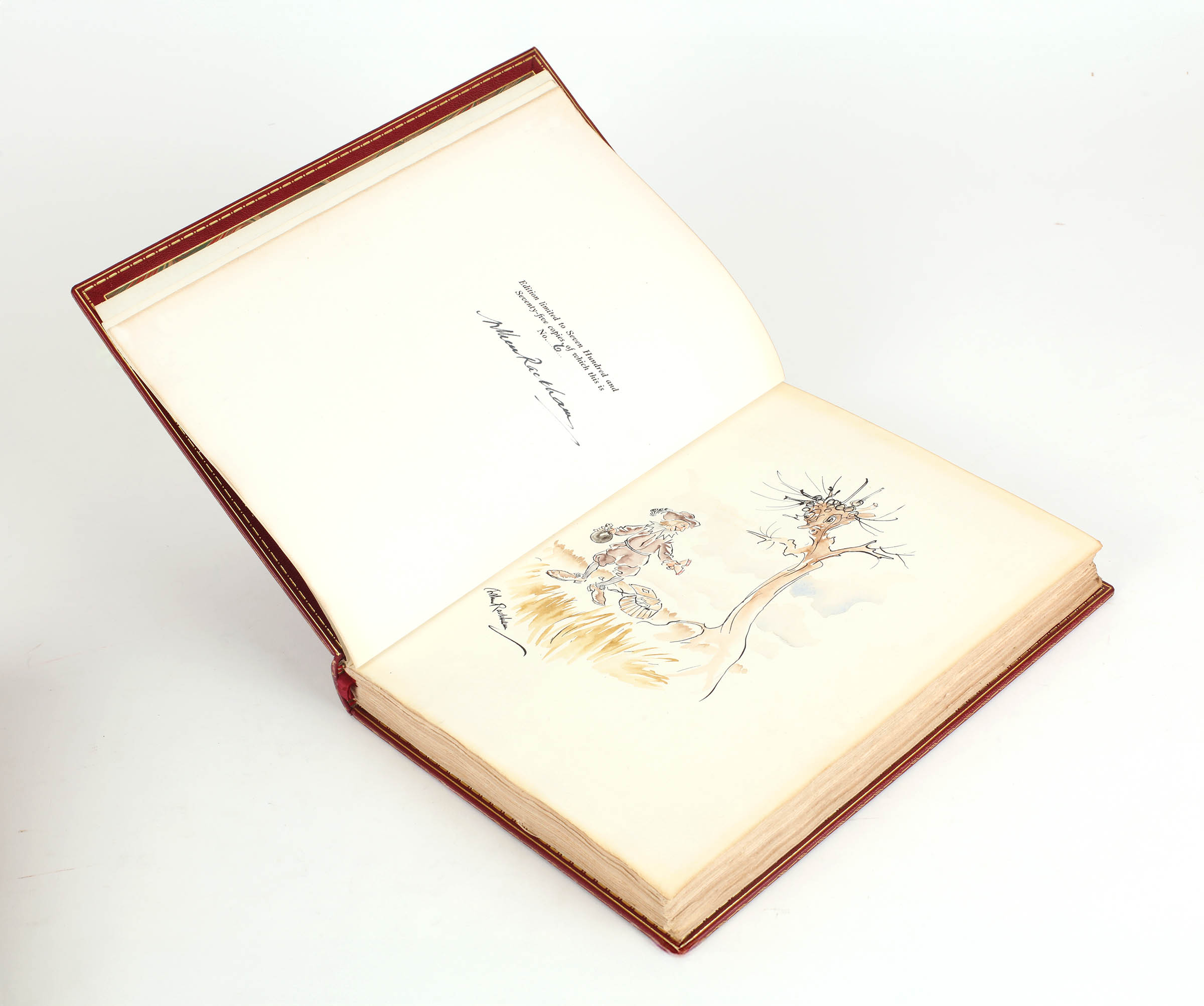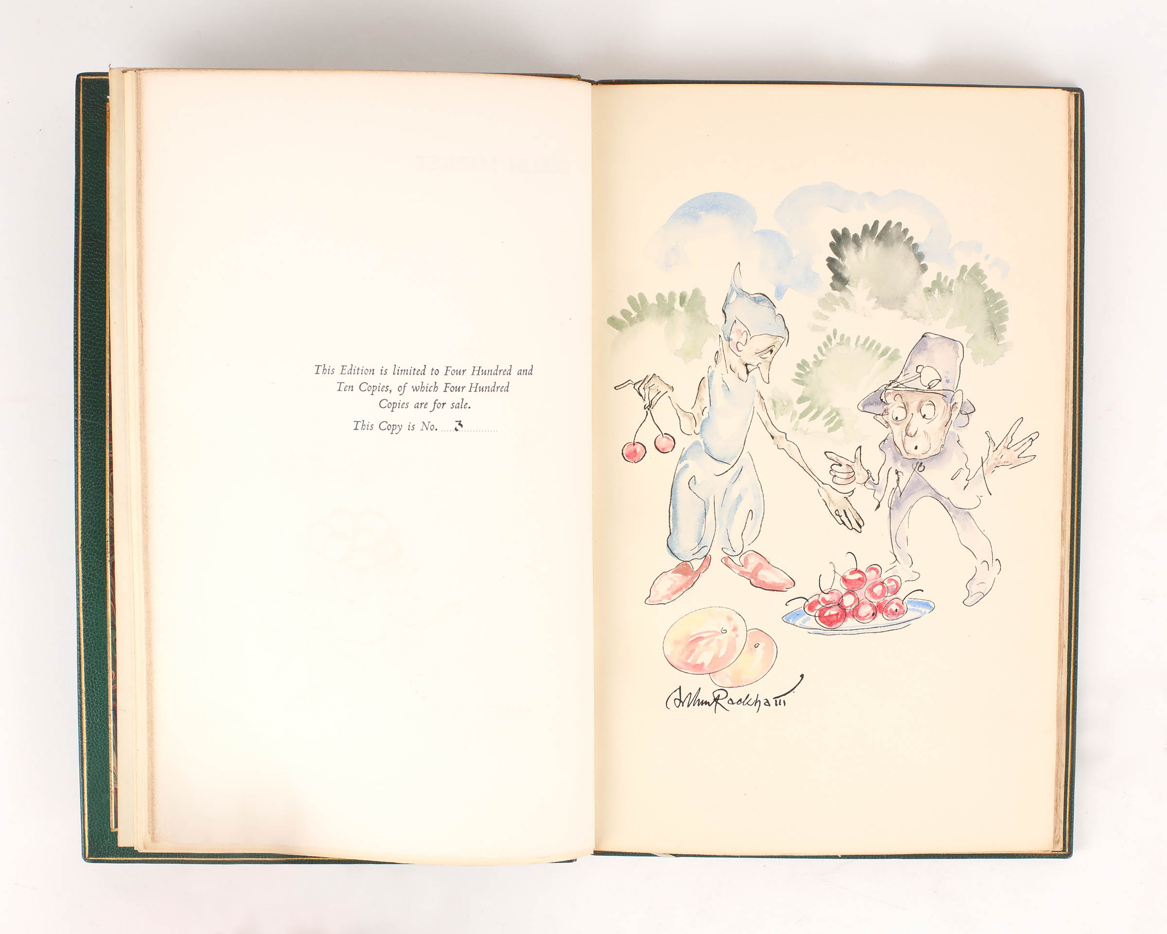 Having established himself as the major force in early twentieth century book illustration, through his work for William Heinemann from 1905, Arthur Rackham moved his allegiance to Harrap in the late 1920s, wooed by George Harrap's enthusiastic vision for the future of what he termed 'The Book Beautiful'. By 1928, Harrap was Rackham's primary publisher and sought to recreate the lavish gift book for the pre-war era. As an artist, Rackham had added small drawings to his presentation inscriptions in his works to family members and friends and for a long time. As his popularity grew, he undertook occasional commissions from buyers of books to embellish their deluxe editions with full page original watercolours. Harrap, seeing this, sought to place the concept on a commercial footing and, starting with The Compleat Angler in 1931, reserved the numbers one to nine (ten in the case of The Compleat Angler) of the deluxe edition to be sumptuously bound by Sangorski & Suttcliffe, described at the time as "Rolls Royce of bookbinding", and each containing a different original watercolour by Rackham. This practice continued for the remaining seven books illustrated by Rackham to be published by Harrap, thus creating "the ultimate gift book for the final major English commissions to Rackham's work." - Richard Riall (A New Bibliography of Arthur Rackham)