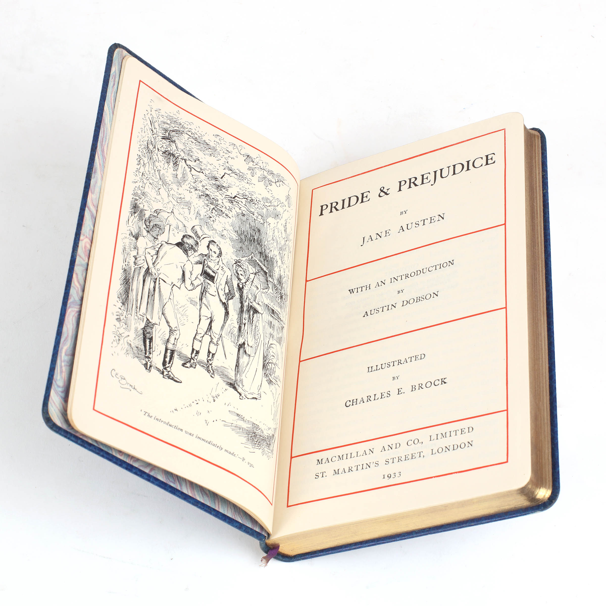 Pocket edition in a special publisher's deluxe binding. Limp blue morocco binding with gilt monogram to upper cover and gilt titles and design on the spine, all edges gilt. Housed in a blue card slipcase. Illustrated in black and white by Charles E. Brock. Marbled endpapers. A near fine copy, with a slightly faded to spine and with a contemporary ownership inscription, in a very good slipcase.