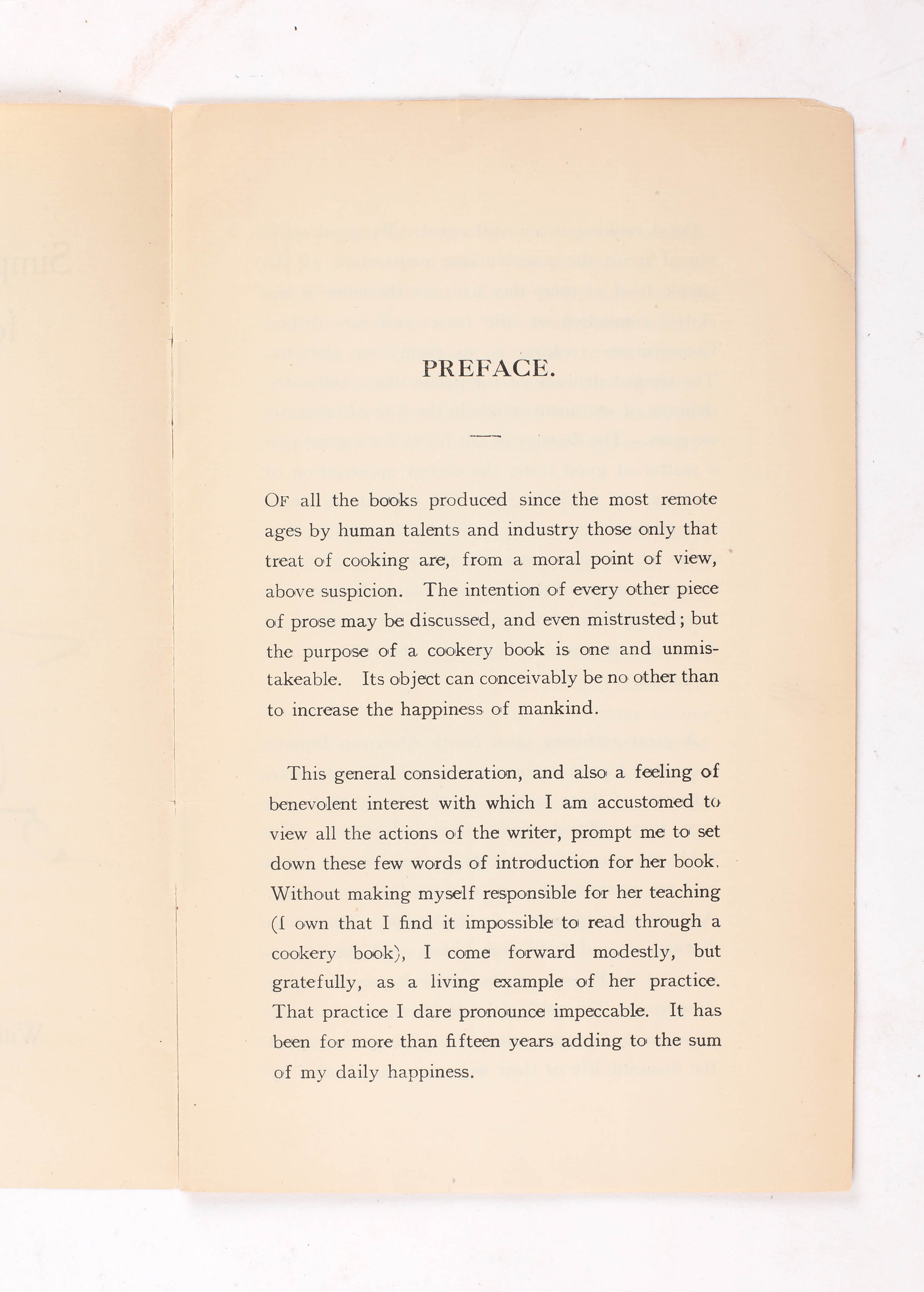 The preface only to "A Handbook of Cookery for a Small House" by Jessie Conrad, subsequently published in 1923