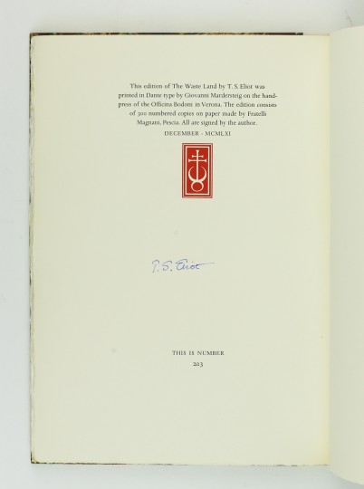 First edition thus. Number 203 of 300 copies hand printed in Verona by Giovanni Mardersteig at the Officina Bodoni and signed by Eliot. Original quarter vellum over marbled boards, top edge gilt, in publisher's marbled card slipcase. A fine copy. The slipcase shows some wear and lacks the bottom edge. A fine piece of book production.