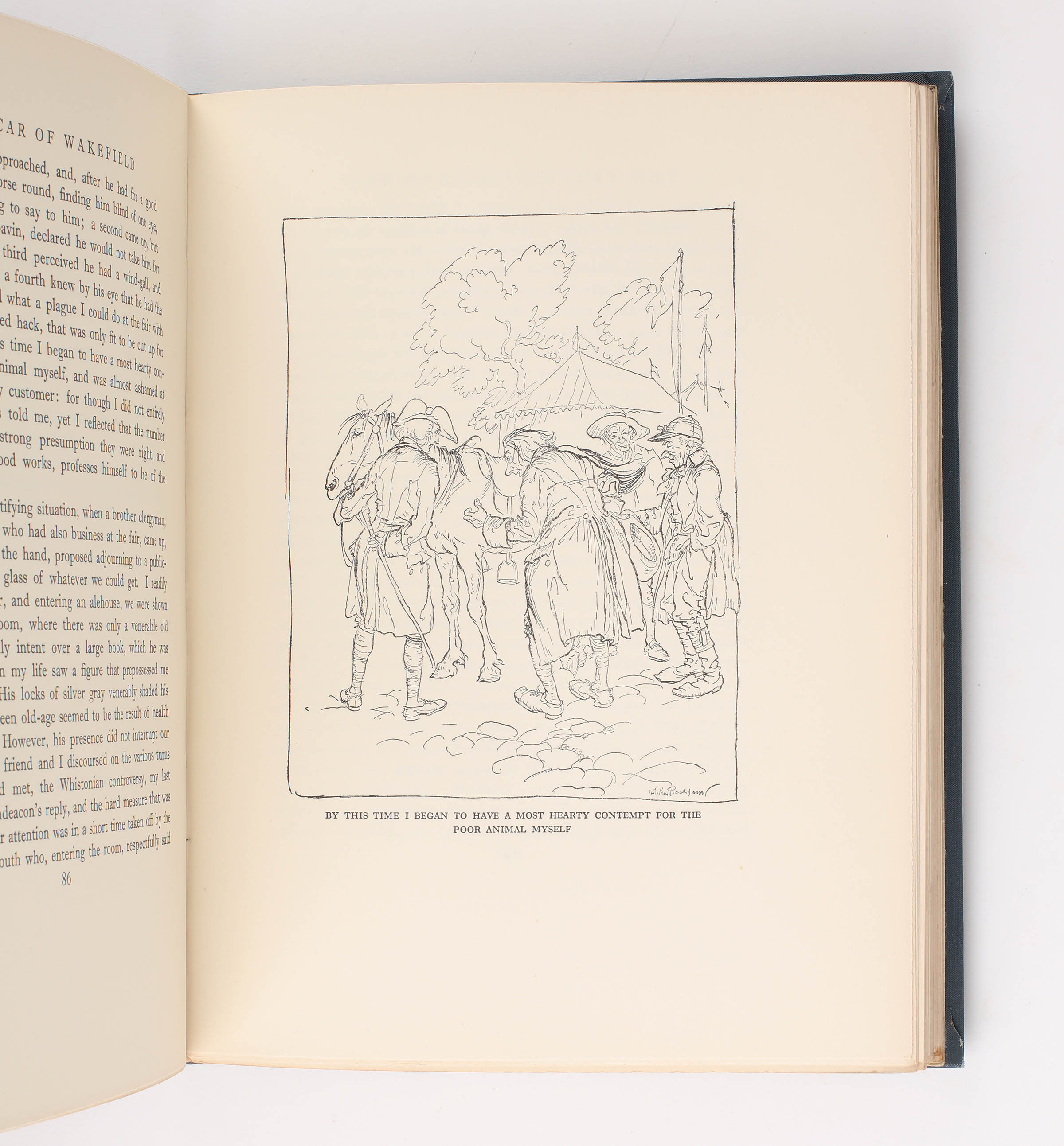 First edition illustrated by Rackham. 4to. Blue/ grey cloth with lettering and vignettes in gilt. Top edge gilt. Original sketch to the verso of the half title, covering half the page and showing the eponymous vicar selling his horse. Inscribed to Rackham's brother and sister in law "To Robert + Awdry / from / Edyth + Arthur Rackham / Christmas 1929". Pictorial silhouette endpapers. Twelve colour plates and many line drawings in the text. A fine copy with a witty sketch.