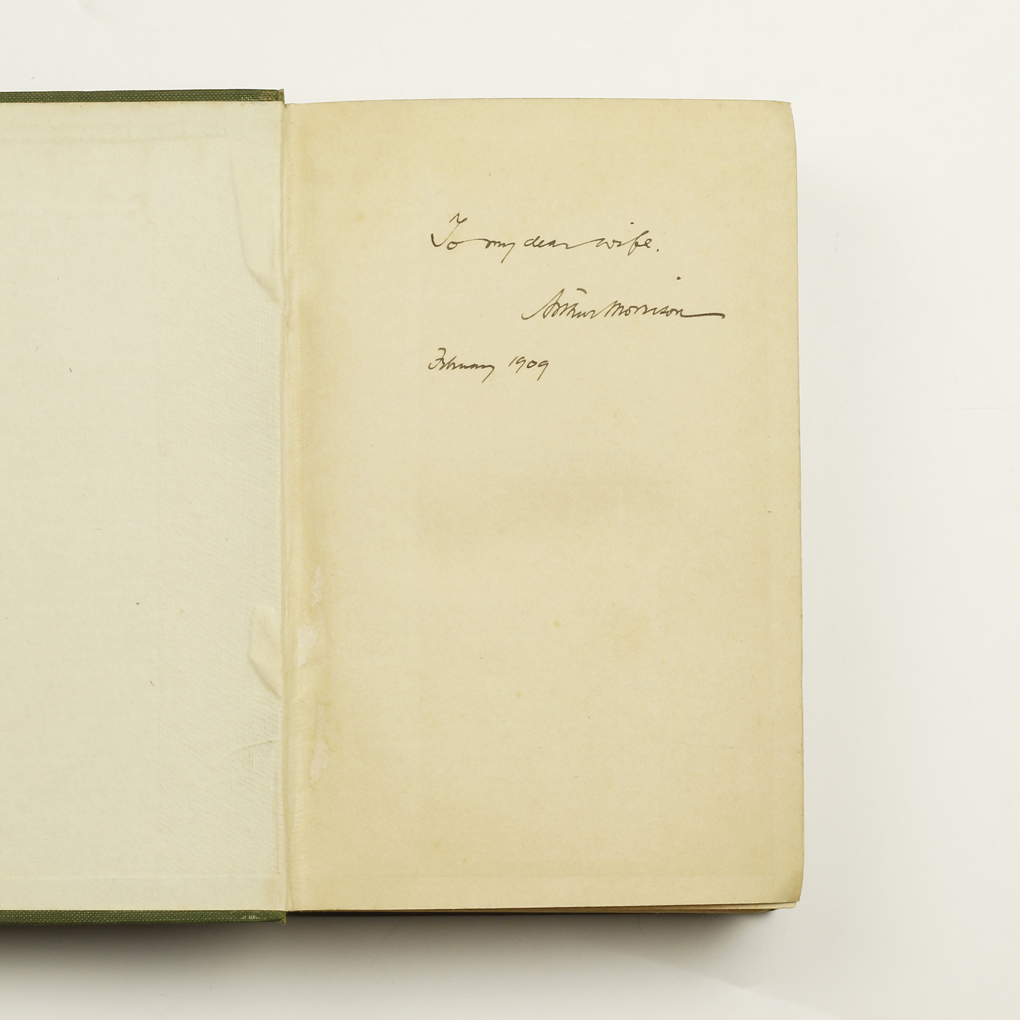 First edition. Original green cloth, lettered in gilt to spine and upper cover. Author's presentation copy, inscribed by the author to his wife, "To my dear wife / Arthur Morrison / February 1909" A very good copy with spine slightly faded and worn.