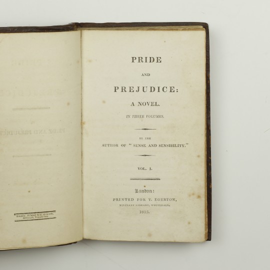 First edition. 12mo. Three volumes, bound in contemporary brown speckled calf. Green morocco title labels and gilt rules to the spine. "Charleton" embossed in gilt to upper board of each volume. Half titles present in each volume. A tall copy with each volume neatly rebacked, retaining most of the original spines with repairs to the joints and corners. Internally clean with occasional minor marks or foxing and a couple of marginal closed tears to leaves in volume III. Bookplate to the verso of each front endpaper. A very good example of Austen's most popular novel, now rarely encountered in a contemporary binding.