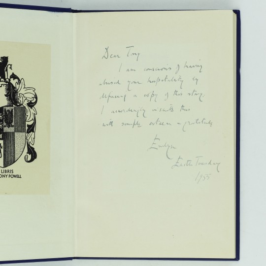 Two copies, both first editions, both in original blue cloth with (supplied) pictorial dustwrappers. Both presentation copies, inscribed by the author to Anthony Powell. The first, in blue biro, in a scrawling hand, "For Tony, the host of Bats with deep respect from Evelyn" with a half page caricature drawing by the author, of a woman with curly hair and a veil and a man (self portrait?) in evening dress.The second copy is inscribed, conservatively and somewhat sheepishly, "Dear Tony, I am conscious of having abused your hospitality by defacing a copy of this story. I accordingly inscribe this with simple esteem & gratitude. Evelyn Earth Tuesday 1955."Both books with Powell's bookplate to the front pastedowns. Both copies near fine with slightly dulled spine lettering in very good dustwrappers indeed.