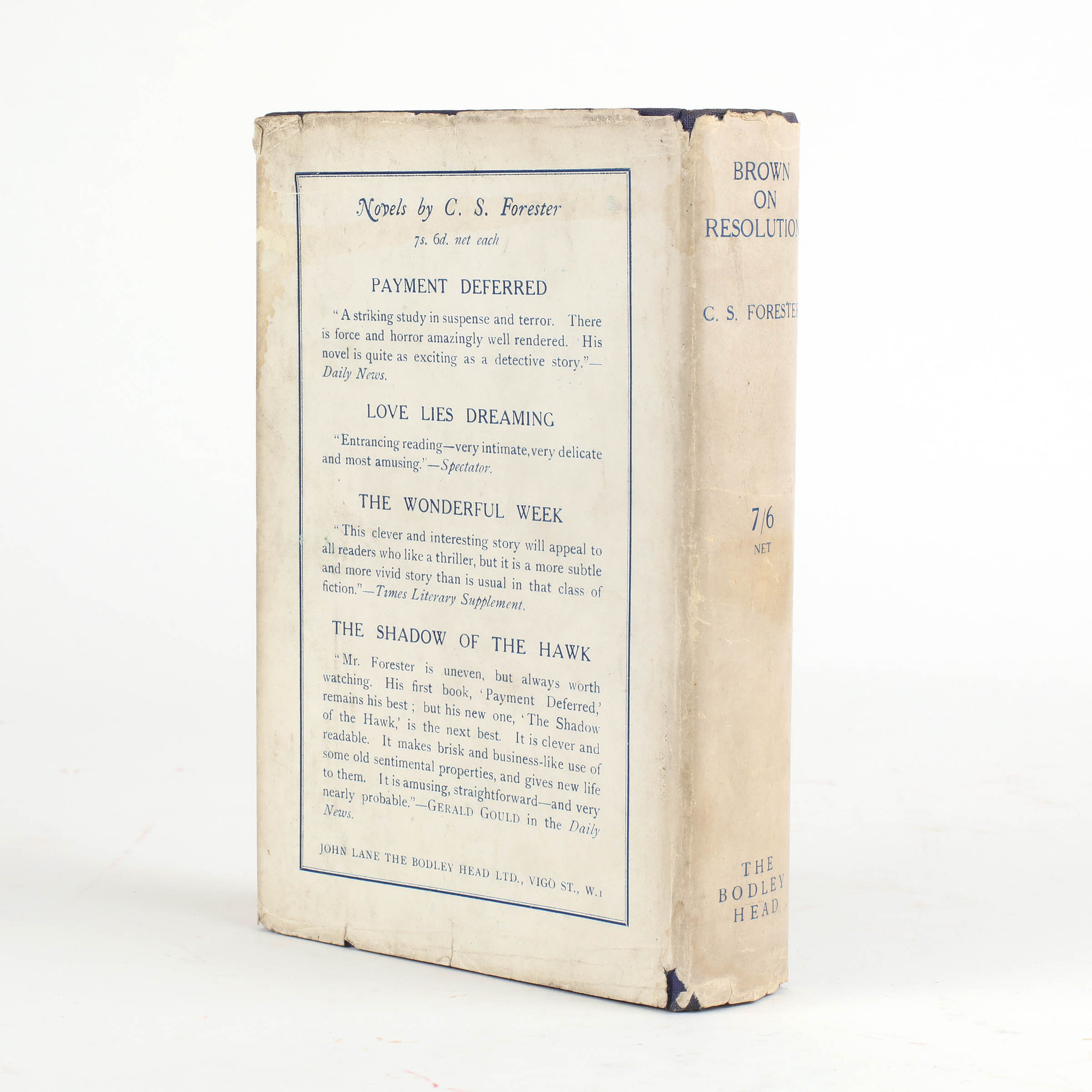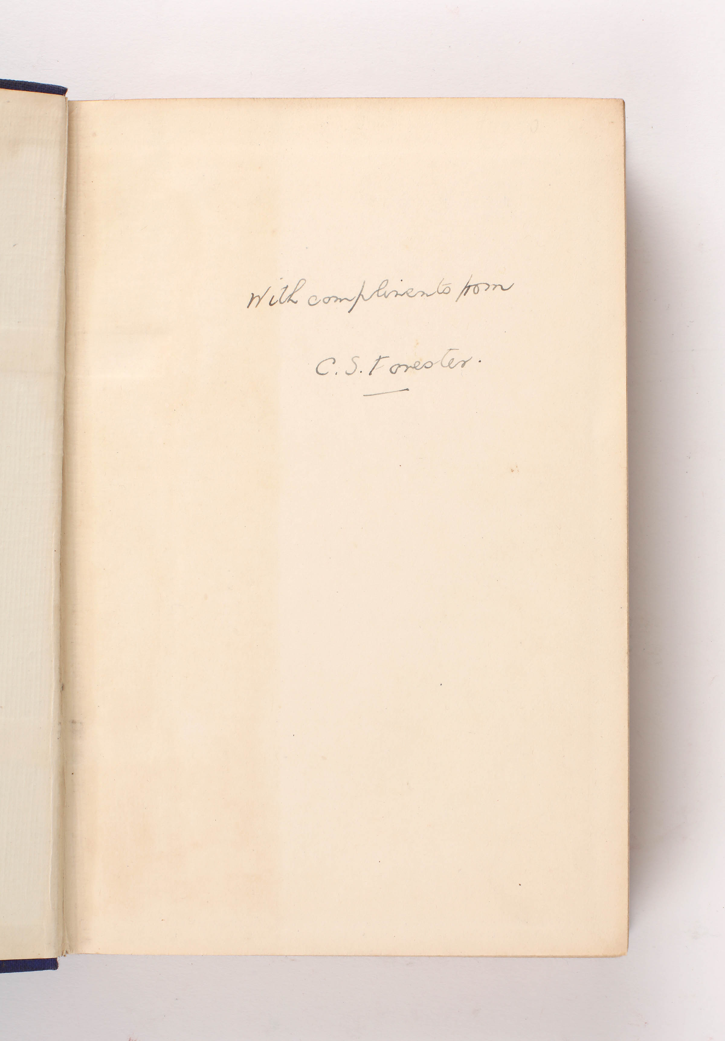 First edition. Blue cloth lettered in yellow, in the rare pictorial dustwrapper. INSCRIBED on the front free endpaper by Forester, "with compliments from C. S. Forester." A very good copy indeed, slight spotting to fore edges. In a very good dustwrapper, which has a full colour image to the upper panel. There are small nicks to the corners and a hole (1cm x 0.5cm) to the upper spine. No lettering is lost and overall this is a most attractive copy of this very scarce early novel.