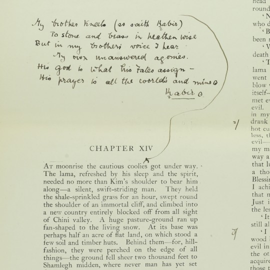 In light of the present set of proofs, it becomes clear that the Houghton proofs are comparatively lightly corrected, and that the first American edition was in effect rushed into print before Kipling had made his final corrections. These proofs demonstrate that Kipling continued to work on his retained copy of the same August 1900 galleys, making corrections that were incorporated into the text of the first English edition, which was registered for copyright by Macmillan and Co. on 17 October 1901, and then in turn used for the second American edition, published days later by Doubleday on 23 October. The most noticeable change is that the first American edition carried only the verse chapter headings for chapters VIII and XIII, whereas they were present for all chapters in both the English serial issue and the first English edition, but there are many other changes, especially in the chapters V to X.