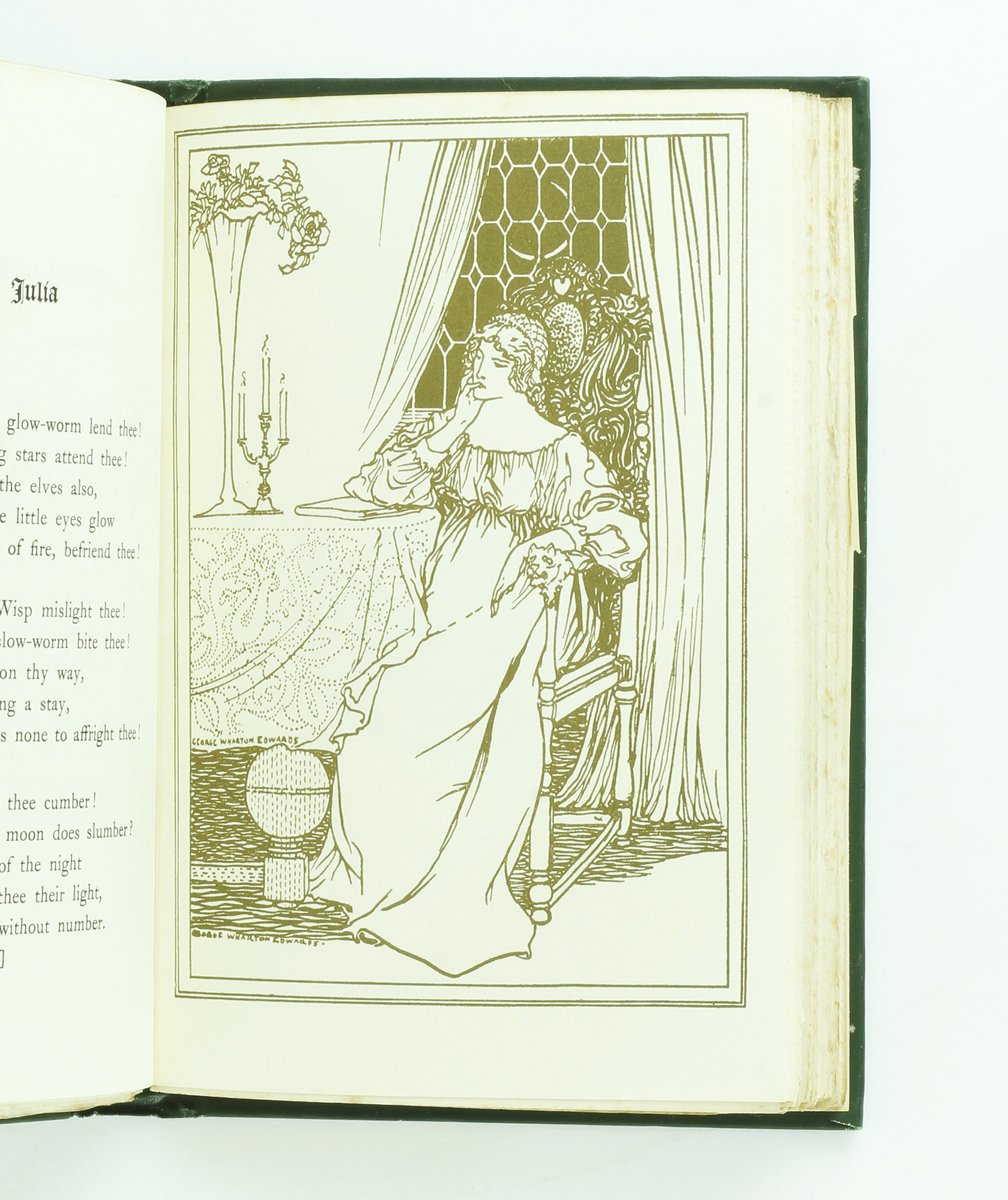 First edition. 8vo. Green cloth embossed with elaborate gilt decoration to the upper cover. Decorative initial in red. Top edge gilt. Handmade paper. Thirty full page line drawings and decorative head pieces by George Wharton Edwards. A fine copy. Loosely inserted is the original publisher's advertising prospectus.